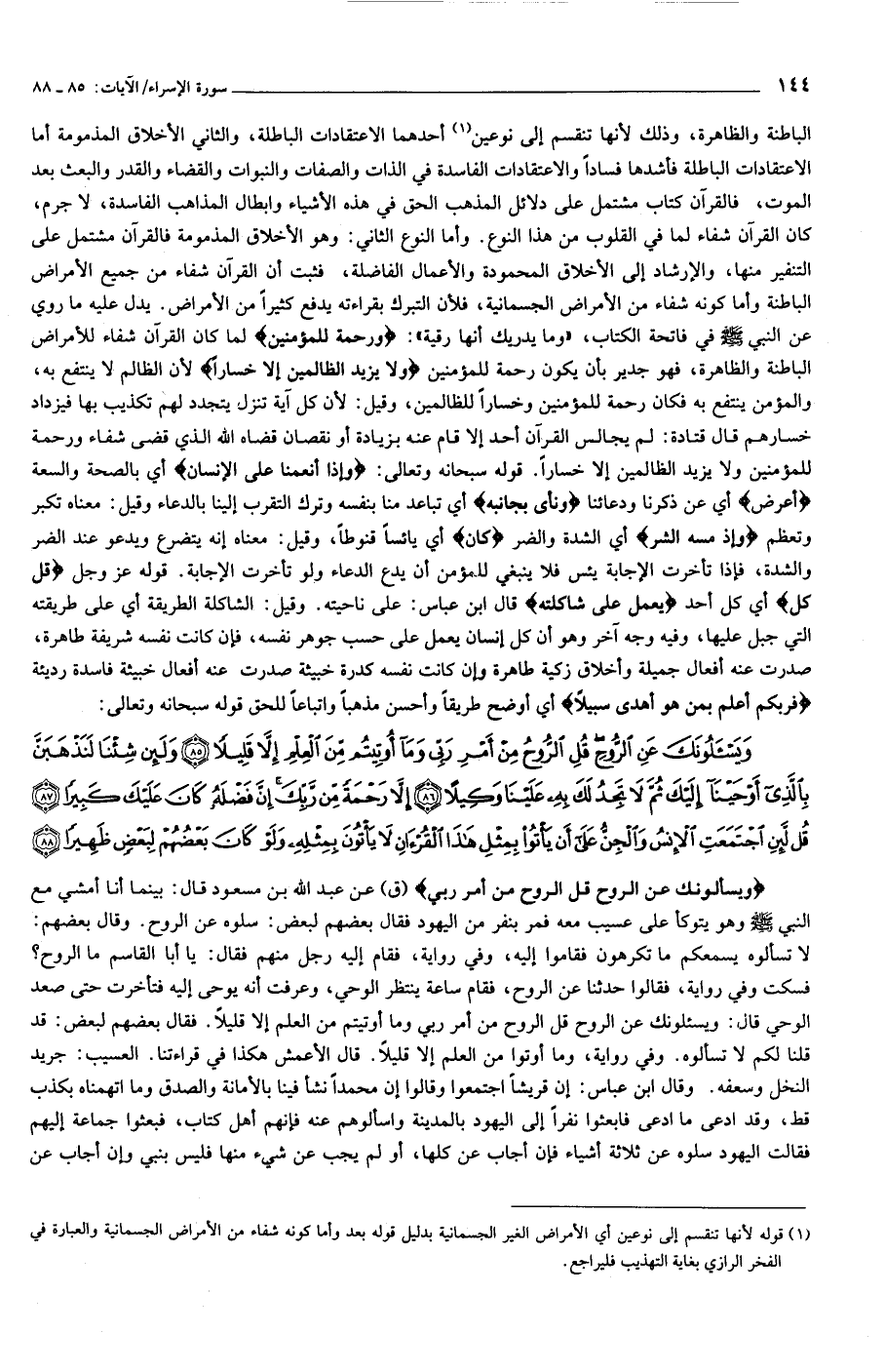 وَيَسْئَلُونَكَ عَنِ الرُّوحِ قُلِ الرُّوحُ مِنْ أَمْرِ رَبِّي (ق) عن عبد الله بن مسعود قال: بينما أنا أمشي مع النبي صلّى الله عليه وسلّم وهو يتوكأ على عسيب معه فمر بنفر من اليهود فقال بعضهم لبعض: سلوه عن الروح. وقال بعضهم: