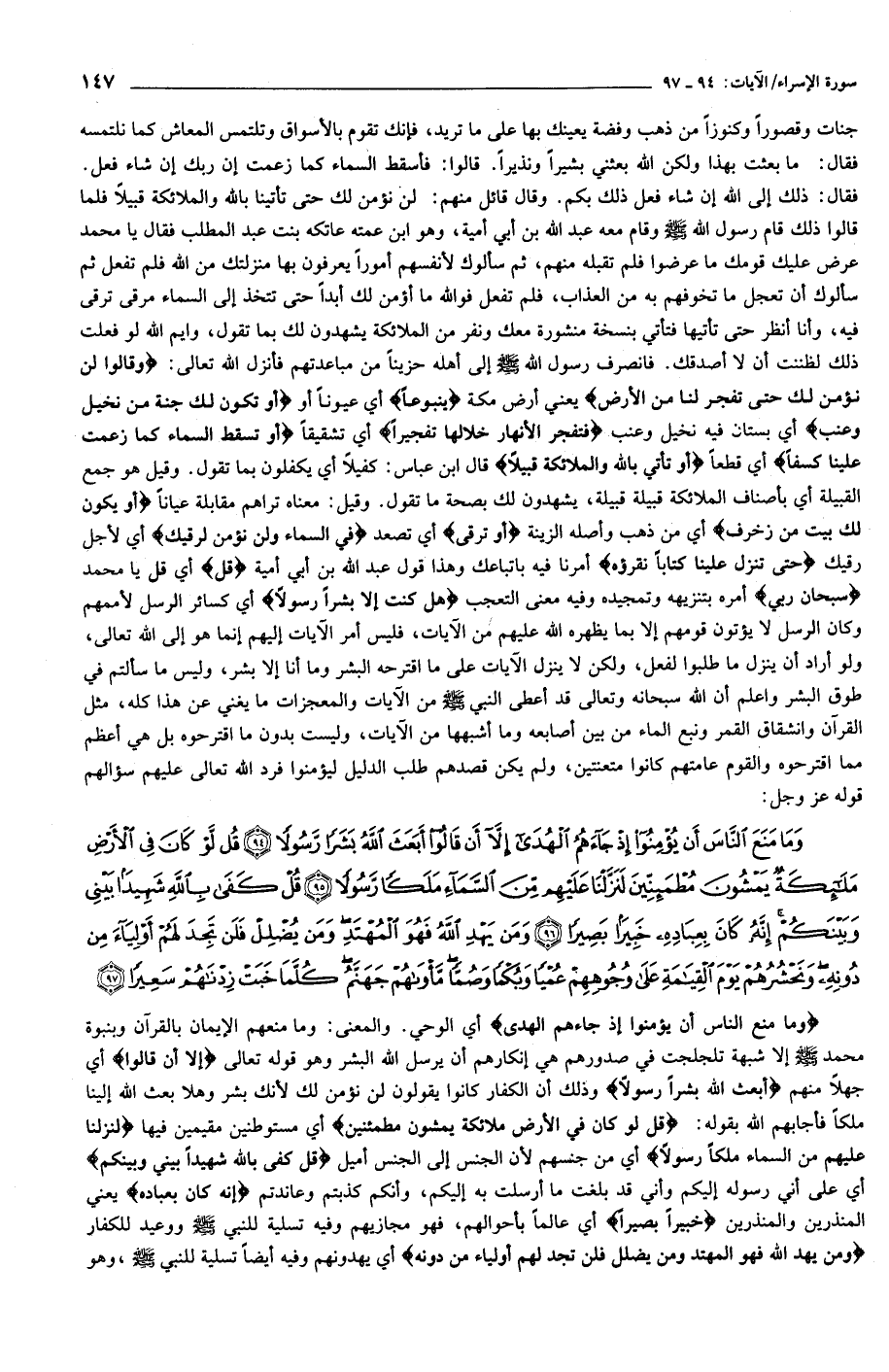 وَما مَنَعَ النَّاسَ أَنْ يُؤْمِنُوا إِذْ جاءَهُمُ الْهُدى إِلاَّ أَنْ قالُوا أَبَعَثَ اللَّهُ بَشَراً رَسُولاً (94) قُلْ لَوْ كانَ فِي الْأَرْضِ مَلائِكَةٌ يَمْشُونَ مُطْمَئِنِّينَ لَنَزَّلْنا عَلَيْهِمْ مِنَ السَّماءِ مَلَكاً رَسُولاً (95) قُلْ كَفى بِاللَّهِ شَهِيداً بَيْنِي وَبَيْنَكُمْ إِنَّهُ كانَ بِعِبادِهِ خَبِيراً بَصِيراً (96) وَمَنْ يَهْدِ اللَّهُ فَهُوَ الْمُهْتَدِ وَمَنْ يُضْلِلْ فَلَنْ تَجِدَ لَهُمْ أَوْلِياءَ مِنْ دُونِهِ وَنَحْشُرُهُمْ يَوْمَ الْقِيامَةِ عَلى وُجُوهِهِمْ عُمْياً وَبُكْماً وَصُمًّا مَأْواهُمْ جَهَنَّمُ كُلَّما خَبَتْ زِدْناهُمْ سَعِيراً (97)