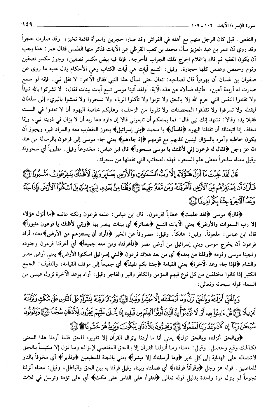 قالَ موسى لَقَدْ عَلِمْتَ خطابا لفرعون. قال ابن عباس: علمه فرعون ولكنه عانده ما أَنْزَلَ هؤُلاءِ إِلَّا رَبُّ السَّماواتِ وَالْأَرْضِ يعني الآيات التسع بَصائِرَ أي بينات يبصر بها وَإِنِّي لَأَظُنُّكَ يا فِرْعَوْنُ مَثْبُوراً قال ابن عباس: ملعونا. وقيل: هالكا. وقيل: مصروفا عن الخير فَأَرادَ أَنْ يَسْتَفِزَّهُمْ مِنَ الْأَرْضِ معناه أراد فرعون أن يخرج موسى وبني إسرائيل من أرض مصر فَأَغْرَقْناهُ وَمَنْ مَعَهُ جَمِيعاً أي أغرقنا فرعون وجنوده ونجينا موسى وقومه وَقُلْنا مِنْ بَعْدِهِ أي من بعد هلاك فرعون لِبَنِي إِسْرائِيلَ اسْكُنُوا الْأَرْضَ يعني أرض مصر والشام فَإِذا جاءَ وَعْدُ الْآخِرَةِ يعني القيامة جِئْنا بِكُمْ لَفِيفاً أي جميعا إلى موقف القيامة، واللفيف: الجمع الكثير إذا كانوا مختلفين من كل نوع فيهم المؤمن والكافر والبر والفاجر وقيل: أراد بوعد الآخرة نزول عيسى من السماء قوله سبحانه وتعالى: