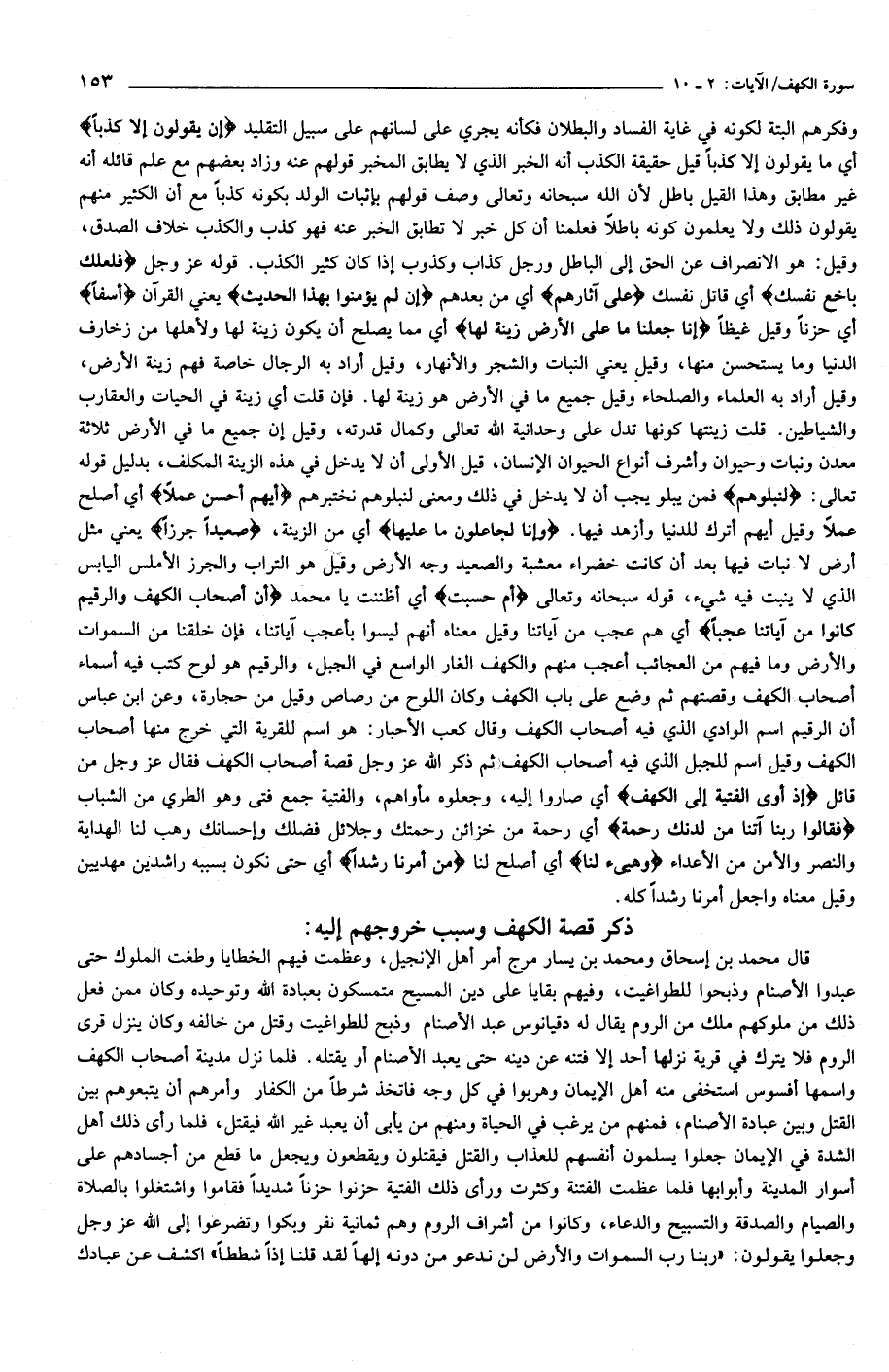 وفكرهم البتة لكونه في غاية الفساد والبطلان فكأنه يجري على لسانهم على سبيل التقليد إِنْ يَقُولُونَ إِلَّا كَذِباً أي ما يقولون إلا كذبا قيل حقيقة الكذب أنه الخبر الذي لا يطابق المخبر قولهم عنه وزاد بعضهم مع علم قائله أنه غير مطابق وهذا القيل باطل لأن الله سبحانه وتعالى وصف قولهم بإثبات الولد بكونه كذبا مع أن الكثير منهم يقولون ذلك ولا يعلمون كونه باطلا فعلمنا أن كل خبر لا تطابق الخبر عنه فهو كذب والكذب خلاف الصدق، وقيل: هو الانصراف عن الحق إلى الباطل ورجل كذاب وكذوب إذا كان كثير الكذب. قوله عز وجل فَلَعَلَّكَ باخِعٌ نَفْسَكَ أي قاتل نفسك عَلى آثارِهِمْ أي من بعدهم إِنْ لَمْ يُؤْمِنُوا بِهذَا الْحَدِيثِ يعني القرآن أَسَفاً أي حزنا وقيل غيظا إِنَّا جَعَلْنا ما عَلَى الْأَرْضِ زِينَةً لَها أي مما يصلح أن يكون زينة لها ولأهلها من زخارف الدنيا وما يستحسن منها، وقيل يعني النبات والشجر والأنهار، وقيل أراد به الرجال خاصة فهم زينة الأرض، وقيل أراد به العلماء والصلحاء وقيل جميع ما في الأرض هو زينة لها. فإن قلت أي زينة في الحيات والعقارب والشياطين. قلت زينتها كونها تدل على وحدانية الله تعالى وكمال قدرته، وقيل إن جميع ما في الأرض ثلاثة معدن ونبات وحيوان وأشرف أنواع الحيوان الإنسان، قيل الأولى أن لا يدخل في هذه الزينة المكلف، بدليل قوله تعالى: لِنَبْلُوَهُمْ فمن يبلو يجب أن لا يدخل في ذلك ومعنى لنبلوهم نختبرهم أَيُّهُمْ أَحْسَنُ عَمَلًا أي أصلح عملا وقيل أيهم أترك للدنيا وأزهد فيها. وَإِنَّا لَجاعِلُونَ ما عَلَيْها أي من الزينة، صَعِيداً جُرُزاً يعني مثل أرض لا نبات فيها بعد أن كانت خضراء معشبة والصعيد وجه الأرض وقيل هو التراب والجرز الأملس اليابس الذي لا ينبت فيه شيء، قوله سبحانه وتعالى أَمْ حَسِبْتَ أي أظننت يا محمد أَنَّ أَصْحابَ الْكَهْفِ وَالرَّقِيمِ كانُوا مِنْ آياتِنا عَجَباً أي هم عجب من آياتنا وقيل معناه أنهم ليسوا بأعجب آياتنا، فإن خلقنا من السموات والأرض وما فيهم من العجائب أعجب منهم والكهف الغار الواسع في الجبل، والرقيم هو لوح كتب فيه أسماء أصحاب الكهف وقصتهم ثم وضع على باب الكهف وكان اللوح من رصاص وقيل من حجارة، وعن ابن عباس أن الرقيم اسم الوادي الذي فيه أصحاب الكهف وقال كعب الأحبار: هو اسم للقرية التي خرج منها أصحاب الكهف وقيل اسم للجبل الذي فيه أصحاب الكهف ثم ذكر الله عز وجل قصة أصحاب الكهف فقال عز وجل من قائل إِذْ أَوَى الْفِتْيَةُ إِلَى الْكَهْفِ أي صاروا إليه، وجعلوه مأواهم، والفتية جمع فتى وهو الطري من الشباب فَقالُوا رَبَّنا آتِنا مِنْ لَدُنْكَ رَحْمَةً أي رحمة من خزائن رحمتك وجلائل فضلك وإحسانك وهب لنا الهداية والنصر والأمن من الأعداء وَهَيِّئْ لَنا أي أصلح لنا مِنْ أَمْرِنا رَشَداً أي حتى نكون بسببه راشدين مهديين وقيل معناه واجعل أمرنا رشدا كله.
