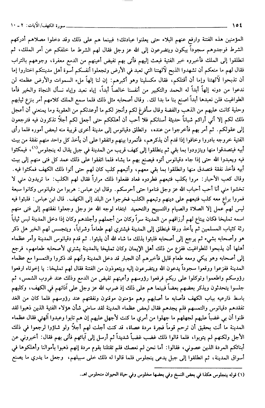 المؤمنين هذه الفتنة وارفع عنهم البلاء حتى يعلنوا عبادتك فبينما هم على ذلك وقد دخلوا مصلاهم أدركهم الشرط فوجدوهم سجودا يبكون ويتضرعون إلى الله عز وجل فقال لهم الشرط ما خلفكم عن أمر الملك، ثم انطلقوا إلى الملك فأخبروه خبر الفتية فبعث إليهم فأتى بهم تفيض أعينهم من الدمع معفرة، وجوههم بالتراب فقال لهم ما منعكم أن تشهدوا الذبح لآلهتنا التي تعبد في الأرض وتجعلوا أنفسكم أسوة أهل مدينتكم اختاروا إما أن تذبحوا لآلهتنا وإما أن أقتلكم، فقال مكسلينا وهو أكبرهم: إن لنا إلها ملء السموات والأرض عظمته لن ندعوا من دونه إلها أبدا له الحمد والتكبير من أنفسنا خالصا أبدا، إياه نعبد وإياه نسأل النجاة والخير فأما الطواغيت فلن نعبدها أبدا اصنع بنا ما بدا لك. وقال أصحابه مثل ذلك فلما سمع الملك كلامهم أمر بنزع ثيابهم وحلية كانت عليهم من الذهب والفضة وقال سأفرغ لكم وأنجز لكم ما أوعدتكم من العقوبة وما يمنعني أن أعجل ذلك لكم إلا أني أراكم شبانا حديثة أسنانكم فلا أحب أن أهلككم حتى أجعل لكم أجلا تذكرون فيه فترجعون إلى عقولكم. ثم أمر بهم فأخرجوا من عنده، وانطلق دقيانوس إلى مدينة أخرى قريبة منه لبعض أموره فلما رأى الفتية خروجه بادروا وخافوا إذا قدم أن يذكرهم، فأتمروا بينهم واتفقوا على أن يأخذ كل واحد منهم نفقة من بيت أبيه فيتصدقوا منها ويتزودوا بما بقي ثم ينطلقوا إلى كهف قريب من المدينة في جبل يقال له ينجلوس «1»، فيمكثوا فيه ويعبدوا الله حتى إذا جاء دقيانوس أتوه فيصنع بهم ما يشاء فلما اتفقوا على ذلك عمد كل فتى منهم إلى بيت أبيه فأخذ نفقة فتصدق منها وانطلقوا بما بقي معهم، وأتبعهم كلب كان لهم حتى أتوا ذلك الكهف فمكثوا فيه.