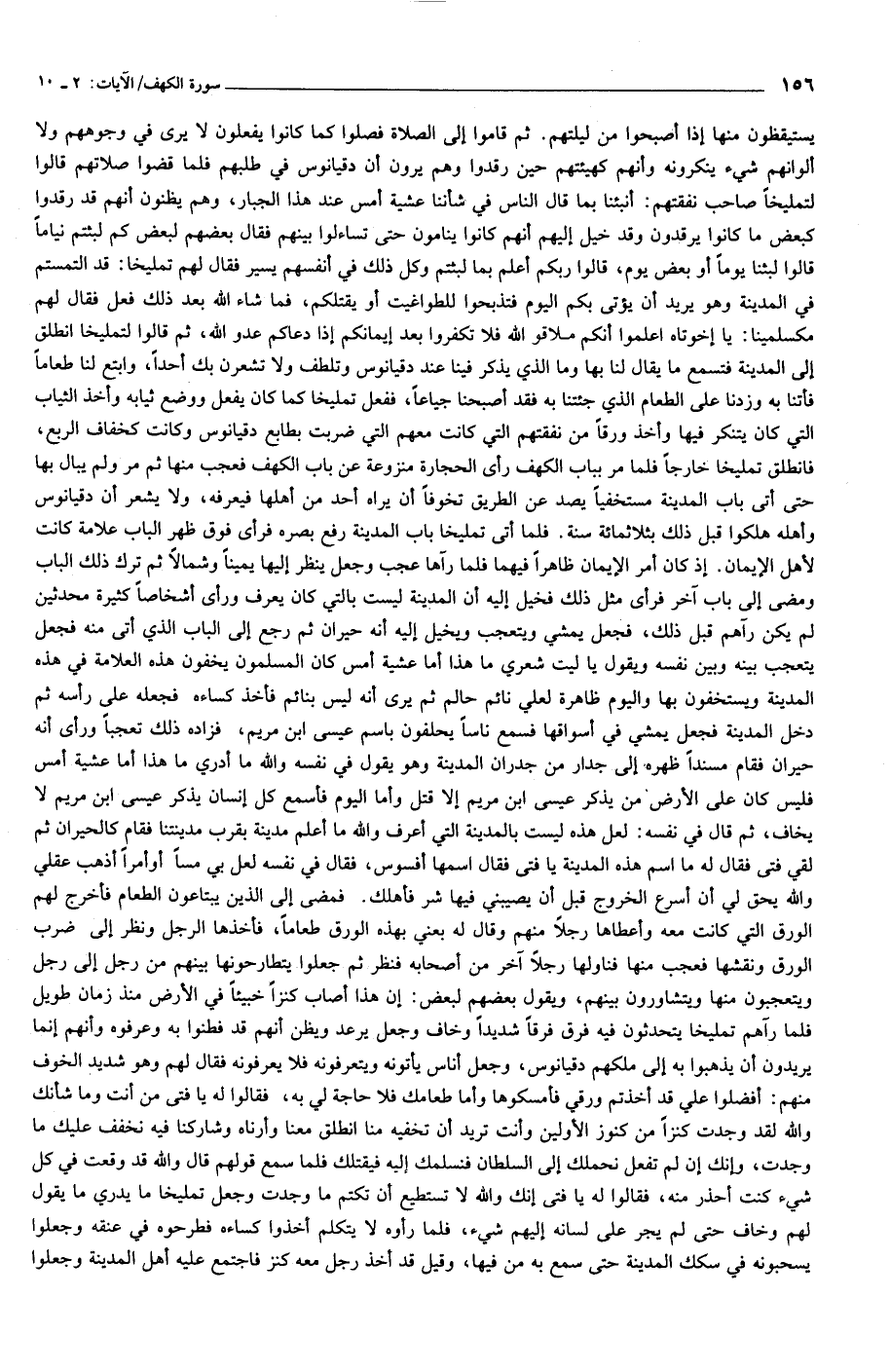 ولا ألوانهم شيء ينكرونه وأنهم كهيئتهم حين رقدوا وهم يرون أن دقيانوس في طلبهم فلما قضوا صلاتهم قالوا لتمليخا صاحب نفقتهم: أنبئنا بما قال الناس في شأننا عشية أمس عند هذا الجبار، وهم يظنون أنهم قد رقدوا كبعض ما كانوا يرقدون وقد خيل إليهم أنهم كانوا ينامون حتى تساءلوا بينهم فقال بعضهم لبعض كم لبثتم نياما قالوا لبثنا يوما أو بعض يوم، قالوا ربكم أعلم بما لبثتم وكل ذلك في أنفسهم يسير فقال لهم تمليخا: قد التمستم في المدينة وهو يريد أن يؤتى بكم اليوم فتذبحوا للطواغيت أو يقتلكم، فما شاء الله بعد ذلك فعل فقال لهم مكسلمينا: يا إخوتاه اعلموا أنكم ملاقو الله فلا تكفروا بعد إيمانكم إذا دعاكم عدو الله، ثم قالوا لتمليخا انطلق إلى المدينة فتسمع ما يقال لنا بها وما الذي يذكر فينا عند دقيانوس وتلطف ولا تشعرن بك أحدا، وابتع لنا طعاما فأتنا به وزدنا على الطعام الذي جئتنا به فقد أصبحنا جياعا، ففعل تمليخا كما كان يفعل ووضع ثيابه وأخذ الثياب التي كان يتنكر فيها وأخذ ورقا من نفقتهم التي كانت معهم التي ضربت بطابع دقيانوس وكانت كخفاف الربع، فانطلق تمليخا خارجا فلما مر بباب الكهف رأى الحجارة منزوعة عن باب الكهف فعجب منها ثم مر ولم يبال بها حتى أتى باب المدينة مستخفيا يصد عن الطريق تخوفا أن يراه أحد من أهلها فيعرفه، ولا يشعر أن دقيانوس وأهله هلكوا قبل ذلك بثلاثمائة سنة. فلما أتى تمليخا باب المدينة رفع بصره فرأى فوق ظهر الباب علامة كانت لأهل الإيمان. إذ كان أمر الإيمان ظاهرا فيهما فلما رآها عجب وجعل ينظر إليها يمينا وشمالا ثم ترك ذلك الباب ومضى إلى باب آخر فرأى مثل ذلك فخيل إليه أن المدينة ليست بالتي كان يعرف ورأى أشخاصا كثيرة محدثين لم يكن رآهم قبل ذلك، فجعل يمشي ويتعجب ويخيل إليه أنه حيران ثم رجع إلى الباب الذي أتى منه فجعل يتعجب بينه وبين نفسه ويقول يا ليت شعري ما هذا أما عشية أمس كان المسلمون يخفون هذه العلامة في هذه المدينة ويستخفون بها واليوم ظاهرة لعلي نائم حالم ثم يرى أنه ليس بنائم فأخذ كساءه فجعله على رأسه ثم دخل المدينة فجعل يمشي في أسواقها فسمع ناسا يحلفون باسم عيسى ابن مريم، فزاده ذلك تعجبا ورأى أنه حيران فقام مسندا ظهره إلى جدار من جدران المدينة وهو يقول في نفسه والله ما أدري ما هذا أما عشية أمس فليس كان على الأرض من يذكر عيسى ابن مريم إلا قتل وأما اليوم فأسمع كل إنسان يذكر عيسى ابن مريم لا يخاف، ثم قال في نفسه: لعل هذه ليست بالمدينة التي أعرف والله ما أعلم مدينة بقرب مدينتنا فقام كالحيران ثم لقي فتى فقال له ما اسم هذه المدينة يا فتى فقال اسمها أفسوس، فقال في نفسه لعل بي مسا أو أمرا أذهب عقلي والله يحق لي أن أسرع الخروج قبل أن يصيبني فيها شر فأهلك. فمضى إلى الذين يبتاعون الطعام فأخرج لهم الورق التي كانت معه وأعطاها رجلا منهم وقال له بعني بهذه الورق طعاما، فأخذها الرجل ونظر إلى ضرب الورق ونقشها فعجب منها فناولها رجلا آخر من أصحابه فنظر ثم جعلوا يتطارحونها بينهم من رجل إلى رجل ويتعجبون منها ويتشاورون بينهم، ويقول بعضهم لبعض: إن هذا أصاب كنزا خبيئا في الأرض منذ زمان طويل فلما رآهم تمليخا يتحدثون فيه فرق فرقا شديدا وخاف وجعل يرعد ويظن أنهم قد فطنوا به وعرفوه وأنهم إنما يريدون أن يذهبوا به إلى ملكهم دقيانوس، وجعل أناس يأتونه ويتعرفونه فلا يعرفونه فقال لهم وهو شديد الخوف منهم: أفضلوا علي قد أخذتم ورقي فأمسكوها وأما طعامك فلا حاجة لي به، فقالوا له يا فتى من أنت وما شأنك والله لقد وجدت كنزا من كنوز الأولين وأنت تريد أن تخفيه منا انطلق معنا وأرناه وشاركنا فيه نخفف عليك ما وجدت، وإنك إن لم تفعل نحملك إلى السلطان فنسلمك إليه فيقتلك فلما سمع قولهم قال والله قد وقعت في كل شيء كنت أحذر منه، فقالوا له يا فتى إنك والله لا تستطيع أن تكتم ما وجدت وجعل تمليخا ما يدري ما يقول لهم وخاف حتى لم يجر على لسانه إليهم شيء، فلما رأوه لا يتكلم