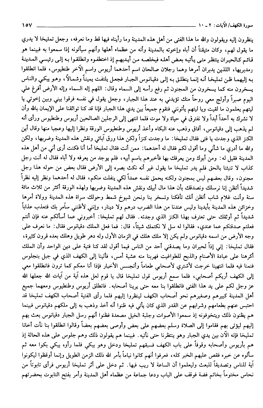 ينظرون إليه ويقولون والله ما هذا الفتى من أهل هذه المدينة وما رأيناه فيها قط وما نعرفه، وجعل تمليخا لا يدري ما يقول لهم، وكان متيقنا أن أباه وإخوته بالمدينة وأنه من عظماء أهلها وأنهم سيأتونه إذا سمعوا به فبينما هو قائم كالحيران ينتظر متى يأتيه بعض أهله فيخلصه من أيديهم إذ اختطفوه وانطلقوا به إلى رئيسي المدينة ومدبريها، اللذين يدبران أمرها وهما رجلان صالحان اسم أحدهما أريوس واسم الآخر طنطيوس، فلما انطلقوا به إليهما ظن تمليخا أنه إنما ينطلق به إلى دقيانوس الجبار فجعل يلتفت يمينا وشمالا، وهو يبكي والناس يسخرون منه كما يسخرون من المجنون ثم رفع رأسه إلى السماء وقال: اللهم إله السماء وإله الأرض أفرغ علي اليوم صبرا وأولج معي روحا منك تؤيدني به عند هذا الجبار، وجعل يقول في نفسه فرقوا بيني وبين إخوتي يا ليتهم يعلمون ما لقيت ويا ليتهم يأتونني فنقوم جميعا بين يدي هذا الجبار فإنا قد كنا تواثقنا على الإيمان بالله وأن لا نشرك به أحدا أبدا ولا نفترق في حياة ولا موت فلما انتهى إلى الرجلين الصالحين أريوس وطنطيوس ورأى أنه لم يذهب إلى دقيانوس، أفاق وذهب عنه البكاء وأخذ أريوس وطنطيوس الورقة ونظرا إليها وعجبا منها وقال أين الكنز الذي وجدت يا فتى فقال تمليخا: ما وجدت كنزا ولكن هذا ورق آبائي ونقش هذه المدينة وضربها، ولكن والله ما أدري ما شأني وما أقول لكم فقال له أحدهما: ممن أنت فقال تمليخا أما أنا فكنت أرى أني من أهل هذه المدينة فقيل له: ومن أبوك ومن يعرفك بها فأخبرهم باسم أبيه، فلم يوجد من يعرفه ولا أباه فقال له أنت رجل كذاب لا تنبئنا بالحق فلم يدر تمليخا ما يقول غير أنه نكث بصره إلى الأرض فقال بعض من حوله هذا رجل مجنون، وقال بعضهم ليس بمجنون ولكنه يحمق نفسه عمدا لكي ينفلت منكم، فقال له أحدهما ونظر إليه نظرا شديدا أتظن إنا نرسلك ونصدقك بأن هذا مال أبيك ونقش هذه المدينة وضربها ولهذه الورقة أكثر من ثلاث مائة سنة وأنت غلام شاب أتظن أنك تأفكنا وتسخر بنا ونحن شيوخ شمط وحولك سراة هذه المدينة وولاة أمرها وخزائن هذه المدينة بأيدينا وليس عندنا من هذا الضرب درهم ولا دينار، وإنني لأظنني سآمر بك فتعذب عذابا شديدا ثم أوثقك حتى تعترف بهذا الكنز الذي وجدته. فقال لهم تمليخا: أخبروني عما أسألكم عنه فإن أنتم فعلتم صدقتكم عما عندي، فقالوا له سل لا نكتمك شيئا، قال: فما فعل الملك دقيانوس فقال: ما نعرف على وجه الأرض من اسمه دقيانوس ولم يكن إلا ملك هلك في الزمان الأول وله دهر طويل وهلك بعده قرون كثيرة، فقال تمليخا: إني إذا لحيران وما يصدقني أحد من الناس فيما أقول لقد كنا فتية على دين الواحد وأن الملك أكرهنا على عبادة الأصنام والذبح للطواغيت فهربنا منه عشية أمس، فأتينا إلى الكهف الذي في جبل بنجلوس فنمنا فيه فلما انتهينا خرجت لأشتري لأصحابي طعاما وأتجسس الأخبار فإذا أنا معكم كما ترون فانطلقوا معي إلى الكهف أريكم أصحابي، فلما سمع أريوس قول تمليخا قال يا قوم لعل هذه آية من آيات الله جعلها الله عز وجل لكم على يد هذا الفتى فانطلقوا بنا معه حتى يرينا أصحابه. فانطلق أريوس وطنطيوس ومعهما جميع أهل المدينة كبيرهم وصغيرهم نحو أصحاب الكهف لينظروا إليهم فلما رأى الفتية أصحاب الكهف تمليخا قد احتبس عنهم بطعامهم وشرابهم عن القدر الذي كان يأتي فيه ظنوا أنه أخذ وذهب به إلى ملكهم دقيانوس فبينما هم يظنون ذلك ويتخوفونه إذ سمعوا الأصوات وجلبة الخيل مصعدة فظنوا أنهم رسل الجبار دقيانوس بعث بهم إليهم ليؤتى بهم فقاموا إلى الصلاة وسلم بعضهم على بعض وأوصى بعضهم بعضا وقالوا انطلقوا بنا نأت أخانا تمليخا فإنه الآن بين يدي الجبار وهو ينتظرنا حتى نأتيه. فبينما هم يقولون ذلك وهم جلوس على هذه الحالة إذ هم بأريوس وأصحابه وقوفا على