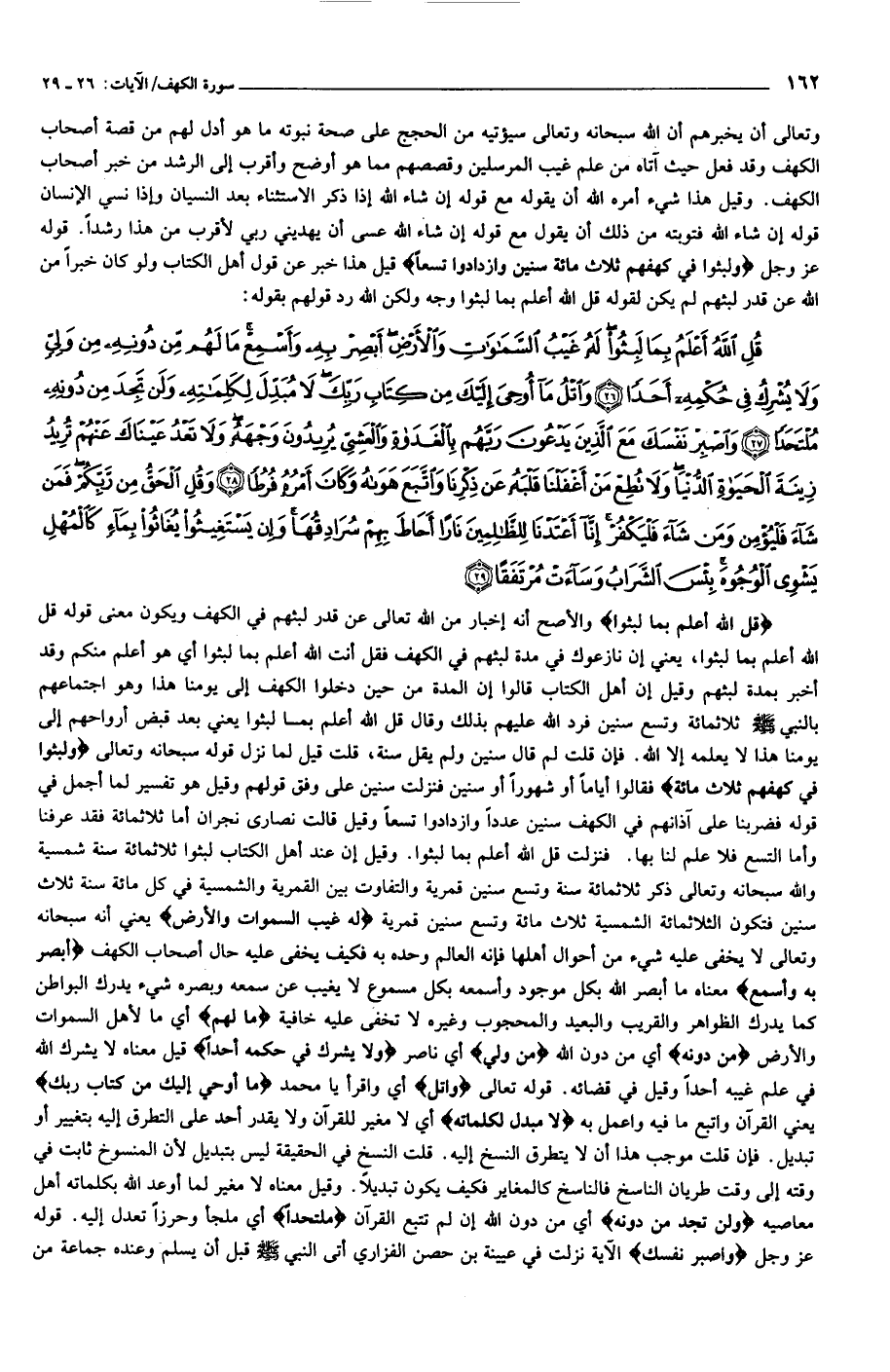 قُلِ اللَّهُ أَعْلَمُ بِما لَبِثُوا لَهُ غَيْبُ السَّماواتِ وَالْأَرْضِ أَبْصِرْ بِهِ وَأَسْمِعْ ما لَهُمْ مِنْ دُونِهِ مِنْ وَلِيٍّ وَلا يُشْرِكُ فِي حُكْمِهِ أَحَداً (26) وَاتْلُ ما أُوحِيَ إِلَيْكَ مِنْ كِتابِ رَبِّكَ لا مُبَدِّلَ لِكَلِماتِهِ وَلَنْ تَجِدَ مِنْ دُونِهِ مُلْتَحَداً (27) وَاصْبِرْ نَفْسَكَ مَعَ الَّذِينَ يَدْعُونَ رَبَّهُمْ بِالْغَداةِ وَالْعَشِيِّ يُرِيدُونَ وَجْهَهُ وَلا تَعْدُ عَيْناكَ عَنْهُمْ تُرِيدُ زِينَةَ الْحَياةِ الدُّنْيا وَلا تُطِعْ مَنْ أَغْفَلْنا قَلْبَهُ عَنْ ذِكْرِنا وَاتَّبَعَ هَواهُ وَكانَ أَمْرُهُ فُرُطاً (28) وَقُلِ الْحَقُّ مِنْ رَبِّكُمْ فَمَنْ شاءَ فَلْيُؤْمِنْ وَمَنْ شاءَ فَلْيَكْفُرْ إِنَّا أَعْتَدْنا لِلظَّالِمِينَ ناراً أَحاطَ بِهِمْ سُرادِقُها وَإِنْ يَسْتَغِيثُوا يُغاثُوا بِماءٍ كَالْمُهْلِ يَشْوِي الْوُجُوهَ بِئْسَ الشَّرابُ وَساءَتْ مُرْتَفَقاً (29)