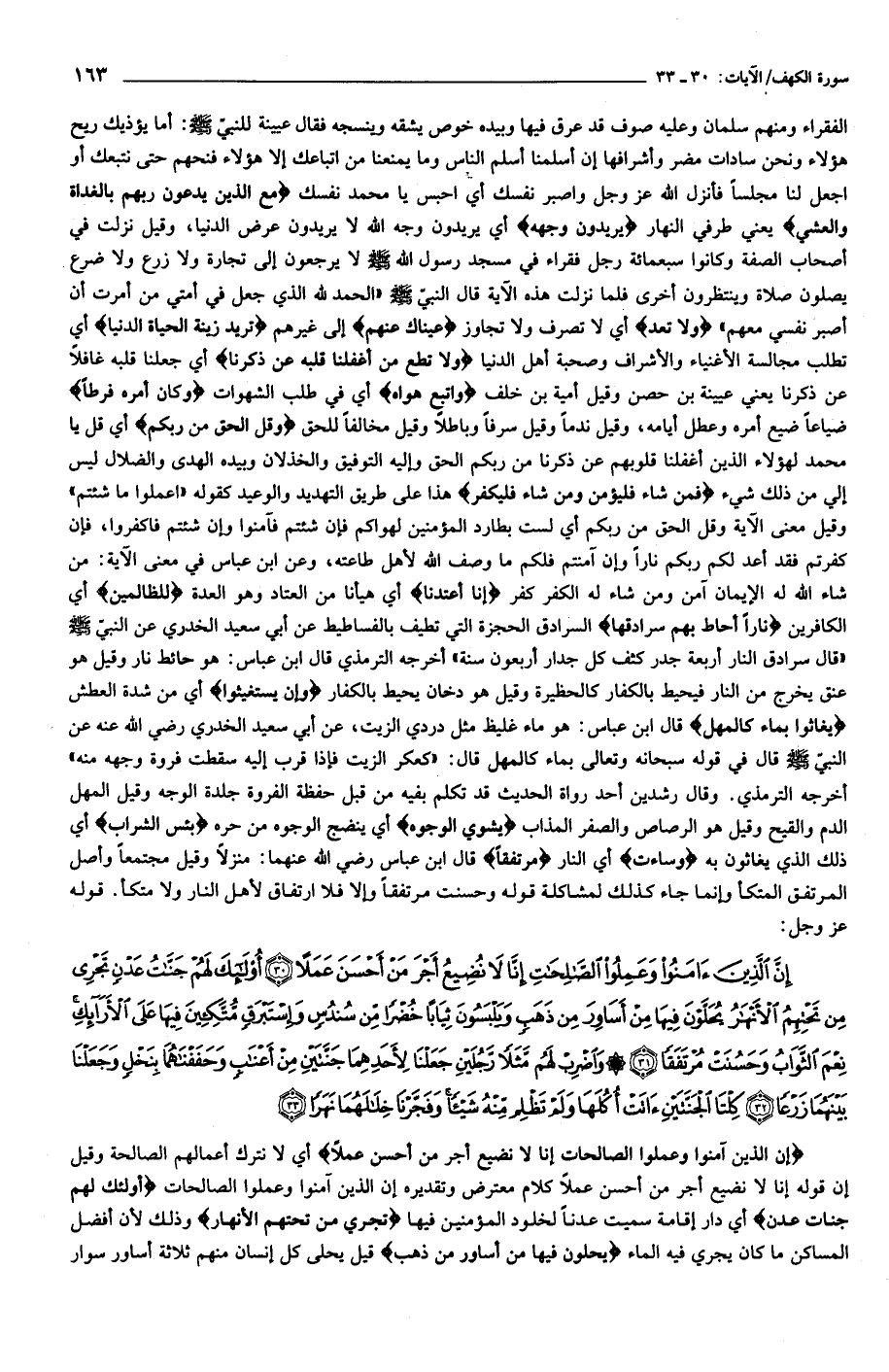 إِنَّ الَّذِينَ آمَنُوا وَعَمِلُوا الصَّالِحاتِ إِنَّا لا نُضِيعُ أَجْرَ مَنْ أَحْسَنَ عَمَلاً (30) أُولئِكَ لَهُمْ جَنَّاتُ عَدْنٍ تَجْرِي مِنْ تَحْتِهِمُ الْأَنْهارُ يُحَلَّوْنَ فِيها مِنْ أَساوِرَ مِنْ ذَهَبٍ وَيَلْبَسُونَ ثِياباً خُضْراً مِنْ سُنْدُسٍ وَإِسْتَبْرَقٍ مُتَّكِئِينَ فِيها عَلَى الْأَرائِكِ نِعْمَ الثَّوابُ وَحَسُنَتْ مُرْتَفَقاً (31) وَاضْرِبْ لَهُمْ مَثَلاً رَجُلَيْنِ جَعَلْنا لِأَحَدِهِما جَنَّتَيْنِ مِنْ أَعْنابٍ وَحَفَفْناهُما بِنَخْلٍ وَجَعَلْنا بَيْنَهُما زَرْعاً (32) كِلْتَا الْجَنَّتَيْنِ آتَتْ أُكُلَها وَلَمْ تَظْلِمْ مِنْهُ شَيْئاً وَفَجَّرْنا خِلالَهُما نَهَراً (33)