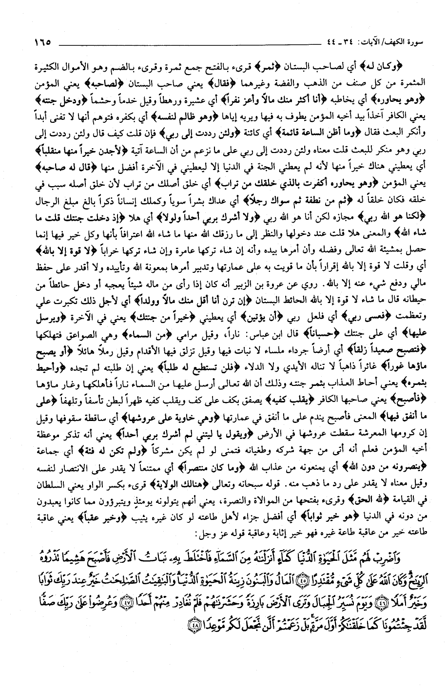 وَكانَ لَهُ أي لصاحب البستان ثَمَرٌ قرئ بالفتح جمع ثمرة وقرئ بالضم وهو الأموال الكثيرة المثمرة من كل صنف من الذهب والفضة وغيرهما فَقالَ يعني صاحب البستان لِصاحِبِهِ يعني المؤمن وَهُوَ يُحاوِرُهُ أي يخاطبه أَنَا أَكْثَرُ مِنْكَ مالًا وَأَعَزُّ نَفَراً أي عشيرة ورهطا وقيل خدما وحشما وَدَخَلَ جَنَّتَهُ يعني الكافر آخذا بيد أخيه المؤمن يطوف به فيها ويريه إياها وَهُوَ ظالِمٌ لِنَفْسِهِ أي بكفره فتوهم أنها لا تفنى أبدا وأنكر البعث فقال وَما أَظُنُّ السَّاعَةَ قائِمَةً أي كائنة وَلَئِنْ رُدِدْتُ إِلى رَبِّي فإن قلت كيف قال ولئن رددت إلى ربي وهو منكر للبعث قلت معناه ولئن رددت إلى ربي على ما نزعم من أن الساعة آتية لَأَجِدَنَّ خَيْراً مِنْها مُنْقَلَباً أي يعطيني هناك خيرا منها لأنه لم يعطني الجنة في الدنيا إلا ليعطيني في الآخرة أفضل منها قالَ لَهُ صاحِبُهُ يعني المؤمن وَهُوَ يُحاوِرُهُ أَكَفَرْتَ بِالَّذِي خَلَقَكَ مِنْ تُرابٍ أي خلق أصلك من تراب لأن خلق أصله سبب في خلقه فكان خلقا له ثُمَّ مِنْ نُطْفَةٍ ثُمَّ سَوَّاكَ رَجُلًا أي عداك بشرا سويا وكملك إنسانا ذكرا بالغ مبلغ الرجال لكِنَّا هُوَ اللَّهُ رَبِّي مجازه لكن أنا هو الله ربي وَلا أُشْرِكُ بِرَبِّي أَحَداً وَلَوْلا أي هلا إِذْ دَخَلْتَ جَنَّتَكَ قُلْتَ ما شاءَ اللَّهُ والمعنى هلا قلت عند دخولها والنظر إلى ما رزقك الله منها ما شاء الله اعترافا بأنها وكل خير فيها إنما حصل بمشيئة الله تعالى وفضله وأن أمرها بيده وأنه إن شاء تركها عامرة وإن شاء تركها خرابا لا قُوَّةَ إِلَّا بِاللَّهِ أي وقلت لا قوة إلا بالله إقرارا بأن ما قويت به على عمارتها وتدبير أمرها بمعونة الله وتأييده ولا أقدر على حفظ مالي ودفع شيء عنه إلا بالله. روي عن عروة بن الزبير أنه كان إذا رأى من ماله شيئا يعجبه أو دخل حائطا من حيطانه قال ما شاء لا قوة إلا بالله الحائط البستان إِنْ تَرَنِ أَنَا أَقَلَّ مِنْكَ مالًا وَوَلَداً أي لأجل ذلك تكبرت علي وتعظمت فَعَسى رَبِّي أي فلعل ربي أَنْ يُؤْتِيَنِ أي يعطيني خَيْراً مِنْ جَنَّتِكَ يعني في الآخرة وَيُرْسِلَ عَلَيْها أي على جنتك حُسْباناً قال ابن عباس: نارا، وقيل مرامي مِنَ السَّماءِ وهي الصواعق فتهلكها فَتُصْبِحَ صَعِيداً زَلَقاً أي أرضا جرداء ملساء لا نبات فيها وقيل تزلق فيها الأقدام وقيل رملا هائلا أَوْ يُصْبِحَ ماؤُها غَوْراً غائرا ذاهبا لا تناله الأيدي ولا الدلاء فَلَنْ تَسْتَطِيعَ لَهُ طَلَباً يعني إن طلبته لم تجده وَأُحِيطَ بِثَمَرِهِ يعني أحاط العذاب بثمر جنته وذلك أن الله تعالى أرسل عليها من السماء نارا فأهلكها وغار ماؤها فَأَصْبَحَ يعني صاحبها الكافر يُقَلِّبُ كَفَّيْهِ يصفق بكف على كف ويقلب كفيه ظهرا لبطن تأسفا وتلهفا عَلى ما أَنْفَقَ فِيها المعنى فأصبح يندم على ما أنفق في عمارتها وَهِيَ خاوِيَةٌ عَلى عُرُوشِها أي ساقطة سقوفها وقيل إن كرومها المعرشة سقطت عروشها في الأرض وَيَقُولُ يا لَيْتَنِي لَمْ أُشْرِكْ بِرَبِّي أَحَداً يعني أنه تذكر موعظة أخيه المؤمن فعلم أنه أتى من جهة شركه وطغيانه فتمنى لو لم يكن مشركا وَلَمْ تَكُنْ لَهُ فِئَةٌ أي جماعة يَنْصُرُونَهُ مِنْ دُونِ اللَّهِ أي يمنعونه من عذاب الله وَما كانَ مُنْتَصِراً أي ممتنعا لا يقدر على الانتصار لنفسه وقيل معناه لا يقدر على رد ما ذهب منه. قوله سبحانه وتعالى هُنالِكَ الْوَلايَةُ قرئ بكسر الواو يعني السلطان في القيامة لِلَّهِ الْحَقِّ وقرئ بفتحها من الموالاة والنصرة، يعني أنهم يتولونه يومئذ ويتبرؤون مما كانوا يعبدون من دونه في الدنيا هُوَ خَيْرٌ ثَواباً أي أفضل جزاء لأهل طاعته لو كان غيره يثيب وَخَيْرٌ عُقْباً يعني عاقبة طاعته خير من عاقبة طاعة غيره فهو خير إثابة وعاقبة قوله عز وجل: