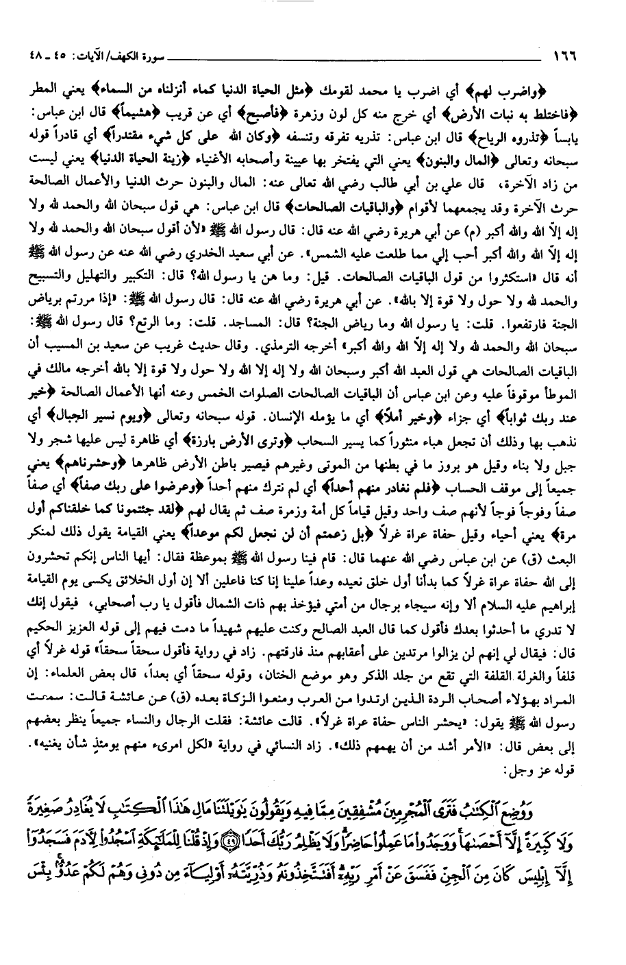 يابسا تَذْرُوهُ الرِّياحُ قال ابن عباس: تذريه تفرقه وتنسفه وَكانَ اللَّهُ عَلى كُلِّ شَيْءٍ مُقْتَدِراً أي قادرا قوله سبحانه وتعالى الْمالُ وَالْبَنُونَ يعني التي يفتخر بها عيينة وأصحابه الأغنياء زِينَةُ الْحَياةِ الدُّنْيا يعني ليست من زاد الآخرة، قال علي بن أبي طالب رضي الله تعالى عنه: المال والبنون حرث الدنيا والأعمال الصالحة حرث الآخرة وقد يجمعهما لأقوام وَالْباقِياتُ الصَّالِحاتُ قال ابن عباس: هي قول سبحان الله والحمد لله ولا إله إلّا الله والله أكبر (م) عن أبي هريرة رضي الله عنه قال: قال رسول الله صلّى الله عليه وسلّم «لأن أقول سبحان الله والحمد لله ولا إله إلّا الله والله أكبر أحب إلي مما طلعت عليه الشمس». عن أبي سعيد الخدري رضي الله عنه عن رسول الله صلّى الله عليه وسلّم أنه قال «استكثروا من قول الباقيات الصالحات. قيل: وما هن يا رسول الله؟ قال: التكبير والتهليل والتسبيح والحمد لله ولا حول ولا قوة إلا بالله». عن أبي هريرة رضي الله عنه قال: قال رسول الله صلّى الله عليه وسلّم: «إذا مررتم برياض الجنة فارتفعوا. قلت: يا رسول الله وما رياض الجنة؟ قال: المساجد. قلت: وما الرتع؟ قال رسول الله صلّى الله عليه وسلّم: