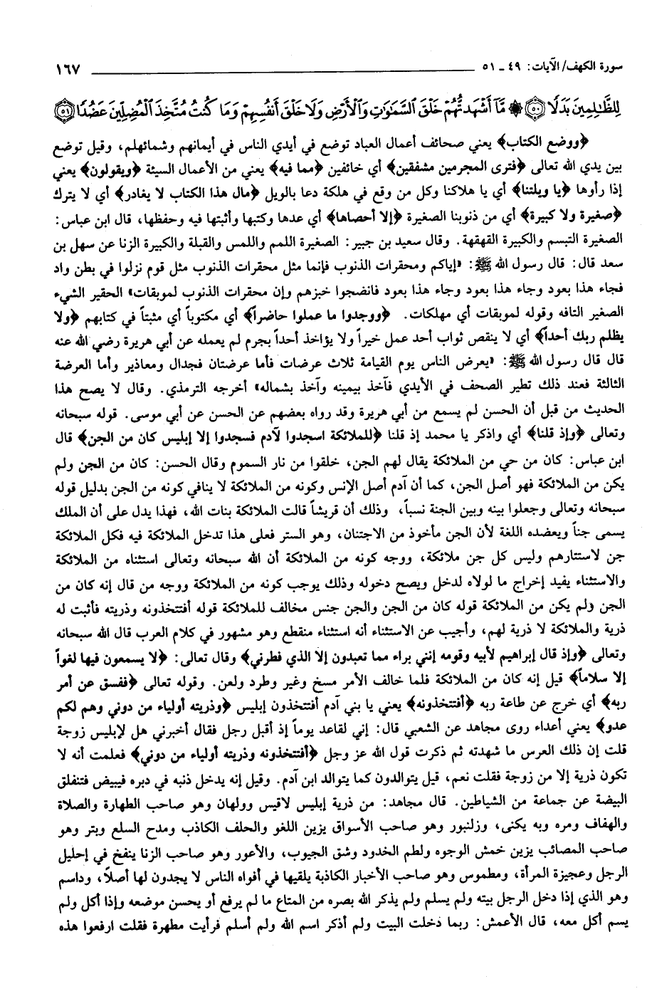 الصغيرة التبسم والكبيرة القهقهة. وقال سعيد بن جبير: الصغيرة اللمم واللمس والقبلة والكبيرة الزنا عن سهل بن سعد قال: قال رسول الله صلّى الله عليه وسلّم: «إياكم ومحقرات الذنوب فإنما مثل محقرات الذنوب مثل قوم نزلوا في بطن واد فجاء هذا بعود وجاء هذا بعود وجاء هذا بعود فانضجوا خبزهم وإن محقرات الذنوب لموبقات» الحقير الشيء الصغير التافه وقوله لموبقات أي مهلكات. وَوَجَدُوا ما عَمِلُوا حاضِراً أي مكتوبا أي مثبتا في كتابهم وَلا يَظْلِمُ رَبُّكَ أَحَداً أي لا ينقص ثواب أحد عمل خيرا ولا يؤاخذ أحدا بجرم لم يعمله عن أبي هريرة رضي الله عنه قال قال رسول الله صلّى الله عليه وسلّم: «يعرض الناس يوم القيامة ثلاث عرضات فأما عرضتان فجدال ومعاذير وأما العرضة الثالثة فعند ذلك تطير الصحف في الأيدي فآخذ بيمينه وآخذ بشماله» أخرجه الترمذي. وقال لا يصح هذا الحديث من قبل أن الحسن لم يسمع من أبي هريرة وقد رواه بعضهم عن الحسن عن أبي موسى. قوله سبحانه وتعالى وَإِذْ قُلْنا أي واذكر يا محمد إذ قلنا لِلْمَلائِكَةِ اسْجُدُوا لِآدَمَ فَسَجَدُوا إِلَّا إِبْلِيسَ كانَ مِنَ الْجِنِّ قال ابن عباس: كان من حي من الملائكة يقال لهم الجن، خلقوا من نار السموم وقال الحسن: كان من الجن ولم يكن من الملائكة فهو أصل الجن، كما أن آدم أصل الإنس وكونه من الملائكة لا ينافي كونه من الجن بدليل قوله سبحانه وتعالى وجعلوا بينه وبين الجنة نسبا، وذلك أن قريشا قالت الملائكة بنات الله، فهذا يدل على أن الملك يسمى جنا ويعضده اللغة لأن الجن مأخوذ من الاجتنان، وهو الستر فعلى هذا تدخل الملائكة فيه فكل الملائكة جن لاستتارهم وليس كل جن ملائكة، ووجه كونه من الملائكة أن الله سبحانه وتعالى استثناه من الملائكة والاستثناء يفيد إخراج ما لولاه لدخل ويصح دخوله وذلك يوجب كونه من الملائكة ووجه من قال إنه كان من الجن ولم يكن من الملائكة قوله كان من الجن والجن جنس مخالف للملائكة قوله أفتتخذونه وذريته فأثبت له ذرية والملائكة لا ذرية لهم، وأجيب عن الاستثناء أنه استثناء منقطع وهو مشهور في كلام العرب قال الله سبحانه وتعالى وَإِذْ قالَ إِبْراهِيمُ لِأَبِيهِ وَقَوْمِهِ إِنَّنِي بَراءٌ مِمَّا تَعْبُدُونَ إِلَّا الَّذِي فَطَرَنِي وقال تعالى: لا يَسْمَعُونَ فِيها لَغْواً إِلَّا سَلاماً قيل إنه كان من الملائكة فلما خالف الأمر مسخ وغير وطرد ولعن. وقوله تعالى فَفَسَقَ عَنْ أَمْرِ رَبِّهِ أي خرج عن طاعة ربه أَفَتَتَّخِذُونَهُ يعني يا بني آدم أفتتخذون إبليس وَذُرِّيَّتَهُ أَوْلِياءَ مِنْ دُونِي وَهُمْ لَكُمْ عَدُوٌّ يعني أعداء روى مجاهد عن الشعبي قال: إني لقاعد يوما إذ أقبل رجل فقال أخبرني هل لإبليس زوجة قلت إن ذلك العرس ما شهدته ثم ذكرت قول الله عز وجل أَفَتَتَّخِذُونَهُ وَذُرِّيَّتَهُ أَوْلِياءَ مِنْ دُونِي فعلمت أنه لا تكون ذرية إلا من زوجة فقلت نعم، قيل يتوالدون كما يتوالد ابن آدم. وقيل إنه يدخل ذنبه في دبره فيبيض فتنفلق البيضة عن جماعة من الشياطين. قال مجاهد: من ذرية إبليس لاقيس وولهان وهو صاحب الطهارة والصلاة والهفاف ومره وبه يكنى، وزلنبور وهو صاحب الأسواق يزين اللغو والحلف الكاذب ومدح السلع وبتر وهو صاحب المصائب يزين خمش الوجوه ولطم الخدود وشق الجيوب، والأعور وهو صاحب الزنا ينفخ في إحليل الرجل وعجيزة المرأة، ومطموس وهو صاحب الأخبار الكاذبة يلقيها في أفواه الناس لا يجدون لها أصلا، وداسم وهو الذي إذا دخل الرجل بيته ولم يسلم ولم يذكر الله بصره من المتاع ما لم يرفع أو يحسن موضعه وإذا أكل ولم يسم أكل معه، قال الأعمش: ربما دخلت البيت ولم أذكر اسم الله ولم أسلم فرأيت مطهرة فقلت ارفعوا هذه