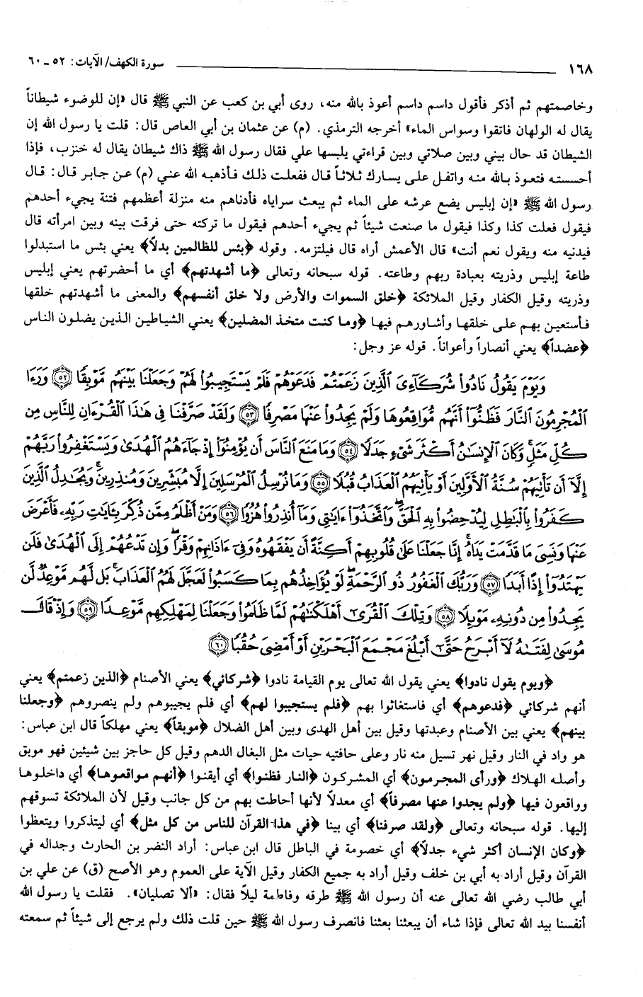 وَيَوْمَ يَقُولُ نادُوا شُرَكائِيَ الَّذِينَ زَعَمْتُمْ فَدَعَوْهُمْ فَلَمْ يَسْتَجِيبُوا لَهُمْ وَجَعَلْنا بَيْنَهُمْ مَوْبِقاً (52) وَرَأَى الْمُجْرِمُونَ النَّارَ فَظَنُّوا أَنَّهُمْ مُواقِعُوها وَلَمْ يَجِدُوا عَنْها مَصْرِفاً (53) وَلَقَدْ صَرَّفْنا فِي هذَا الْقُرْآنِ لِلنَّاسِ مِنْ كُلِّ مَثَلٍ وَكانَ الْإِنْسانُ أَكْثَرَ شَيْءٍ جَدَلاً (54) وَما مَنَعَ النَّاسَ أَنْ يُؤْمِنُوا إِذْ جاءَهُمُ الْهُدى وَيَسْتَغْفِرُوا رَبَّهُمْ إِلاَّ أَنْ تَأْتِيَهُمْ سُنَّةُ الْأَوَّلِينَ أَوْ يَأْتِيَهُمُ الْعَذابُ قُبُلاً (55) وَما نُرْسِلُ الْمُرْسَلِينَ إِلاَّ مُبَشِّرِينَ وَمُنْذِرِينَ وَيُجادِلُ الَّذِينَ كَفَرُوا بِالْباطِلِ لِيُدْحِضُوا بِهِ الْحَقَّ وَاتَّخَذُوا آياتِي وَما أُنْذِرُوا هُزُواً (56)
