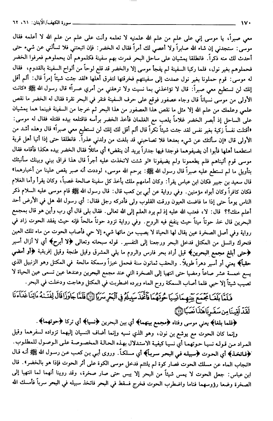 «أقتلت نفسا زكية بغير نفس لقد جئت شيئا نكرا قال ألم أقل لك إنك لن تستطيع معي صبرا» قال وهذه أشد من الأولى قال «إن سألتك عن شيء بعدها فلا تصاحبني قد بلغت من ولدني عذرا. فانطلقا حتى إذا أتيا أهل قرية استطعما أهلها فأبوا أن يضيفوهما فوجدا فيها جدارا يريد أن ينقض» أي مائلا فقال الخضر بيده هكذا فأقامه فقال موسى قوم أتيناهم فلم يطعمونا ولم يضيفونا «لو شئت لاتخذت عليه أجرا قال هذا فراق بيني وبينك سأنبئك بتأويل ما لم تستطع عليه صبرا قال رسول الله صلّى الله عليه وسلّم: يرحم الله موسى، لوددت أنه صبر يقص علينا من أخبارهما» قال سعيد بن جبير فكان ابن عباس يقرأ: وكان أمامهم ملك يأخذ كل سفينة صالحة غصبا، وكان يقرأ وأما الغلام فكان كافرا وكان أبواه مؤمنين. وفي رواية عن أبي بن كعب قال: قال رسول الله صلّى الله عليه وسلّم قام موسى عليه السلام ذكر الناس يوما حتى إذا ما فاضت العيون ورقت القلوب ولى فأدركه رجل فقال: أي رسول الله هل في الأرض أحد أعلم منك؟؟ قال: لا، فعتب الله عليه إذ لم يرد العلم إلى الله تعالى. فقال بلى قال أي رب وأين هو قال بمجمع البحرين قال خذ حوتا ميتا حيث ينفخ فيه الروح. وفي رواية تزود حوتا مالحا فإنه حيث يفقد الحوت زاد في رواية وفي أصل الصخرة عين يقال لها الحياة لا يصيب من مائها شيء إلا حي فأصاب الحوت من ماء تلك العين فتحرك وانسل من المكتل فدخل البحر ورجعنا إلى التفسير. قوله سبحانه وتعالى لا أَبْرَحُ أي لا أزال أسير حَتَّى أَبْلُغَ مَجْمَعَ الْبَحْرَيْنِ قيل أراد بحر فارس والروم ما يلي المشرق وقيل طنجة وقيل إفريقية أَوْ أَمْضِيَ حُقُباً يعني أو أسير دهرا طويلا. والحقب ثمانون سنة فحمل خبزا وسمكة مالحة في المكتل وهو الزنبيل الذي يسع خمسة عشر صاعا ومضيا حتى انتهيا إلى الصخرة التي عند مجمع البحرين وعندها عين تسمى عين الحياة لا تصيب شيئا إلا حيي فلما أصاب السمكة روح الماء وبرده اضطربت في المكتل وهاجت ودخلت في البحر.