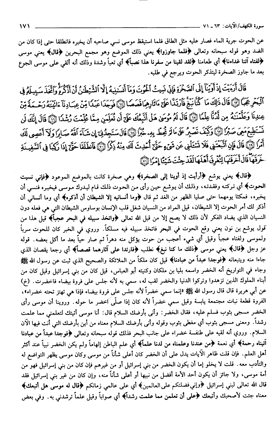 قالَ أَرَأَيْتَ إِذْ أَوَيْنا إِلَى الصَّخْرَةِ فَإِنِّي نَسِيتُ الْحُوتَ وَما أَنْسانِيهُ إِلاَّ الشَّيْطانُ أَنْ أَذْكُرَهُ وَاتَّخَذَ سَبِيلَهُ فِي الْبَحْرِ عَجَباً (63) قالَ ذلِكَ ما كُنَّا نَبْغِ فَارْتَدَّا عَلى آثارِهِما قَصَصاً (64) فَوَجَدا عَبْداً مِنْ عِبادِنا آتَيْناهُ رَحْمَةً مِنْ عِنْدِنا وَعَلَّمْناهُ مِنْ لَدُنَّا عِلْماً (65) قالَ لَهُ مُوسى هَلْ أَتَّبِعُكَ عَلى أَنْ تُعَلِّمَنِ مِمَّا عُلِّمْتَ رُشْداً (66) قالَ إِنَّكَ لَنْ تَسْتَطِيعَ مَعِيَ صَبْراً (67)
