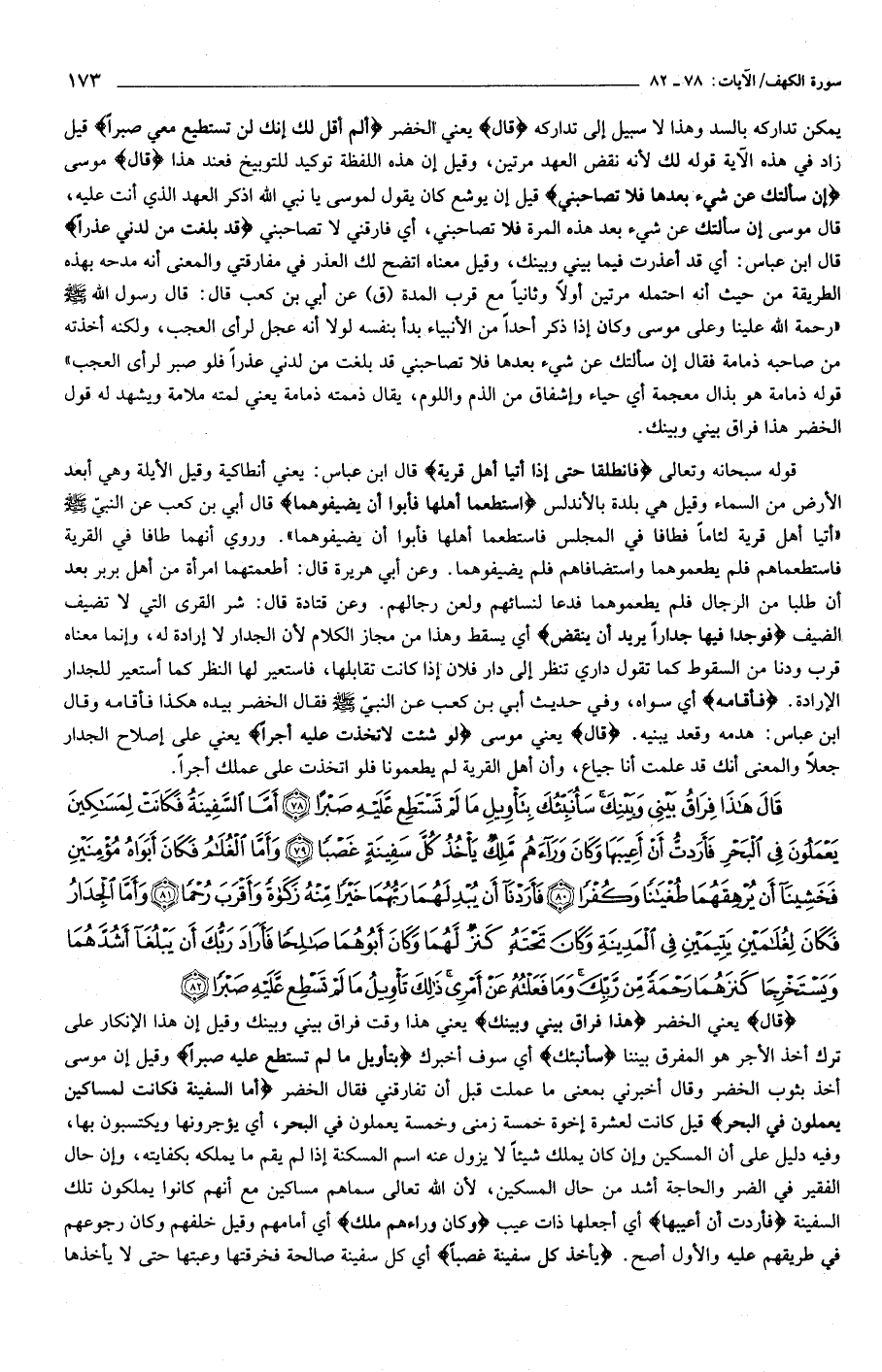 قالَ هذا فِراقُ بَيْنِي وَبَيْنِكَ سَأُنَبِّئُكَ بِتَأْوِيلِ ما لَمْ تَسْتَطِعْ عَلَيْهِ صَبْراً (78) أَمَّا السَّفِينَةُ فَكانَتْ لِمَساكِينَ يَعْمَلُونَ فِي الْبَحْرِ فَأَرَدْتُ أَنْ أَعِيبَها وَكانَ وَراءَهُمْ مَلِكٌ يَأْخُذُ كُلَّ سَفِينَةٍ غَصْباً (79) وَأَمَّا الْغُلامُ فَكانَ أَبَواهُ مُؤْمِنَيْنِ فَخَشِينا أَنْ يُرْهِقَهُما طُغْياناً وَكُفْراً (80) فَأَرَدْنا أَنْ يُبْدِلَهُما رَبُّهُما خَيْراً مِنْهُ زَكاةً وَأَقْرَبَ رُحْماً (81) وَأَمَّا الْجِدارُ فَكانَ لِغُلامَيْنِ يَتِيمَيْنِ فِي الْمَدِينَةِ وَكانَ تَحْتَهُ كَنْزٌ لَهُما وَكانَ أَبُوهُما صالِحاً فَأَرادَ رَبُّكَ أَنْ يَبْلُغا أَشُدَّهُما وَيَسْتَخْرِجا كَنزَهُما رَحْمَةً مِنْ رَبِّكَ وَما فَعَلْتُهُ عَنْ أَمْرِي ذلِكَ تَأْوِيلُ ما لَمْ تَسْطِعْ عَلَيْهِ صَبْراً (82)