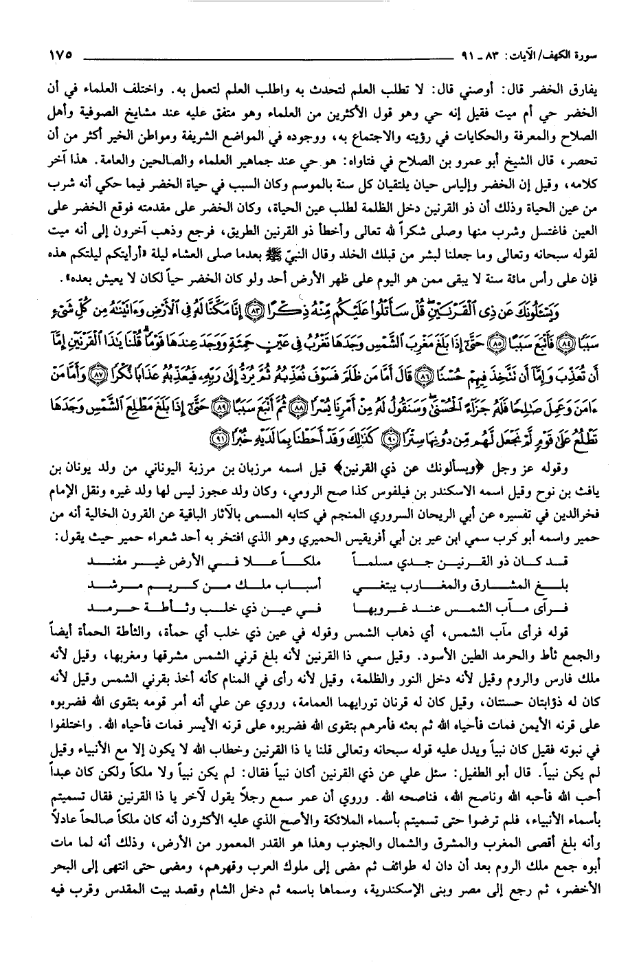 وَيَسْئَلُونَكَ عَنْ ذِي الْقَرْنَيْنِ قُلْ سَأَتْلُوا عَلَيْكُمْ مِنْهُ ذِكْراً (83) إِنَّا مَكَّنَّا لَهُ فِي الْأَرْضِ وَآتَيْناهُ مِنْ كُلِّ شَيْءٍ سَبَباً (84) فَأَتْبَعَ سَبَباً (85) حَتَّى إِذا بَلَغَ مَغْرِبَ الشَّمْسِ وَجَدَها تَغْرُبُ فِي عَيْنٍ حَمِئَةٍ وَوَجَدَ عِنْدَها قَوْماً قُلْنا يا ذَا الْقَرْنَيْنِ إِمَّا أَنْ تُعَذِّبَ وَإِمَّا أَنْ تَتَّخِذَ فِيهِمْ حُسْناً (86) قالَ أَمَّا مَنْ ظَلَمَ فَسَوْفَ نُعَذِّبُهُ ثُمَّ يُرَدُّ إِلى رَبِّهِ فَيُعَذِّبُهُ عَذاباً نُكْراً (87)