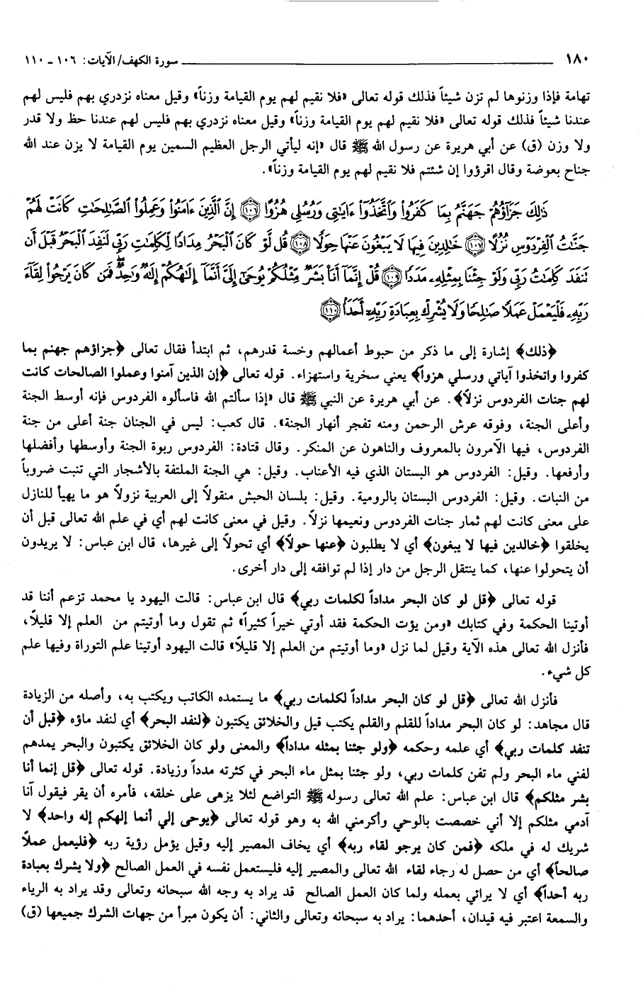 ذلِكَ جَزاؤُهُمْ جَهَنَّمُ بِما كَفَرُوا وَاتَّخَذُوا آياتِي وَرُسُلِي هُزُواً (106) إِنَّ الَّذِينَ آمَنُوا وَعَمِلُوا الصَّالِحاتِ كانَتْ لَهُمْ جَنَّاتُ الْفِرْدَوْسِ نُزُلاً (107) خالِدِينَ فِيها لا يَبْغُونَ عَنْها حِوَلاً (108) قُلْ لَوْ كانَ الْبَحْرُ مِداداً لِكَلِماتِ رَبِّي لَنَفِدَ الْبَحْرُ قَبْلَ أَنْ تَنْفَدَ كَلِماتُ رَبِّي وَلَوْ جِئْنا بِمِثْلِهِ مَدَداً (109) قُلْ إِنَّما أَنَا بَشَرٌ مِثْلُكُمْ يُوحى إِلَيَّ أَنَّما إِلهُكُمْ إِلهٌ واحِدٌ فَمَنْ كانَ يَرْجُوا لِقاءَ رَبِّهِ فَلْيَعْمَلْ عَمَلاً صالِحاً وَلا يُشْرِكْ بِعِبادَةِ رَبِّهِ أَحَداً (110)