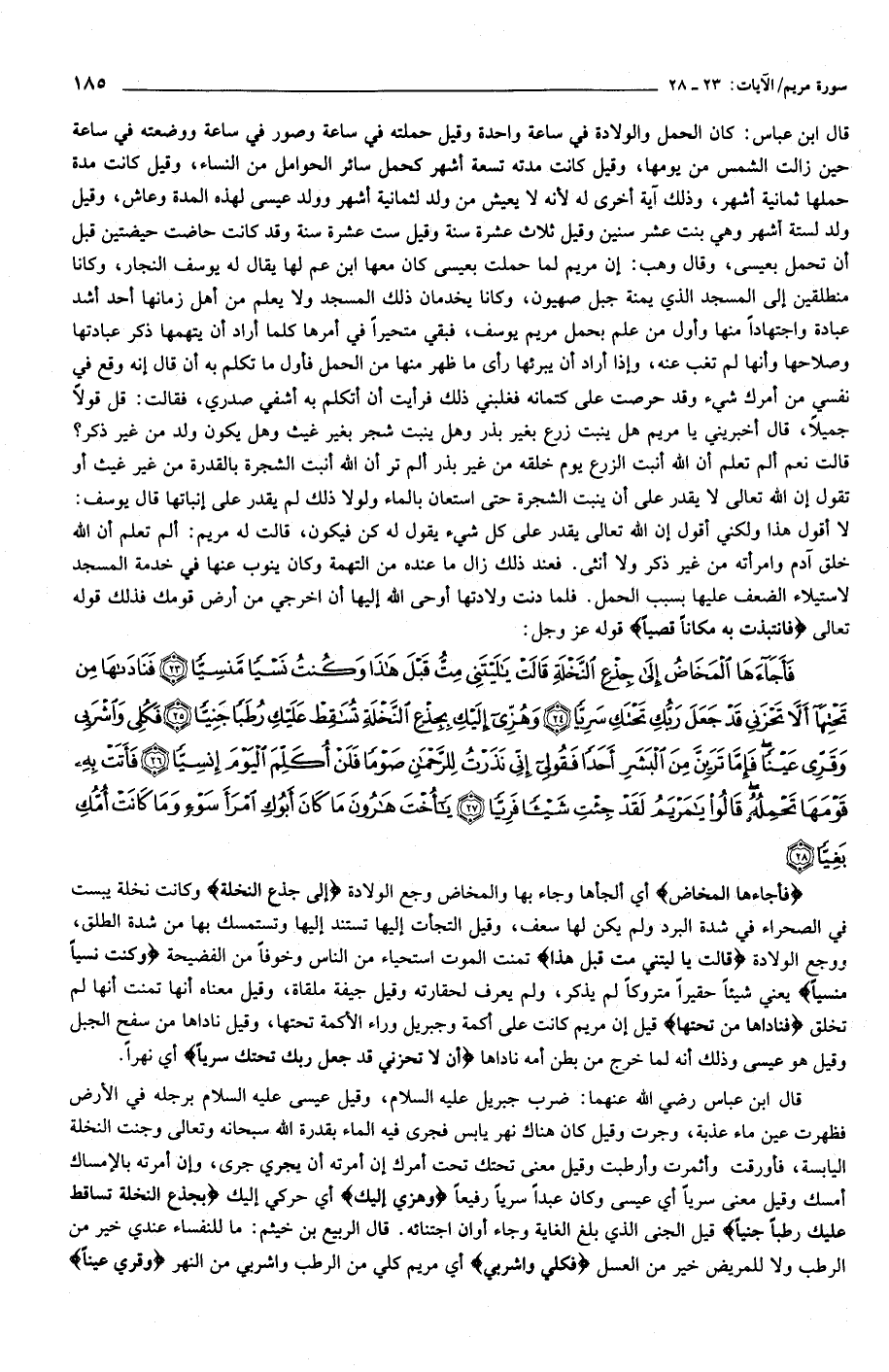 فَأَجاءَهَا الْمَخاضُ إِلى جِذْعِ النَّخْلَةِ قالَتْ يا لَيْتَنِي مِتُّ قَبْلَ هذا وَكُنْتُ نَسْياً مَنْسِيًّا (23) فَناداها مِنْ تَحْتِها أَلاَّ تَحْزَنِي قَدْ جَعَلَ رَبُّكِ تَحْتَكِ سَرِيًّا (24) وَهُزِّي إِلَيْكِ بِجِذْعِ النَّخْلَةِ تُساقِطْ عَلَيْكِ رُطَباً جَنِيًّا (25) فَكُلِي وَاشْرَبِي وَقَرِّي عَيْناً فَإِمَّا تَرَيِنَّ مِنَ الْبَشَرِ أَحَداً فَقُولِي إِنِّي نَذَرْتُ لِلرَّحْمنِ صَوْماً فَلَنْ أُكَلِّمَ الْيَوْمَ إِنْسِيًّا (26) فَأَتَتْ بِهِ قَوْمَها تَحْمِلُهُ قالُوا يا مَرْيَمُ لَقَدْ جِئْتِ شَيْئاً فَرِيًّا (27)
