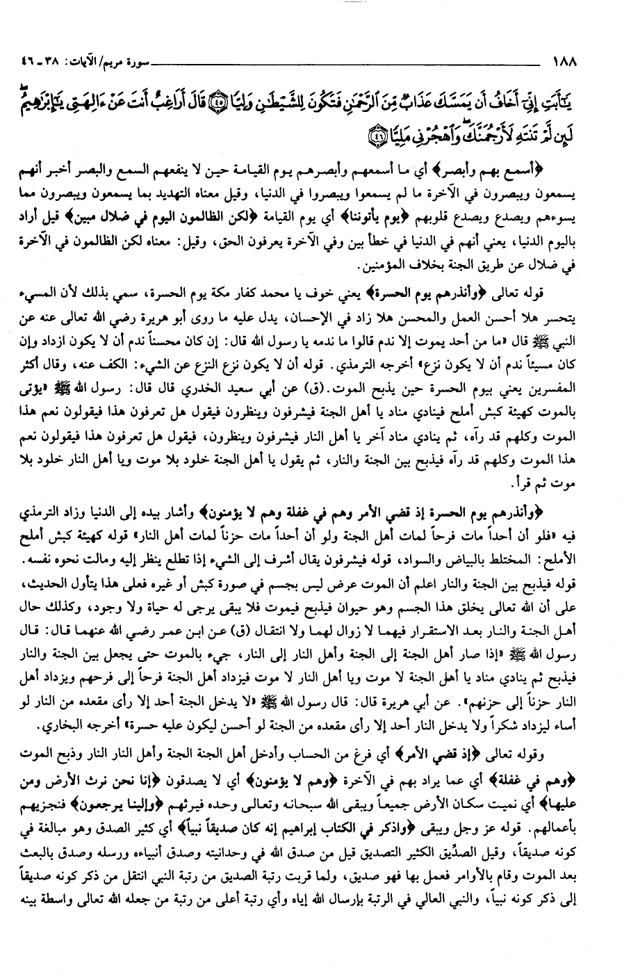 وقوله تعالى إِذْ قُضِيَ الْأَمْرُ أي فرغ من الحساب وأدخل أهل الجنة الجنة وأهل النار النار وذبح الموت وَهُمْ فِي غَفْلَةٍ أي عما يراد بهم في الآخرة وَهُمْ لا يُؤْمِنُونَ أي لا يصدقون إِنَّا نَحْنُ نَرِثُ الْأَرْضَ وَمَنْ عَلَيْها أي نميت سكان الأرض جميعا ويبقى الله سبحانه وتعالى وحده فيرثهم وَإِلَيْنا يُرْجَعُونَ فنجزيهم بأعمالهم. قوله عز وجل ويبقى وَاذْكُرْ فِي الْكِتابِ إِبْراهِيمَ إِنَّهُ كانَ صِدِّيقاً نَبِيًّا أي كثير الصدق وهو مبالغة في كونه صديقا، وقيل الصدّيق الكثير التصديق قيل من صدق الله في وحدانيته وصدق أنبياءه ورسله وصدق بالبعث بعد الموت وقام بالأوامر فعمل بها فهو صديق، ولما قربت رتبة الصديق من رتبة النبي انتقل من ذكر كونه صديقا إلى ذكر كونه نبيا، والنبي العالي في الرتبة بإرسال الله إياه وأي رتبة أعلى من رتبة من جعله الله تعالى واسطة بينه