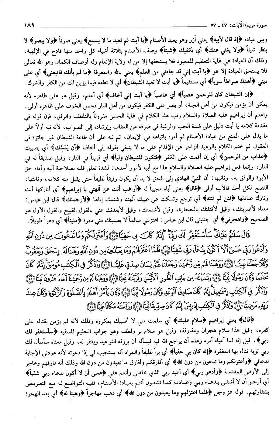قالَ يعني إبراهيم سَلامٌ عَلَيْكَ أي سلمت مني لا أصيبك بمكروه وذلك لأنه لم يؤمن بقتاله على كفره، وقيل هذا سلام هجران ومفارقة، وقيل هو سلام بر ولطف وهو جواب الحليم للسفيه سَأَسْتَغْفِرُ لَكَ رَبِّي، قيل إنه لما أعياه أمره وعده أن يراجع الله فيه فيسأله أن يرزقه التوحيد ويغفر له، وقيل معناه سأسأل لك ربي توبة تنال بها المغفرة إِنَّهُ كانَ بِي حَفِيًّا أي برا لطيفا والمراد أنه يستجيب لي إذا دعوته لأنه عودني الإجابة لدعائي وَأَعْتَزِلُكُمْ وَما تَدْعُونَ مِنْ دُونِ اللَّهِ أي أفارقكم وأفارق ما تعبدون من دون الله وذلك أنه فارقهم وهاجر إلى الأرض المقدسة وَأَدْعُوا رَبِّي أي أعبد ربي الذي خلقني وأنعم علي عَسى أَلَّا أَكُونَ بِدُعاءِ رَبِّي شَقِيًّا أي أرجو أن لا أشقى بدعاء ربي وعبادته كما تشقون أنتم بعبادة الأصنام، ففيه التواضع له مع التعريض بشقاوتهم. قوله عز وجل فَلَمَّا اعْتَزَلَهُمْ وَما يَعْبُدُونَ مِنْ دُونِ اللَّهِ أي ذهب مهاجرا وَهَبْنا لَهُ أي بعد الهجرة