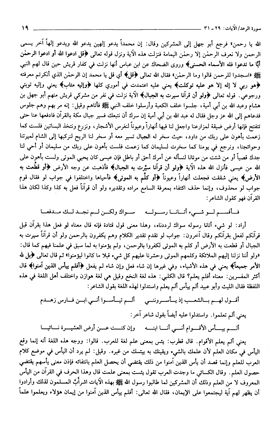 الله يا رحمن» فرجع أبو جهل إلى المشركين وقال: إن محمدا يدعو إلهين يدعو الله ويدعو إلها آخر يسمى الرحمن ولا نعرف الرحمن إلا رحمن اليمامة فنزلت هذه الآية ونزل قوله تعالى قُلِ ادْعُوا اللَّهَ أَوِ ادْعُوا الرَّحْمنَ أَيًّا ما تَدْعُوا فَلَهُ الْأَسْماءُ الْحُسْنى وروى الضحاك عن ابن عباس أنها نزلت في كفار قريش حين قال لهم النبي صلّى الله عليه وسلّم «اسجدوا للرحمن قالوا وما الرحمن» فقال الله تعالى قُلْ أي قل يا محمد إن الرحمن الذي أنكرتم معرفته هُوَ رَبِّي لا إِلهَ إِلَّا هُوَ عَلَيْهِ تَوَكَّلْتُ يعني عليه اعتمدت في أموري كلها وَإِلَيْهِ مَتابِ يعني وإليه توبتي ورجوعي. قوله تعالى وَلَوْ أَنَّ قُرْآناً سُيِّرَتْ بِهِ الْجِبالُ الآية نزلت في نفر من مشركي قريش منهم أبو جهل بن هشام وعبد الله بن أبي أمية، جلسوا خلف الكعبة وأرسلوا خلف النبي صلّى الله عليه وسلّم فأتاهم وقيل: إنه مر بهم وهم جلوس فدعاهم إلى الله عز وجل فقال له عبد الله بن أبي أمية إن سرك أن نتبعك فسير جبال مكة بالقرآن فادفعها عنا حتى تتفتح فإنها أرض ضيقة لمزارعنا واجعل لنا فيها أنهارا وعيونا لنغرس الأشجار، ونزرع ونتخذ البساتين فلست كما زعمت بأهون على ربك من داود، حيث سخر له الجبال تسير معه أو سخر لنا الريح لنركبها إلى الشام لميرتنا وحوائجنا، ونرجع في يومنا كما سخرت لسليمان كما زعمت فلست بأهون على ربك من سليمان أو أحي لنا جدك قصيا أو من شئت من موتانا لنسأله عن أمرك أحق أو باطل فإن عيسى كان يحيي الموتى ولست بأهون على الله من عيسى فأنزل الله هذه الآية وَلَوْ أَنَّ قُرْآناً سُيِّرَتْ بِهِ الْجِبالُ فأذهبت عن وجه الأرض أَوْ قُطِّعَتْ بِهِ الْأَرْضُ يعني شققت فجعلت أنهارا وعيونا أَوْ كُلِّمَ بِهِ الْمَوْتى فأحياها واختلفوا في جواب لو فقال قوم جواب لو محذوف، وإنما حذف اكتفاء بمعرفة السامع مراده وتقديره ولو أن قرآنا فعل به كذا وكذا لكان هذا القرآن فهو كقول الشاعر:
