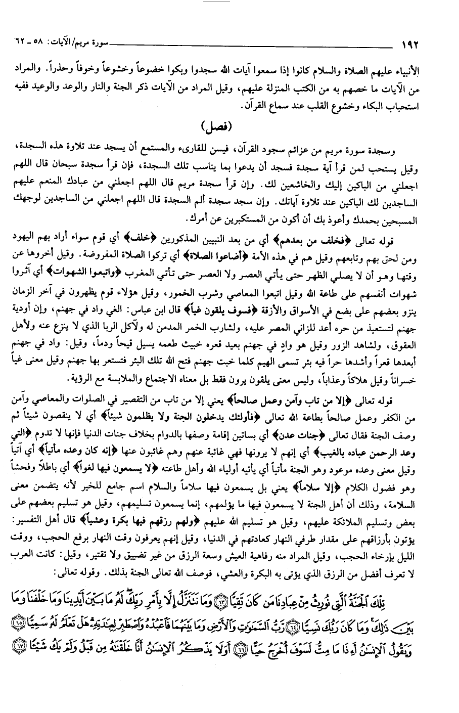قوله تعالى إِلَّا مَنْ تابَ وَآمَنَ وَعَمِلَ صالِحاً يعني إلا من تاب من التقصير في الصلوات والمعاصي وآمن من الكفر وعمل صالحا بطاعة الله تعالى فَأُولئِكَ يَدْخُلُونَ الْجَنَّةَ وَلا يُظْلَمُونَ شَيْئاً أي لا ينقصون شيئا ثم وصف الجنة فقال تعالى جَنَّاتِ عَدْنٍ أي بساتين إقامة وصفها بالدوام بخلاف جنات الدنيا فإنها لا تدوم الَّتِي وَعَدَ الرَّحْمنُ عِبادَهُ بِالْغَيْبِ أي إنهم لا يرونها فهي غائبة عنهم وهم غائبون عنها إِنَّهُ كانَ وَعْدُهُ مَأْتِيًّا أي آتيا وقيل معنى وعده موعود وهو الجنة مأتيا أي يأتيه أولياء الله وأهل طاعته لا يَسْمَعُونَ فِيها لَغْواً أي باطلا وفحشا وهو فضول الكلام إِلَّا سَلاماً يعني بل يسمعون فيها سلاما والسلام اسم جامع للخير لأنه يتضمن معنى السلامة، وذلك أن أهل الجنة لا يسمعون فيها ما يؤلمهم، إنما يسمعون تسليمهم، وقيل هو تسليم بعضهم على بعض وتسليم الملائكة عليهم، وقيل هو تسليم الله عليهم وَلَهُمْ رِزْقُهُمْ فِيها بُكْرَةً وَعَشِيًّا قال أهل التفسير: