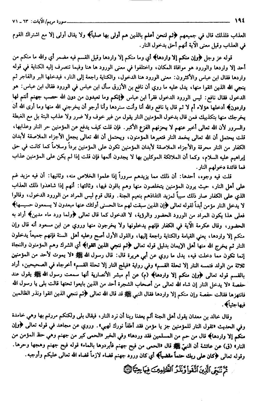 قوله عز وجل وَإِنْ مِنْكُمْ إِلَّا وارِدُها أي وما منكم إلا واردها وقيل القسم فيه مضمر أي والله ما منكم من أحد إلا واردها والورود هو موافاة المكان، واختلفوا في معنى الورود ها هنا وفيما تنصرف إليه الكناية في قوله واردها فقال ابن عباس والأكثرون: معنى الورود هنا الدخول، والكناية راجعة إلى النار، فيدخلها البر والفاجر ثم ينجي الله الذين اتقوا منها، يدل عليه ما روي أن نافع بن الأزرق سأل ابن عباس في الورود فقال ابن عباس: هو الدخول فقال نافع: ليس الورود الدخول فقرأ ابن عباس إِنَّكُمْ وَما تَعْبُدُونَ مِنْ دُونِ اللَّهِ حَصَبُ جَهَنَّمَ أَنْتُمْ لَها وارِدُونَ أدخلها هؤلاء أم لا ثم قال يا نافع والله أنا وأنت سنردها وأنا أرجو أن يخرجني الله منها وما أرى الله أن يخرجك منها بتكذيبك فمن قال بدخول المؤمنين النار يقول من غير خوف ولا ضرر ولا عذاب البتة بل مع الغبطة والسرور لأن الله تعالى أخبر عنهم لا يحزنهم الفزع الأكبر. فإن قلت كيف يدفع عن المؤمنين حر النار وعذابها، قلت يحتمل أن الله تعالى يخمد النار فتعبرها المؤمنون، ويحتمل أن الله تعالى يجعل الأجزاء الملاصقة لأبدان الكفار من النار محرقة والأجزاء الملاصقة لأبدان المؤمنين تكون على المؤمنين بردا وسلاما كما كانت في حق إبراهيم عليه السلام، وكما أن الملائكة الموكلين بها لا يجدون ألمها فإن قلت إذا لم يكن على المؤمنين عذاب فما فائدة دخولهم النار.