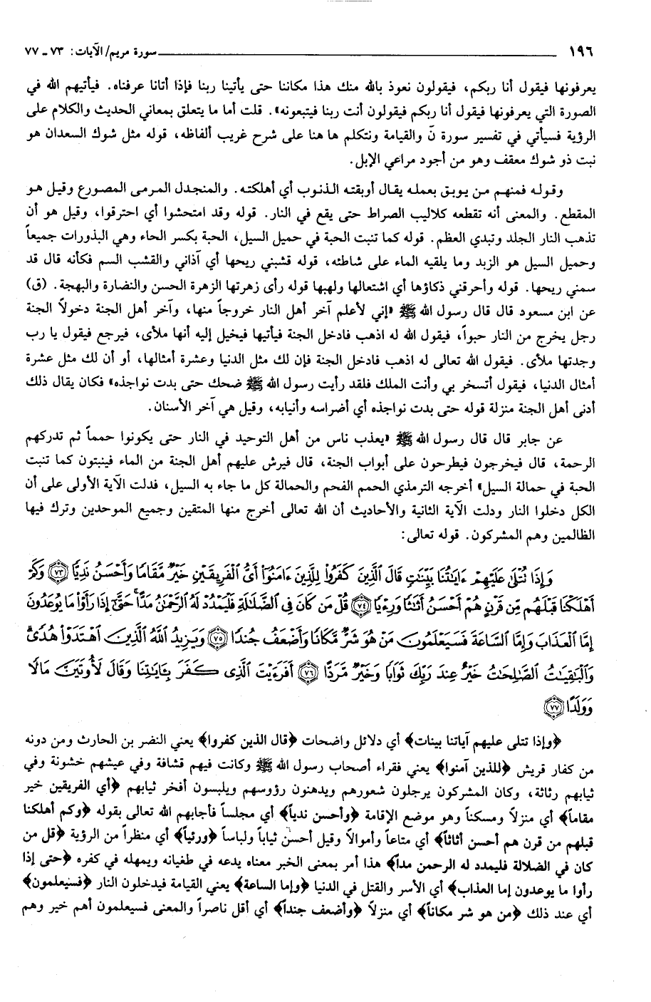 وَإِذا تُتْلى عَلَيْهِمْ آياتُنا بَيِّناتٍ قالَ الَّذِينَ كَفَرُوا لِلَّذِينَ آمَنُوا أَيُّ الْفَرِيقَيْنِ خَيْرٌ مَقاماً وَأَحْسَنُ نَدِيًّا (73) وَكَمْ أَهْلَكْنا قَبْلَهُمْ مِنْ قَرْنٍ هُمْ أَحْسَنُ أَثاثاً وَرِءْياً (74) قُلْ مَنْ كانَ فِي الضَّلالَةِ فَلْيَمْدُدْ لَهُ الرَّحْمنُ مَدًّا حَتَّى إِذا رَأَوْا ما يُوعَدُونَ إِمَّا الْعَذابَ وَإِمَّا السَّاعَةَ فَسَيَعْلَمُونَ مَنْ هُوَ شَرٌّ مَكاناً وَأَضْعَفُ جُنْداً (75) وَيَزِيدُ اللَّهُ الَّذِينَ اهْتَدَوْا هُدىً وَالْباقِياتُ الصَّالِحاتُ خَيْرٌ عِنْدَ رَبِّكَ ثَواباً وَخَيْرٌ مَرَدًّا (76) أَفَرَأَيْتَ الَّذِي كَفَرَ بِآياتِنا وَقالَ لَأُوتَيَنَّ مالاً وَوَلَداً (77)