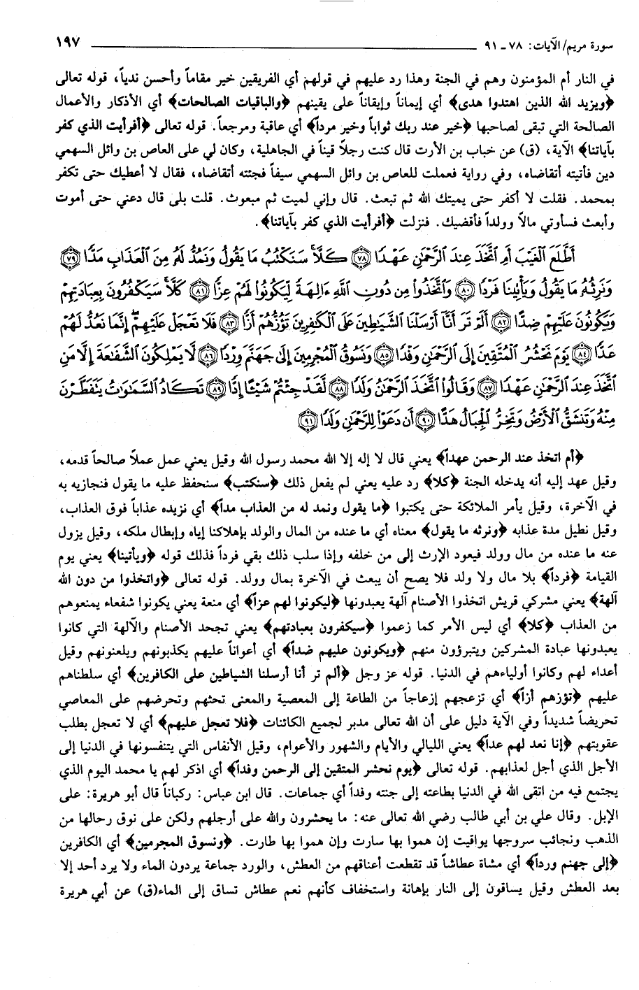 أَطَّلَعَ الْغَيْبَ أَمِ اتَّخَذَ عِنْدَ الرَّحْمنِ عَهْداً (78) كَلاَّ سَنَكْتُبُ ما يَقُولُ وَنَمُدُّ لَهُ مِنَ الْعَذابِ مَدًّا (79) وَنَرِثُهُ ما يَقُولُ وَيَأْتِينا فَرْداً (80) وَاتَّخَذُوا مِنْ دُونِ اللَّهِ آلِهَةً لِيَكُونُوا لَهُمْ عِزًّا (81) كَلاَّ سَيَكْفُرُونَ بِعِبادَتِهِمْ وَيَكُونُونَ عَلَيْهِمْ ضِدًّا (82)