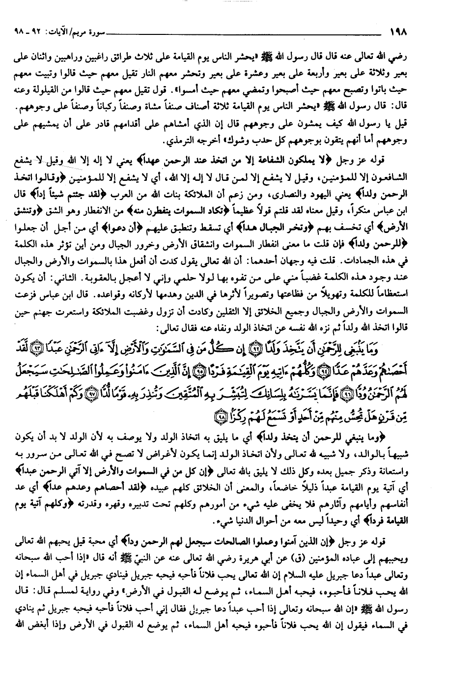 وَما يَنْبَغِي لِلرَّحْمنِ أَنْ يَتَّخِذَ وَلَداً (92) إِنْ كُلُّ مَنْ فِي السَّماواتِ وَالْأَرْضِ إِلاَّ آتِي الرَّحْمنِ عَبْداً (93) لَقَدْ أَحْصاهُمْ وَعَدَّهُمْ عَدًّا (94) وَكُلُّهُمْ آتِيهِ يَوْمَ الْقِيامَةِ فَرْداً (95) إِنَّ الَّذِينَ آمَنُوا وَعَمِلُوا الصَّالِحاتِ سَيَجْعَلُ لَهُمُ الرَّحْمنُ وُدًّا (96)