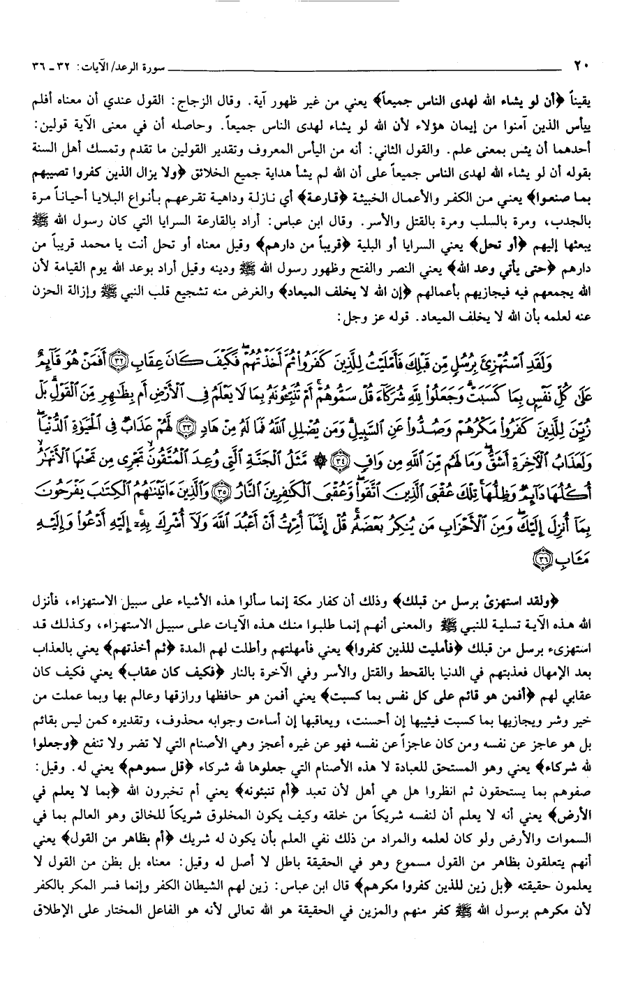 وَلَقَدِ اسْتُهْزِئَ بِرُسُلٍ مِنْ قَبْلِكَ فَأَمْلَيْتُ لِلَّذِينَ كَفَرُوا ثُمَّ أَخَذْتُهُمْ فَكَيْفَ كانَ عِقابِ (32) أَفَمَنْ هُوَ قائِمٌ عَلى كُلِّ نَفْسٍ بِما كَسَبَتْ وَجَعَلُوا لِلَّهِ شُرَكاءَ قُلْ سَمُّوهُمْ أَمْ تُنَبِّئُونَهُ بِما لا يَعْلَمُ فِي الْأَرْضِ أَمْ بِظاهِرٍ مِنَ الْقَوْلِ بَلْ زُيِّنَ لِلَّذِينَ كَفَرُوا مَكْرُهُمْ وَصُدُّوا عَنِ السَّبِيلِ وَمَنْ يُضْلِلِ اللَّهُ فَما لَهُ مِنْ هادٍ (33) لَهُمْ عَذابٌ فِي الْحَياةِ الدُّنْيا وَلَعَذابُ الْآخِرَةِ أَشَقُّ وَما لَهُمْ مِنَ اللَّهِ مِنْ واقٍ (34) مَثَلُ الْجَنَّةِ الَّتِي وُعِدَ الْمُتَّقُونَ تَجْرِي مِنْ تَحْتِهَا الْأَنْهارُ أُكُلُها دائِمٌ وَظِلُّها تِلْكَ عُقْبَى الَّذِينَ اتَّقَوْا وَعُقْبَى الْكافِرِينَ النَّارُ (35) وَالَّذِينَ آتَيْناهُمُ الْكِتابَ يَفْرَحُونَ بِما أُنْزِلَ إِلَيْكَ وَمِنَ الْأَحْزابِ مَنْ يُنْكِرُ بَعْضَهُ قُلْ إِنَّما أُمِرْتُ أَنْ أَعْبُدَ اللَّهَ وَلا أُشْرِكَ بِهِ إِلَيْهِ أَدْعُوا وَإِلَيْهِ مَآبِ (36)