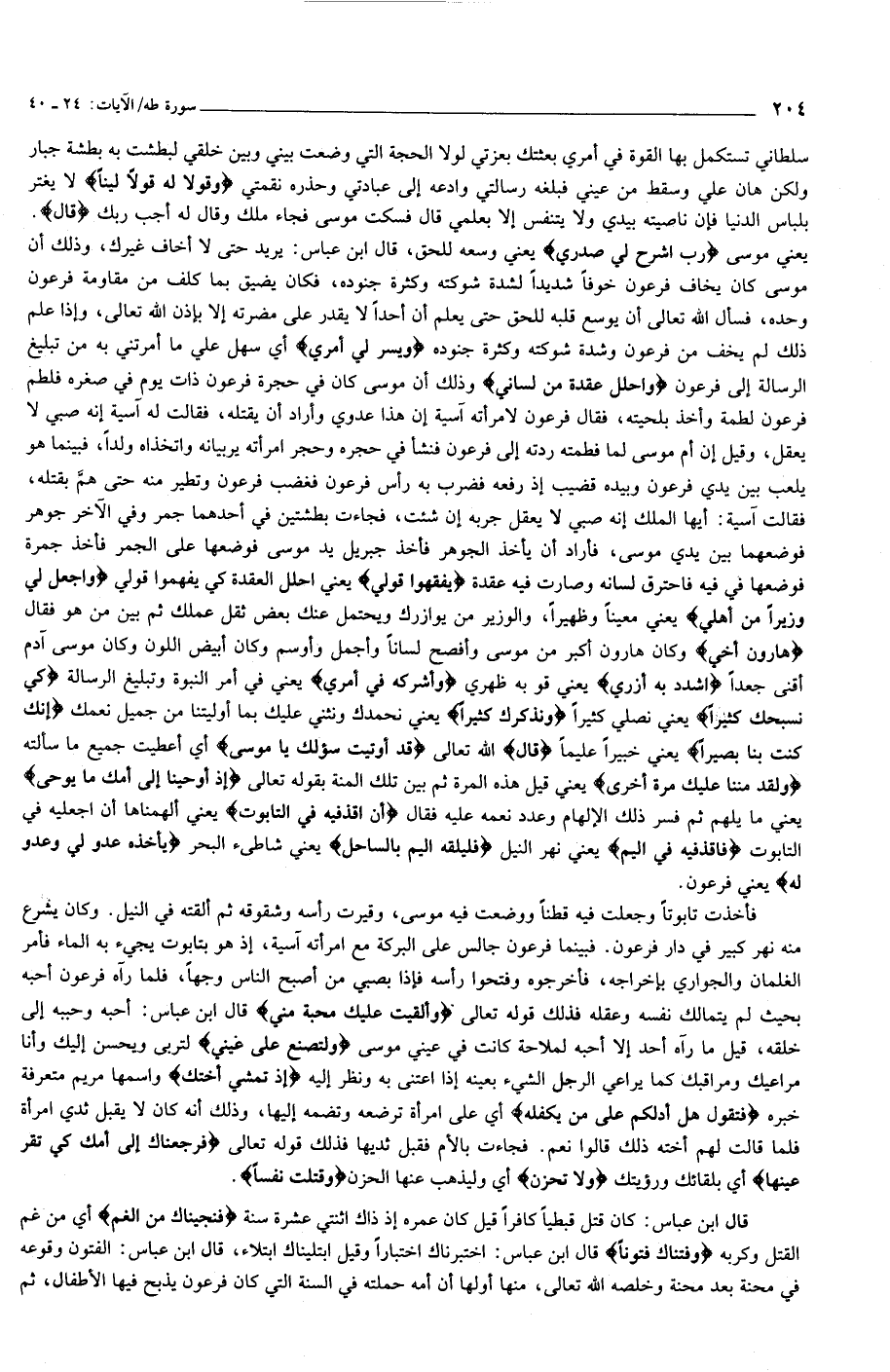 يعني موسى رَبِّ اشْرَحْ لِي صَدْرِي يعني وسعه للحق، قال ابن عباس: يريد حتى لا أخاف غيرك، وذلك أن موسى كان يخاف فرعون خوفا شديدا لشدة شوكته وكثرة جنوده، فكان يضيق بما كلف من مقاومة فرعون وحده، فسأل الله تعالى أن يوسع قلبه للحق حتى يعلم أن أحدا لا يقدر على مضرته إلا بإذن الله تعالى، وإذا علم ذلك لم يخف من فرعون وشدة شوكته وكثرة جنوده وَيَسِّرْ لِي أَمْرِي أي سهل علي ما أمرتني به من تبليغ الرسالة إلى فرعون وَاحْلُلْ عُقْدَةً مِنْ لِسانِي وذلك أن موسى كان في حجرة فرعون ذات يوم في صغره فلطم فرعون لطمة وأخذ بلحيته، فقال فرعون لامرأته آسية إن هذا عدوي وأراد أن يقتله، فقالت له آسية إنه صبي لا يعقل، وقيل إن أم موسى لما فطمته ردته إلى فرعون فنشأ في حجره وحجر امرأته يربيانه واتخذاه ولدا، فبينما هو يلعب بين يدي فرعون وبيده قضيب إذ رفعه فضرب به رأس فرعون فغضب فرعون وتطير منه حتى همّ بقتله، فقالت آسية: أيها الملك إنه صبي لا يعقل جربه إن شئت، فجاءت بطشتين في أحدهما جمر وفي الآخر جوهر فوضعهما بين يدي موسى، فأراد أن يأخذ الجوهر فأخذ جبريل يد موسى فوضعها على الجمر فأخذ جمرة فوضعها في فيه فاحترق لسانه وصارت فيه عقدة يَفْقَهُوا قَوْلِي يعني احلل العقدة كي يفهموا قولي وَاجْعَلْ لِي وَزِيراً مِنْ أَهْلِي يعني معينا وظهيرا، والوزير من يوازرك ويحتمل عنك بعض ثقل عملك ثم بين من هو فقال هارُونَ أَخِي وكان هارون أكبر من موسى وأفصح لسانا وأجمل وأوسم وكان أبيض اللون وكان موسى آدم أقنى جعدا اشْدُدْ بِهِ أَزْرِي يعني قو به ظهري وَأَشْرِكْهُ فِي أَمْرِي يعني في أمر النبوة وتبليغ الرسالة كَيْ نُسَبِّحَكَ كَثِيراً يعني نصلي كثيرا وَنَذْكُرَكَ كَثِيراً يعني نحمدك ونثني عليك بما أوليتنا من جميل نعمك إِنَّكَ كُنْتَ بِنا بَصِيراً يعني خبيرا عليما قالَ الله تعالى قَدْ أُوتِيتَ سُؤْلَكَ يا مُوسى أي أعطيت جميع ما سألته وَلَقَدْ مَنَنَّا عَلَيْكَ مَرَّةً أُخْرى يعني قيل هذه المرة ثم بين تلك المنة بقوله تعالى إِذْ أَوْحَيْنا إِلى أُمِّكَ ما يُوحى يعني ما يلهم ثم فسر ذلك الإلهام وعدد نعمه عليه فقال أَنِ اقْذِفِيهِ فِي التَّابُوتِ يعني ألهمناها أن اجعليه في التابوت فَاقْذِفِيهِ فِي الْيَمِّ يعني نهر النيل فَلْيُلْقِهِ الْيَمُّ بِالسَّاحِلِ يعني شاطئ البحر يَأْخُذْهُ عَدُوٌّ لِي وَعَدُوٌّ لَهُ يعني فرعون.