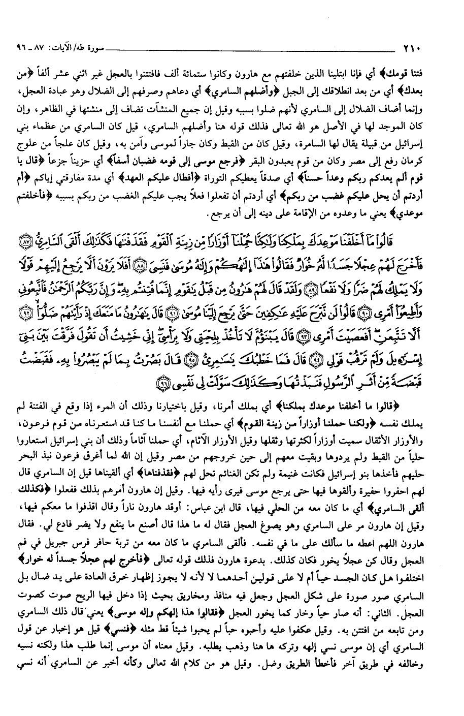 قالُوا ما أَخْلَفْنا مَوْعِدَكَ بِمَلْكِنا وَلكِنَّا حُمِّلْنا أَوْزاراً مِنْ زِينَةِ الْقَوْمِ فَقَذَفْناها فَكَذلِكَ أَلْقَى السَّامِرِيُّ (87) فَأَخْرَجَ لَهُمْ عِجْلاً جَسَداً لَهُ خُوارٌ فَقالُوا هذا إِلهُكُمْ وَإِلهُ مُوسى فَنَسِيَ (88) أَفَلا يَرَوْنَ أَلاَّ يَرْجِعُ إِلَيْهِمْ قَوْلاً وَلا يَمْلِكُ لَهُمْ ضَرًّا وَلا نَفْعاً (89) وَلَقَدْ قالَ لَهُمْ هارُونُ مِنْ قَبْلُ يا قَوْمِ إِنَّما فُتِنْتُمْ بِهِ وَإِنَّ رَبَّكُمُ الرَّحْمنُ فَاتَّبِعُونِي وَأَطِيعُوا أَمْرِي (90) قالُوا لَنْ نَبْرَحَ عَلَيْهِ عاكِفِينَ حَتَّى يَرْجِعَ إِلَيْنا مُوسى (91)