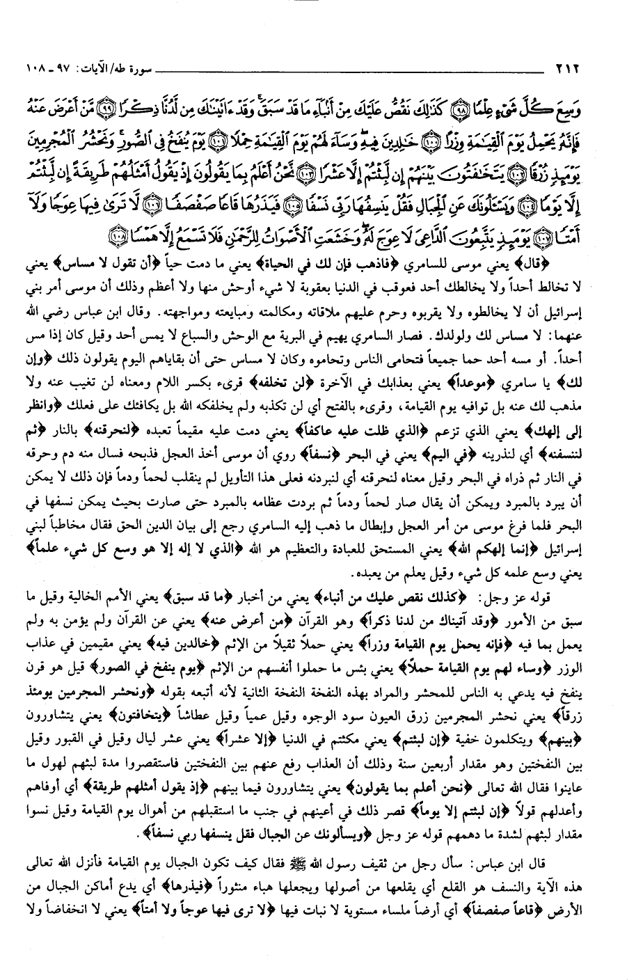 قوله عز وجل: كَذلِكَ نَقُصُّ عَلَيْكَ مِنْ أَنْباءِ يعني من أخبار ما قَدْ سَبَقَ يعني الأمم الخالية وقيل ما سبق من الأمور وَقَدْ آتَيْناكَ مِنْ لَدُنَّا ذِكْراً وهو القرآن مَنْ أَعْرَضَ عَنْهُ يعني عن القرآن ولم يؤمن به ولم يعمل بما فيه فَإِنَّهُ يَحْمِلُ يَوْمَ الْقِيامَةِ وِزْراً يعني حملا ثقيلا من الإثم خالِدِينَ فِيهِ يعني مقيمين في عذاب الوزر وَساءَ لَهُمْ يَوْمَ الْقِيامَةِ حِمْلًا يعني بئس ما حملوا أنفسهم من الإثم يَوْمَ يُنْفَخُ فِي الصُّورِ قيل هو قرن ينفخ فيه يدعي به الناس للمحشر والمراد بهذه النفخة النفخة الثانية لأنه أتبعه بقوله وَنَحْشُرُ الْمُجْرِمِينَ يَوْمَئِذٍ زُرْقاً يعني نحشر المجرمين زرق العيون سود الوجوه وقيل عميا وقيل عطاشا يَتَخافَتُونَ يعني يتشاورون بَيْنَهُمْ ويتكلمون خفية إِنْ لَبِثْتُمْ يعني مكثتم في الدنيا إِلَّا عَشْراً يعني عشر ليال وقيل في القبور وقيل بين النفختين وهو مقدار أربعين سنة وذلك أن العذاب رفع عنهم بين النفختين فاستقصروا مدة لبثهم لهول ما عاينوا فقال الله تعالى نَحْنُ أَعْلَمُ بِما يَقُولُونَ يعني يتشاورون فيما بينهم إِذْ يَقُولُ أَمْثَلُهُمْ طَرِيقَةً أي أوفاهم وأعدلهم قولا إِنْ لَبِثْتُمْ إِلَّا يَوْماً قصر ذلك في أعينهم في جنب ما استقبلهم من أهوال يوم القيامة وقيل نسوا مقدار لبثهم لشدة ما دهمهم قوله عز وجل وَيَسْئَلُونَكَ عَنِ الْجِبالِ فَقُلْ يَنْسِفُها رَبِّي نَسْفاً.