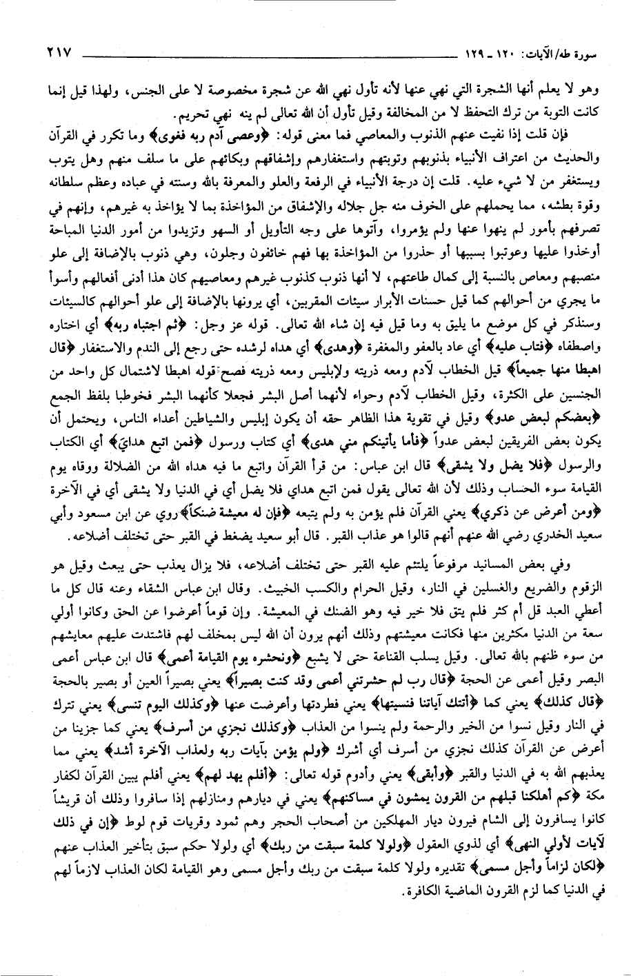 فإن قلت إذا نفيت عنهم الذنوب والمعاصي فما معنى قوله: وَعَصى آدَمُ رَبَّهُ فَغَوى وما تكرر في القرآن والحديث من اعتراف الأنبياء بذنوبهم وتوبتهم واستغفارهم وإشفاقهم وبكائهم على ما سلف منهم وهل يتوب ويستغفر من لا شيء عليه. قلت إن درجة الأنبياء في الرفعة والعلو والمعرفة بالله وسنته في عباده وعظم سلطانه وقوة بطشه، مما يحملهم على الخوف منه جل جلاله والإشفاق من المؤاخذة بما لا يؤاخذ به غيرهم، وإنهم في تصرفهم بأمور لم ينهوا عنها ولم يؤمروا، وآتوها على وجه التأويل أو السهو وتزيدوا من أمور الدنيا المباحة أو خذوا عليها وعوتبوا بسببها أو حذروا من المؤاخذة بها فهم خائفون وجلون، وهي ذنوب بالإضافة إلى علو منصبهم ومعاص بالنسبة إلى كمال طاعتهم، لا أنها ذنوب كذنوب غيرهم ومعاصيهم كان هذا أدنى أفعالهم وأسوأ ما يجري من أحوالهم كما قيل حسنات الأبرار سيئات المقربين، أي يرونها بالإضافة إلى علو أحوالهم كالسيئات وسنذكر في كل موضع ما يليق به وما قيل فيه إن شاء الله تعالى. قوله عز وجل: ثُمَّ اجْتَباهُ رَبُّهُ أي اختاره واصطفاه فَتابَ عَلَيْهِ أي عاد بالعفو والمغفرة وَهَدى أي هداه لرشده حتى رجع إلى الندم والاستغفار قالَ اهْبِطا مِنْها جَمِيعاً قيل الخطاب لآدم ومعه ذريته ولإبليس ومعه ذريته فصح قوله اهبطا لاشتمال كل واحد من الجنسين على الكثرة، وقيل الخطاب لآدم ومعه ذريته ولإبليس ومعه ذريته فصح قوله اهبطا لاشتمال كل واحد من الجنسين على الكثرة، وقيل الخطاب لآدم وحواء لأنهما أصل البشر فجعلا كأنهما البشر فخوطبا بلفظ الجمع بَعْضُكُمْ لِبَعْضٍ عَدُوٌّ وقيل في تقوية هذا الظاهر حقه أن يكون إبليس والشياطين أعداء الناس، ويحتمل أن يكون بعض الفريقين لبعض عدوا فَإِمَّا يَأْتِيَنَّكُمْ مِنِّي هُدىً أي كتاب ورسول فَمَنِ اتَّبَعَ هُدايَ أي الكتاب والرسول فَلا يَضِلُّ وَلا يَشْقى قال ابن عباس: من قرأ القرآن واتبع ما فيه هداه الله من الضلالة ووقاه يوم القيامة سوء الحساب وذلك لأن الله تعالى يقول فمن اتبع هداي فلا يضل أي في الدنيا ولا يشقى أي في الآخرة وَمَنْ أَعْرَضَ عَنْ ذِكْرِي يعني القرآن فلم يؤمن به ولم يتبعه فَإِنَّ لَهُ مَعِيشَةً ضَنْكاً روي عن ابن مسعود وأبي سعيد الخدري رضي الله عنهم أنهم قالوا هو عذاب القبر. قال أبو سعيد يضغط في القبر حتى تختلف أضلاعه.