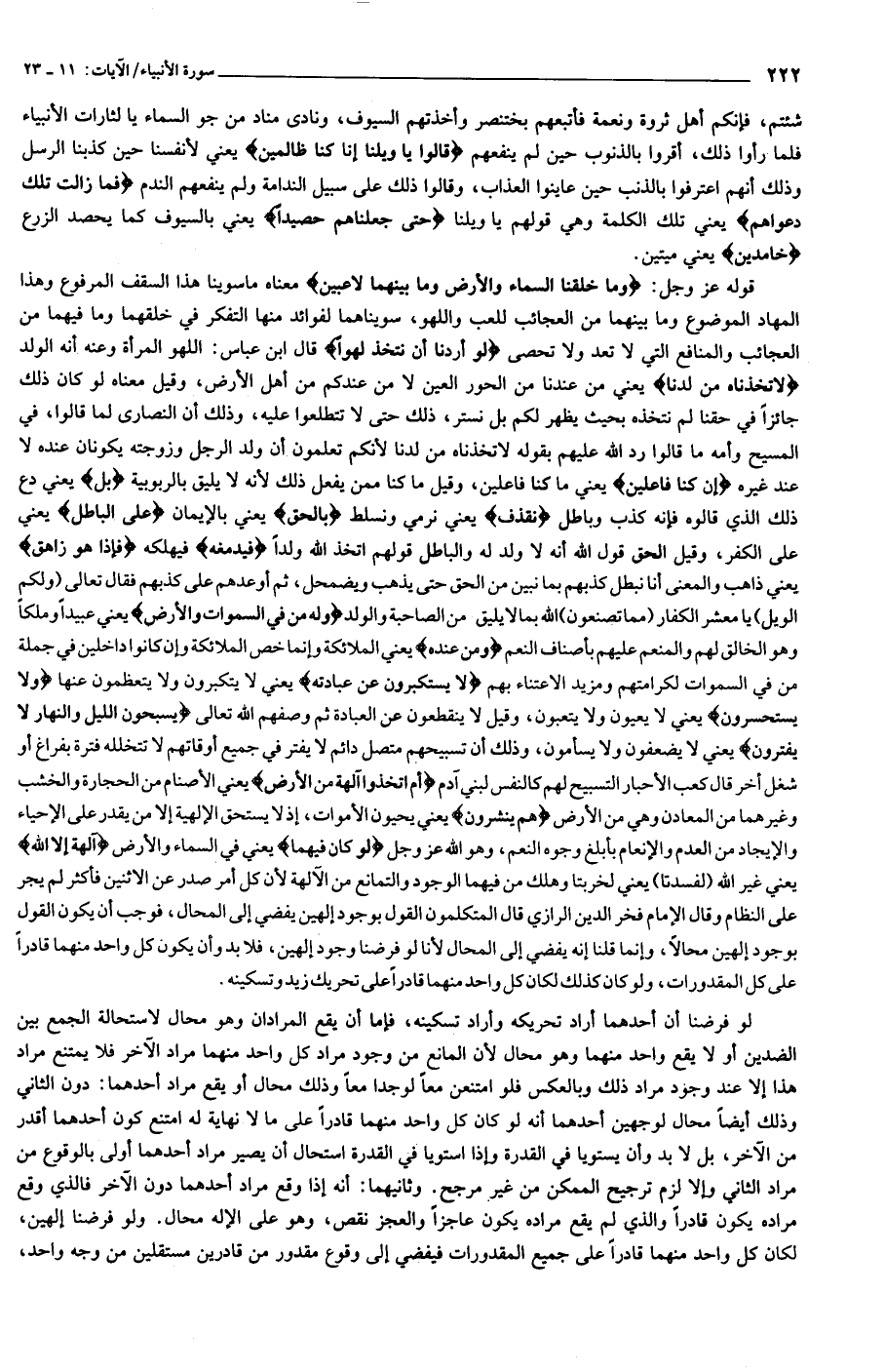 قوله عز وجل: وَما خَلَقْنَا السَّماءَ وَالْأَرْضَ وَما بَيْنَهُما لاعِبِينَ معناه ما سوينا هذا السقف المرفوع وهذا المهاد الموضوع وما بينهما من العجائب للعب واللهو، سويناهما لفوائد منها التفكر في خلقهما وما فيهما من العجائب والمنافع التي لا تعد ولا تحصى لَوْ أَرَدْنا أَنْ نَتَّخِذَ لَهْواً قال ابن عباس: اللهو المرأة وعنه أنه الولد لَاتَّخَذْناهُ مِنْ لَدُنَّا يعني من عندنا من الحور العين لا من عندكم من أهل الأرض، وقيل معناه لو كان ذلك جائزا في حقنا لم نتخذه بحيث يظهر لكم بل نستر، ذلك حتى لا تتطلعوا عليه، وذلك أن النصارى لما قالوا، في المسيح وأمه ما قالوا رد الله عليهم بقوله لاتخذناه من لدنا لأنكم تعلمون أن ولد الرجل وزوجته يكونان عنده لا عند غيره إِنْ كُنَّا فاعِلِينَ يعني ما كنا فاعلين، وقيل ما كنا ممن يفعل ذلك لأنه لا يليق بالربوبية بَلْ يعني دع ذلك الذي قالوه فإنه كذب وباطل نَقْذِفُ يعني نرمي ونسلط بِالْحَقِّ يعني بالإيمان عَلَى الْباطِلِ يعني على الكفر، وقيل الحق قول الله أنه لا ولد له والباطل قولهم اتخذ الله ولدا فَيَدْمَغُهُ فيهلكه فَإِذا هُوَ زاهِقٌ يعني ذاهب والمعنى أنا نبطل كذبهم بما نبين من الحق حتى يذهب ويضمحل، ثم أوعدهم على كذبهم فقال تعالى (وَلَكُمُ الْوَيْلُ) يا معشر الكفار (مِمَّا تَصِفُونَ) الله بما لا يليق من الصاحبة والولد وَلَهُ مَنْ فِي السَّماواتِ وَالْأَرْضِ يعني عبيدا وملكا وهو الخالق لهم والمنعم عليهم بأصناف النعم وَمَنْ عِنْدَهُ يعني الملائكة وإنما خص الملائكة وإن كانوا داخلين في جملة من في السموات لكرامتهم ومزيد الاعتناء بهم لا يَسْتَكْبِرُونَ عَنْ عِبادَتِهِ يعني لا يتكبرون ولا يتعظمون عنها وَلا يَسْتَحْسِرُونَ يعني لا يعيون ولا يتعبون، وقيل لا ينقطعون عن العبادة ثم وصفهم الله تعالى يُسَبِّحُونَ اللَّيْلَ وَالنَّهارَ لا يَفْتُرُونَ يعني لا يضعفون ولا يسأمون، وذلك أن تسبيحهم متصل دائم لا يفتر في جميع أوقاتهم لا تتخلله فترة بفراغ أو شغل أخر قال كعب الأحبار التسبيح لهم كالنفس لبني آدم أَمِ اتَّخَذُوا آلِهَةً مِنَ الْأَرْضِ يعني الأصنام من الحجارة والخشب وغيرهما من المعادن وهي من الأرض هُمْ يُنْشِرُونَ يعني يحيون الأموات، إذ لا يستحق الإلهية إلا من يقدر على الإحياء والإيجاد من العدم والإنعام بأبلغ وجوه النعم، وهو الله عز وجل لَوْ كانَ فِيهِما يعني في السماء والأرض آلِهَةٌ إِلَّا اللَّهُ يعني غير الله (لفسدتا) يعني لخربتا وهلك من فيهما الوجود والتمانع من الآلهة لأن كل أمر صدر عن الاثنين فأكثر لم يجر على النظام وقال الإمام فخر الدين الرازي قال المتكلمون القول بوجود إلهين يفضي إلى المحال، فوجب أن يكون القول بوجود إلهين محالا، وإنما قلنا إنه يفضي إلى المحال لأنا لو فرضنا وجود إلهين، فلا بد وأن يكون كل واحد منهما قادرا على كل المقدورات، ولو كان كذلك لكان كل واحد منهما قادرا على تحريك زيد وتسكينه.