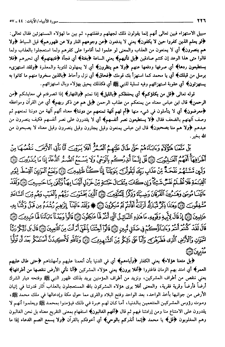 بَلْ مَتَّعْنا هؤُلاءِ وَآباءَهُمْ حَتَّى طالَ عَلَيْهِمُ الْعُمُرُ أَفَلا يَرَوْنَ أَنَّا نَأْتِي الْأَرْضَ نَنْقُصُها مِنْ أَطْرافِها أَفَهُمُ الْغالِبُونَ (44) قُلْ إِنَّما أُنْذِرُكُمْ بِالْوَحْيِ وَلا يَسْمَعُ الصُّمُّ الدُّعاءَ إِذا ما يُنْذَرُونَ (45) وَلَئِنْ مَسَّتْهُمْ نَفْحَةٌ مِنْ عَذابِ رَبِّكَ لَيَقُولُنَّ يا وَيْلَنا إِنَّا كُنَّا ظالِمِينَ (46) وَنَضَعُ الْمَوازِينَ الْقِسْطَ لِيَوْمِ الْقِيامَةِ فَلا تُظْلَمُ نَفْسٌ شَيْئاً وَإِنْ كانَ مِثْقالَ حَبَّةٍ مِنْ خَرْدَلٍ أَتَيْنا بِها وَكَفى بِنا حاسِبِينَ (47) وَلَقَدْ آتَيْنا مُوسى وَهارُونَ الْفُرْقانَ وَضِياءً وَذِكْراً لِلْمُتَّقِينَ (48)