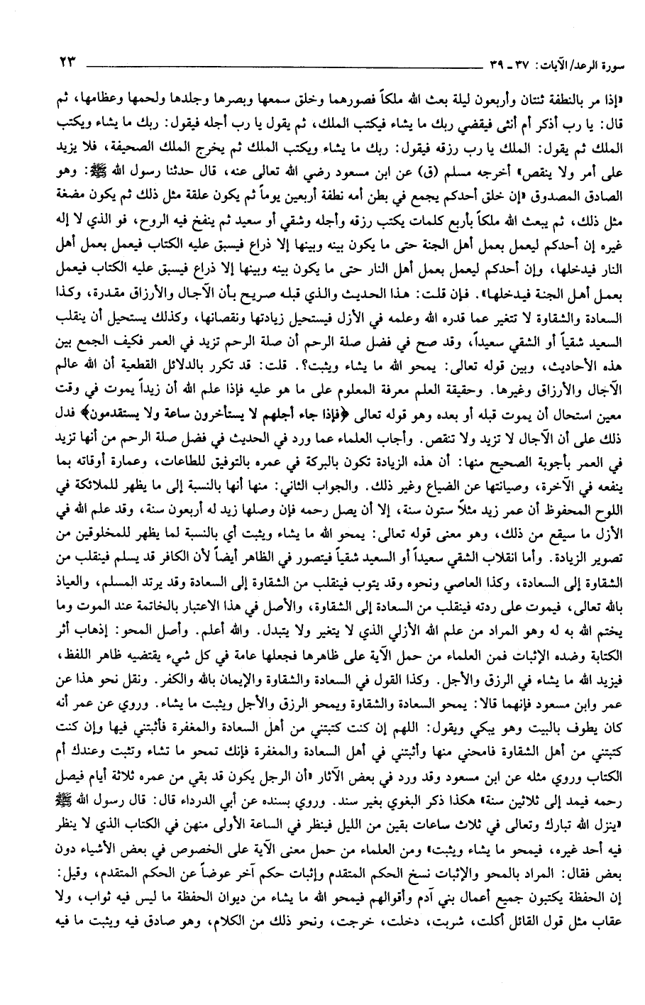 ويكتب الملك ثم يخرج الملك الصحيفة، فلا يزيد على أمر ولا ينقص» أخرجه مسلم (ق) عن ابن مسعود رضي الله تعالى عنه، قال حدثنا رسول الله صلّى الله عليه وسلّم: وهو الصادق المصدوق «إن خلق أحدكم يجمع في بطن أمه نطفة أربعين يوما ثم يكون علقة مثل ذلك ثم يكون مضغة مثل ذلك، ثم يبعث الله ملكا بأربع كلمات يكتب رزقه وأجله وشقي أو سعيد ثم ينفخ فيه الروح، فو الذي لا إله غيره إن أحدكم ليعمل بعمل أهل الجنة حتى ما يكون بينه وبينها إلا ذراع فيسبق عليه الكتاب فيعمل بعمل أهل النار فيدخلها، وإن أحدكم ليعمل بعمل أهل النار حتى ما يكون بينه وبينها إلا ذراع فيسبق عليه الكتاب فيعمل بعمل أهل الجنة فيدخلها». فإن قلت: هذا الحديث والذي قبله صريح بأن الآجال والأرزاق مقدرة، وكذا السعادة والشقاوة لا تتغير عما قدره الله وعلمه في الأزل فيستحيل زيادتها ونقصانها، وكذلك يستحيل أن ينقلب السعيد شقيا أو الشقي سعيدا، وقد صح في فضل صلة الرحم أن صلة الرحم تزيد في العمر فكيف الجمع بين هذه الأحاديث، وبين قوله تعالى: يمحو الله ما يشاء ويثبت؟. قلت: قد تكرر بالدلائل القطعية أن الله عالم الآجال والأرزاق وغيرها. وحقيقة العلم معرفة المعلوم على ما هو عليه فإذا علم الله أن زيدا يموت في وقت معين استحال أن يموت قبله أو بعده وهو قوله تعالى فَإِذا جاءَ أَجَلُهُمْ لا يَسْتَأْخِرُونَ ساعَةً وَلا يَسْتَقْدِمُونَ فدل ذلك على أن الآجال لا تزيد ولا تنقص. وأجاب العلماء عما ورد في الحديث في فضل صلة الرحم من أنها تزيد في العمر بأجوبة الصحيح منها: أن هذه الزيادة تكون بالبركة في عمره بالتوفيق للطاعات، وعمارة أوقاته بما ينفعه في الآخرة، وصيانتها عن الضياع وغير ذلك. والجواب الثاني: منها أنها بالنسبة إلى ما يظهر للملائكة في اللوح المحفوظ أن عمر زيد مثلا ستون سنة، إلا أن يصل رحمه فإن وصلها زيد له أربعون سنة، وقد علم الله في الأزل ما سيقع من ذلك، وهو معنى قوله تعالى: يمحو الله ما يشاء ويثبت أي بالنسبة لما يظهر للمخلوقين من تصوير الزيادة. وأما انقلاب الشقي سعيدا أو السعيد شقيا فيتصور في الظاهر أيضا لأن الكافر قد يسلم فينقلب من الشقاوة إلى السعادة، وكذا العاصي ونحوه وقد يتوب فينقلب من الشقاوة إلى السعادة وقد يرتد المسلم، والعياذ بالله تعالى، فيموت على ردته فينقلب من السعادة إلى الشقاوة، والأصل في هذا الاعتبار بالخاتمة عند الموت وما يختم الله به له وهو المراد من علم الله الأزلي الذي لا يتغير ولا يتبدل. والله أعلم. وأصل المحو: إذهاب أثر الكتابة وضده الإثبات فمن العلماء من حمل الآية على ظاهرها فجعلها عامة في كل شيء يقتضيه ظاهر اللفظ، فيزيد الله ما يشاء في الرزق والأجل. وكذا القول في السعادة والشقاوة والإيمان بالله والكفر. ونقل نحو هذا عن عمر وابن مسعود فإنهما قالا: يمحو السعادة والشقاوة ويمحو الرزق والأجل ويثبت ما يشاء. وروي عن عمر أنه كان يطوف بالبيت وهو يبكي ويقول: اللهم إن كنت كتبتني من أهل السعادة والمغفرة فأثبتني فيها وإن كنت كتبتني من أهل الشقاوة فامحني منها وأثبتني في أهل السعادة والمغفرة فإنك تمحو ما تشاء وتثبت وعندك أم الكتاب وروي مثله عن ابن مسعود وقد ورد في بعض الآثار «أن الرجل يكون قد بقي من عمره ثلاثة أيام فيصل رحمه فيمد إلى ثلاثين سنة» هكذا ذكر البغوي بغير سند. وروي بسنده عن أبي الدرداء قال: قال رسول الله صلّى الله عليه وسلّم «ينزل الله تبارك وتعالى في ثلاث ساعات بقين من الليل فينظر في الساعة الأولى منهن في الكتاب الذي لا ينظر فيه أحد غيره، فيمحو ما يشاء ويثبت» ومن العلماء من حمل معنى الآية على الخصوص في بعض الأشياء دون بعض فقال: المراد بالمحو والإثبات نسخ الحكم المتقدم وإثبات حكم آخر عوضا عن الحكم المتقدم، وقيل:
