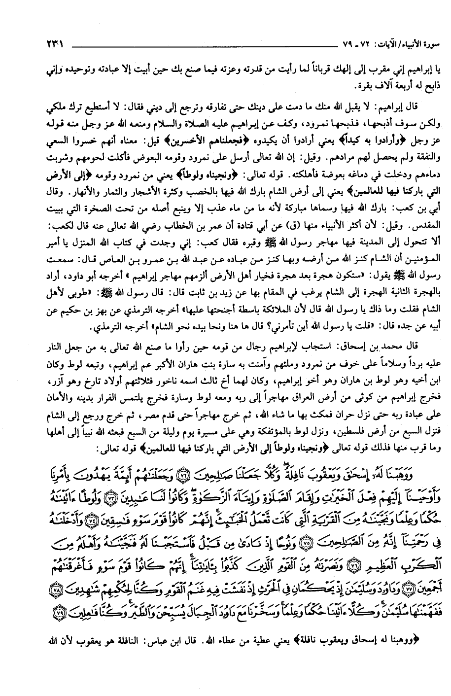 قال إبراهيم: لا يقبل الله منك ما دمت على دينك حتى تفارقه وترجع إلى ديني فقال: لا أستطيع ترك ملكي ولكن سوف أذبحها، فذبحها نمرود، وكف عن إبراهيم عليه الصلاة والسلام ومنعه الله عز وجل منه قوله عز وجل وَأَرادُوا بِهِ كَيْداً يعني أرادوا أن يكيدوه فَجَعَلْناهُمُ الْأَخْسَرِينَ قيل: معناه أنهم خسروا السعي والنفقة ولم يحصل لهم مرادهم. وقيل: إن الله تعالى أرسل على نمرود وقومه البعوض فأكلت لحومهم وشربت دماءهم ودخلت في دماغه بعوضة فأهلكته. قوله تعالى: وَنَجَّيْناهُ وَلُوطاً يعني من نمرود وقومه إِلَى الْأَرْضِ الَّتِي بارَكْنا فِيها لِلْعالَمِينَ يعني إلى أرض الشام بارك الله فيها بالخصب وكثرة الأشجار والثمار والأنهار. وقال أبي بن كعب: بارك الله فيها وسماها مباركة لأنه ما من ماء عذب إلا وينبع أصله من تحت الصخرة التي ببيت المقدس. وقيل: لأن أكثر الأنبياء منها (ق) عن أبي قتادة أن عمر بن الخطاب رضي الله تعالى عنه قال لكعب: