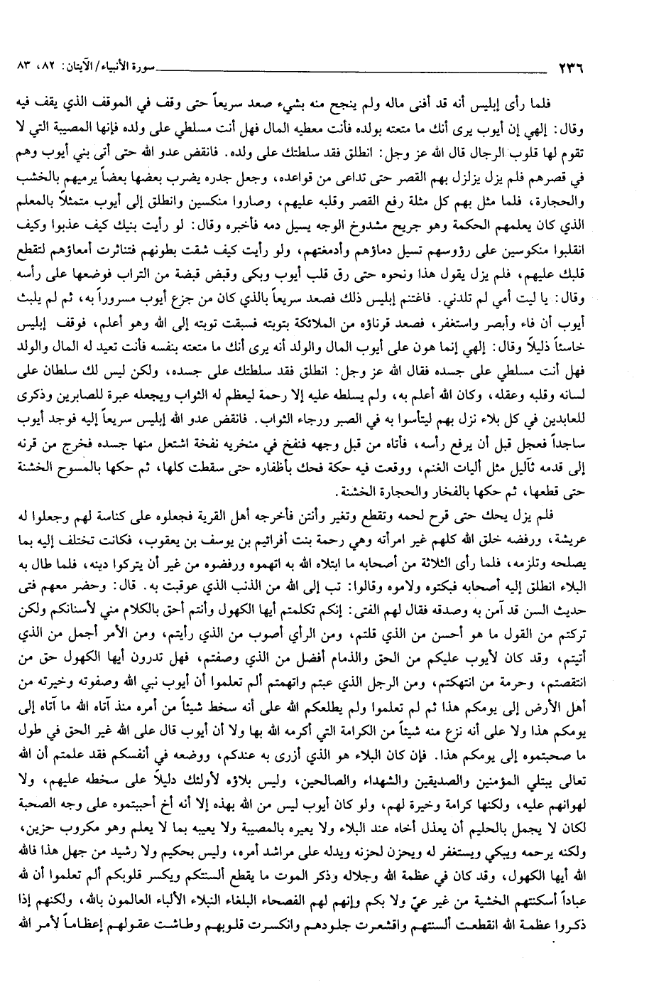 فلم يزل يحك حتى قرح لحمه وتقطع وتغير وأنتن فأخرجه أهل القرية فجعلوه على كناسة لهم وجعلوا له عريشة، ورفضه خلق الله كلهم غير امرأته وهي رحمة بنت أفرائيم بن يوسف بن يعقوب، فكانت تختلف إليه بما يصلحه وتلزمه، فلما رأى الثلاثة من أصحابه ما ابتلاه الله به اتهموه ورفضوه من غير أن يتركوا دينه، فلما طال به البلاء انطلق إليه أصحابه فبكتوه ولا موه وقالوا: تب إلى الله من الذنب الذي عوقبت به. قال: وحضر معهم فتى حديث السن قد آمن به وصدقه فقال لهم الفتى: إنكم تكلمتم أيها الكهول وأنتم أحق بالكلام مني لأسنانكم ولكن تركتم من القول ما هو أحسن من الذي قلتم، ومن الرأي أصوب من الذي رأيتم، ومن الأمر أجمل من الذي أتيتم، وقد كان لأيوب عليكم من الحق والذمام أفضل من الذي وصفتم، فهل تدرون أيها الكهول حق من انتقصتم، وحرمة من انتهكتم، ومن الرجل الذي عبتم واتهمتم ألم تعلموا أن أيوب نبي الله وصفوته وخيرته من أهل الأرض إلى يومكم هذا ثم لم تعلموا ولم يطلعكم الله على أنه سخط شيئا من أمره منذ آتاه الله ما آتاه إلى يومكم هذا ولا على أنه نزع منه شيئا من الكرامة التي أكرمه الله بها ولا أن أيوب قال على الله غير الحق في طول ما صحبتموه إلى يومكم هذا. فإن كان البلاء هو الذي أزرى به عندكم، ووضعه في أنفسكم فقد علمتم أن الله تعالى يبتلي المؤمنين والصديقين والشهداء والصالحين، وليس بلاؤه لأولئك دليلا على سخطه عليهم، ولا لهوانهم عليه، ولكنها كرامة وخيرة لهم، ولو كان أيوب ليس من الله بهذه إلا أنه أخ أحببتموه على وجه الصحبة لكان لا يجمل بالحليم أن يعذل أخاه عند البلاء ولا يعيره بالمصيبة ولا يعيبه بما لا يعلم وهو مكروب حزين، ولكنه يرحمه ويبكي ويستغفر له ويحزن لحزنه ويدله على مراشد أمره، وليس بحكيم ولا رشيد من جهل هذا فالله الله أيها الكهول، وقد كان في عظمة الله وجلاله وذكر الموت ما يقطع ألسنتكم ويكسر قلوبكم ألم تعلموا أن لله عبادا أسكنتهم الخشية من غير عيّ ولا بكم وإنهم لهم الفصحاء البلغاء النبلاء الألباء العالمون بالله، ولكنهم إذا ذكروا عظمة الله انقطعت ألسنتهم واقشعرت جلودهم وانكسرت قلوبهم وطاشت عقولهم إعظاما لأمر الله