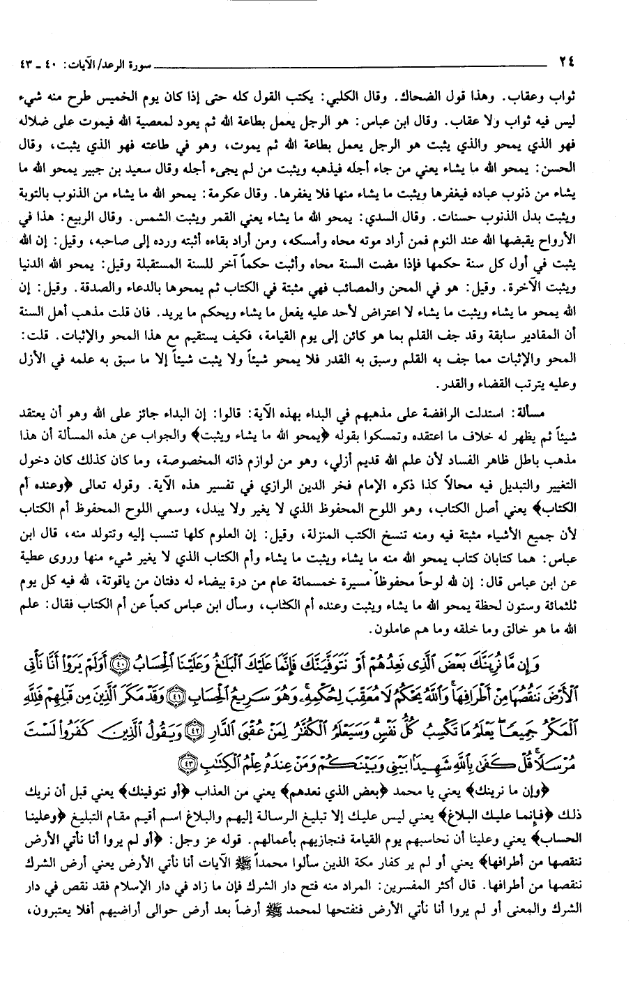 وَإِنْ ما نُرِيَنَّكَ بَعْضَ الَّذِي نَعِدُهُمْ أَوْ نَتَوَفَّيَنَّكَ فَإِنَّما عَلَيْكَ الْبَلاغُ وَعَلَيْنَا الْحِسابُ (40) أَوَلَمْ يَرَوْا أَنَّا نَأْتِي الْأَرْضَ نَنْقُصُها مِنْ أَطْرافِها وَاللَّهُ يَحْكُمُ لا مُعَقِّبَ لِحُكْمِهِ وَهُوَ سَرِيعُ الْحِسابِ (41) وَقَدْ مَكَرَ الَّذِينَ مِنْ قَبْلِهِمْ فَلِلَّهِ الْمَكْرُ جَمِيعاً يَعْلَمُ ما تَكْسِبُ كُلُّ نَفْسٍ وَسَيَعْلَمُ الْكُفَّارُ لِمَنْ عُقْبَى الدَّارِ (42) وَيَقُولُ الَّذِينَ كَفَرُوا لَسْتَ مُرْسَلاً قُلْ كَفى بِاللَّهِ شَهِيداً بَيْنِي وَبَيْنَكُمْ وَمَنْ عِنْدَهُ عِلْمُ الْكِتابِ (43)