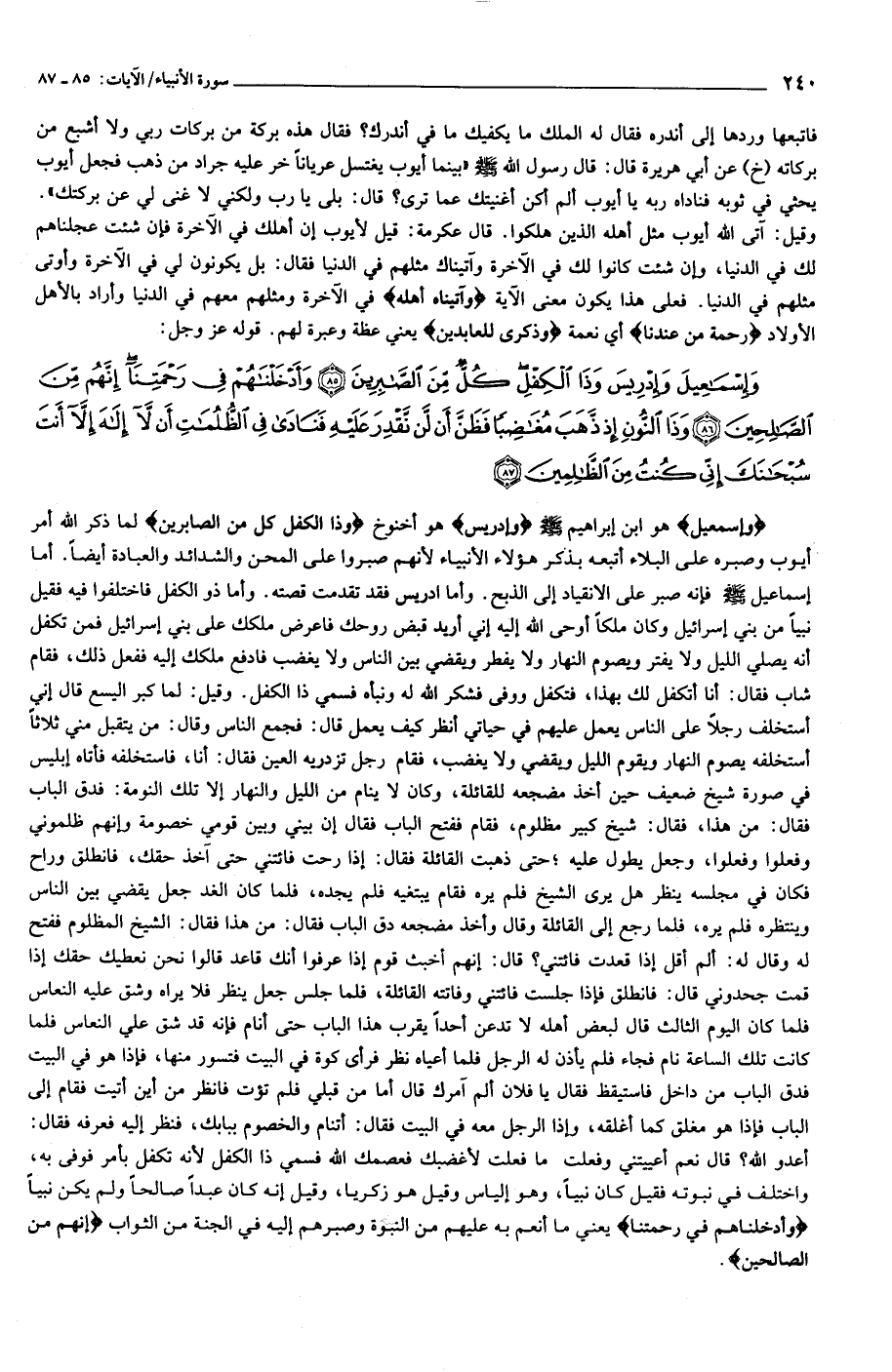 وَإِسْماعِيلَ هو ابن إبراهيم صلّى الله عليه وسلّم وَإِدْرِيسَ هو أخنوخ وَذَا الْكِفْلِ كُلٌّ مِنَ الصَّابِرِينَ لما ذكر الله أمر أيوب وصبره على البلاء أتبعه بذكر هؤلاء الأنبياء لأنهم صبروا على المحن والشدائد والعبادة أيضا. أما إسماعيل صلّى الله عليه وسلّم فإنه صبر على الانقياد إلى الذبح. وأما إدريس فقد تقدمت قصته. وأما ذو الكفل فاختلفوا فيه فقيل نبيا من بني إسرائيل وكان ملكا أوحى الله إليه إني أريد قبض روحك فاعرض ملكك على بني إسرائيل فمن تكفل أنه يصلي الليل ولا يفتر ويصوم النهار ولا يفطر ويقضي بين الناس ولا يغضب فادفع ملكك إليه ففعل ذلك، فقام شاب فقال: أنا أتكفل لك بهذا، فتكفل ووفى فشكر الله له ونبأه فسمي ذا الكفل. وقيل: لما كبر اليسع قال إني أستخلف رجلا على الناس يعمل عليهم في حياتي أنظر كيف يعمل قال: فجمع الناس وقال: من يتقبل مني ثلاثا أستخلفه يصوم النهار ويقوم الليل ويقضي ولا يغضب، فقام رجل تزدريه العين فقال: أنا، فاستخلفه فأتاه إبليس في صورة شيخ ضعيف حين أخذ مضجعه للقائلة، وكان لا ينام من الليل والنهار إلا تلك النومة: فدق الباب فقال: من هذا، فقال: شيخ كبير مظلوم، فقام ففتح الباب فقال إن بيني وبين قومي خصومة وإنهم ظلموني وفعلوا وفعلوا، وجعل يطول عليه حتى ذهبت القائلة فقال: إذا رحت فائتني حتى آخذ حقك، فانطلق وراح فكان في مجلسه ينظر هل يرى الشيخ فلم يره فقام يبتغيه فلم يجده، فلما كان الغد جعل يقضي بين الناس وينتظره فلم يره، فلما رجع إلى القائلة وقال وأخذ مضجعه دق الباب فقال: من هذا فقال: الشيخ المظلوم ففتح له وقال له: ألم أقل إذا قعدت فائتني؟ قال: إنهم أخبث قوم إذا عرفوا أنك قاعد قالوا نحن نعطيك حقك إذا قمت جحدوني قال: فانطلق فإذا جلست فائتني وفاتته القائلة، فلما جلس جعل ينظر فلا يراه وشق عليه النعاس فلما كان اليوم الثالث قال لبعض أهله لا تدعن أحدا يقرب هذا الباب حتى أنام فإنه قد شق علي النعاس فلما كانت تلك الساعة نام فجاء فلم يأذن له الرجل فلما أعياه نظر فرأى كوة في البيت فتسور منها، فإذا هو في البيت فدق الباب من داخل فاستيقظ فقال يا فلان ألم آمرك قال أما من قبلي فلم تؤت فانظر من أين أتيت فقام إلى الباب فإذا هو مغلق كما أغلقه، وإذا الرجل معه في البيت فقال: أتنام والخصوم ببابك، فنظر إليه فعرفه فقال: