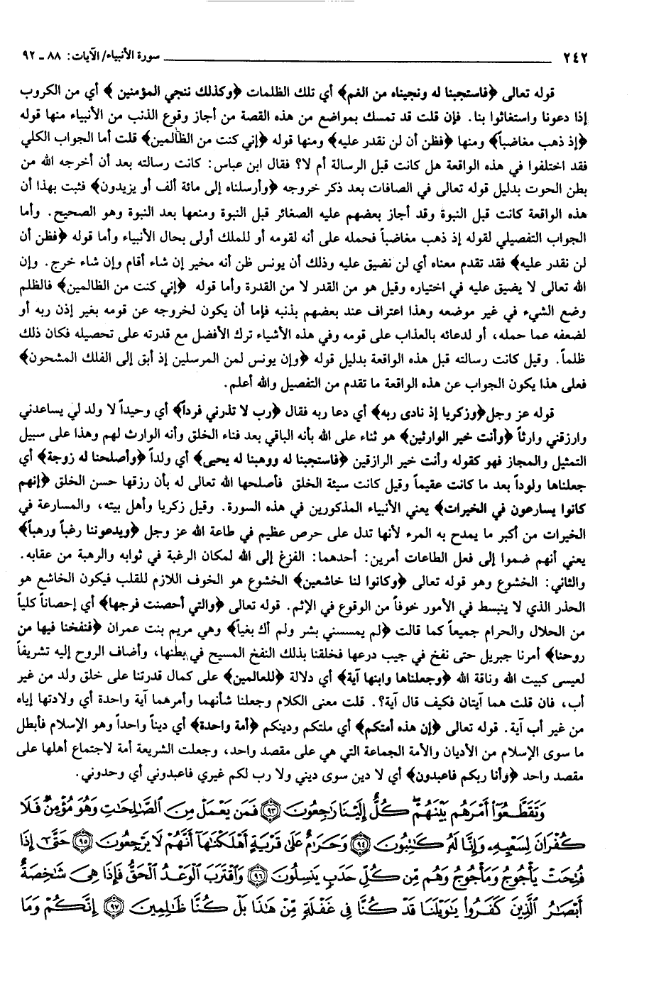 والثاني: الخشوع وهو قوله تعالى وَكانُوا لَنا خاشِعِينَ الخشوع هو الخوف اللازم للقلب فيكون الخاشع هو الحذر الذي لا ينبسط في الأمور خوفا من الوقوع في الإثم. قوله تعالى وَالَّتِي أَحْصَنَتْ فَرْجَها أي إحصانا كليا من الحلال والحرام جميعا كما قالت لَمْ يَمْسَسْنِي بَشَرٌ وَلَمْ أَكُ بَغِيًّا وهي مريم بنت عمران فَنَفَخْنا فِيها مِنْ رُوحِنا أمرنا جبريل حتى نفخ في جيب درعها فخلقنا بذلك النفخ المسيح في بطنها، وأضاف الروح إليه تشريفا لعيسى كبيت الله وناقة الله وَجَعَلْناها وَابْنَها آيَةً أي دلالة لِلْعالَمِينَ على كمال قدرتنا على خلق ولد من غير أب، فان قلت هما آيتان فكيف قال آية؟. قلت معنى الكلام وجعلنا شأنهما وأمرهما آية واحدة أي ولادتها إياه من غير أب آية. قوله تعالى إِنَّ هذِهِ أُمَّتُكُمْ أي ملتكم ودينكم أُمَّةً واحِدَةً أي دينا واحدا وهو الإسلام فأبطل ما سوى الإسلام من الأديان والأمة الجماعة التي هي على مقصد واحد، وجعلت الشريعة أمة لاجتماع أهلها على مقصد واحد وَأَنَا رَبُّكُمْ فَاعْبُدُونِ أي لا دين سوى ديني ولا رب لكم غيري فاعبدوني أي وحدوني.