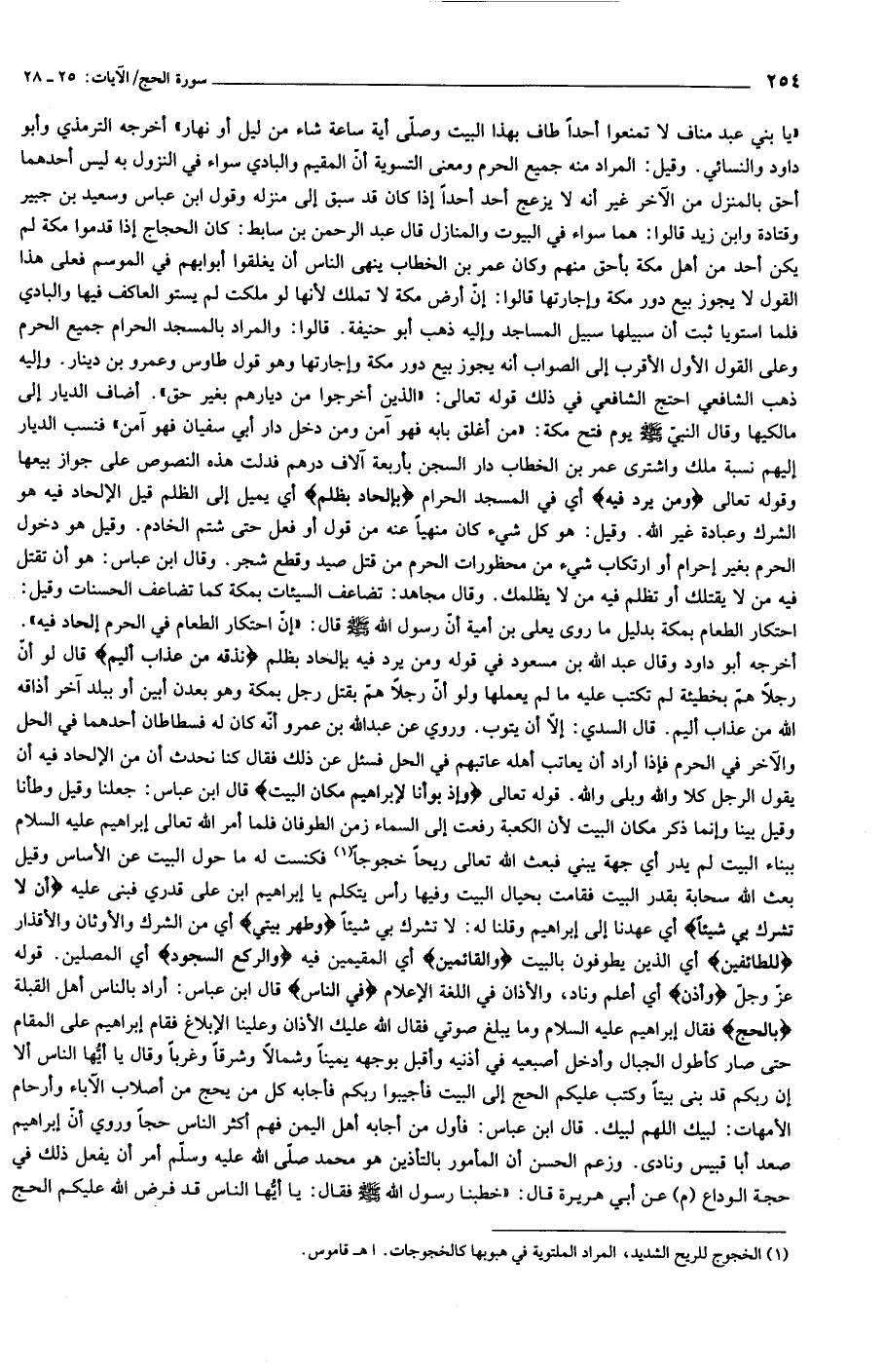 «يا بني عبد مناف لا تمنعوا أحدا طاف بهذا البيت وصلّى أية ساعة شاء من ليل أو نهار» أخرجه الترمذي وأبو داود والنسائي. وقيل: المراد منه جميع الحرم ومعنى التسوية أنّ المقيم والبادي سواء في النزول به ليس أحدهما أحق بالمنزل من الآخر غير أنه لا يزعج أحد أحدا إذا كان قد سبق إلى منزله وقول ابن عباس وسعيد بن جبير وقتادة وابن زيد قالوا: هما سواء في البيوت والمنازل قال عبد الرحمن بن سابط: كان الحجاج إذا قدموا مكة لم يكن أحد من أهل مكة بأحق منهم وكان عمر بن الخطاب ينهى الناس أن يغلقوا أبوابهم في الموسم فعلى هذا القول لا يجوز بيع دور مكة وإجارتها قالوا: إنّ أرض مكة لا تملك لأنها لو ملكت لم يستو العاكف فيها والبادي فلما استويا ثبت أن سبيلها سبيل المساجد وإليه ذهب أبو حنيفة. قالوا: والمراد بالمسجد الحرام جميع الحرم وعلى القول الأول الأقرب إلى الصواب أنه يجوز بيع دور مكة وإجارتها وهو قول طاوس وعمرو بن دينار. وإليه ذهب الشافعي احتج الشافعي في ذلك قوله تعالى: «الذين أخرجوا من ديارهم بغير حق». أضاف الديار إلى مالكيها وقال النبيّ صلّى الله عليه وسلّم يوم فتح مكة: «من أغلق بابه فهو آمن ومن دخل دار أبي سفيان فهو آمن» فنسب الديار إليهم نسبة ملك واشترى عمر بن الخطاب دار السجن بأربعة آلاف درهم فدلت هذه النصوص على جواز بيعها وقوله تعالى وَمَنْ يُرِدْ فِيهِ أي في المسجد الحرام بِإِلْحادٍ بِظُلْمٍ أي يميل إلى الظلم قيل الإلحاد فيه هو الشرك وعبادة غير الله. وقيل: هو كل شيء كان منهيا عنه من قول أو فعل حتى شتم الخادم. وقيل هو دخول الحرم بغير إحرام أو ارتكاب شيء من محظورات الحرم من قتل صيد وقطع شجر. وقال ابن عباس: هو أن تقتل فيه من لا يقتلك أو تظلم فيه من لا يظلمك. وقال مجاهد: تضاعف السيئات بمكة كما تضاعف الحسنات وقيل: