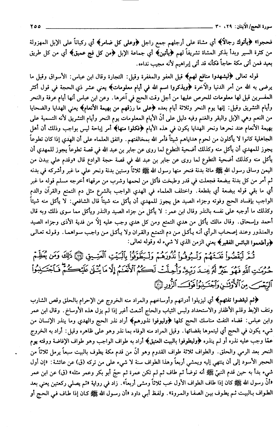 ثُمَّ لْيَقْضُوا تَفَثَهُمْ وَلْيُوفُوا نُذُورَهُمْ وَلْيَطَّوَّفُوا بِالْبَيْتِ الْعَتِيقِ (29) ذلِكَ وَمَنْ يُعَظِّمْ حُرُماتِ اللَّهِ فَهُوَ خَيْرٌ لَهُ عِنْدَ رَبِّهِ وَأُحِلَّتْ لَكُمُ الْأَنْعامُ إِلاَّ ما يُتْلى عَلَيْكُمْ فَاجْتَنِبُوا الرِّجْسَ مِنَ الْأَوْثانِ وَاجْتَنِبُوا قَوْلَ الزُّورِ (30)