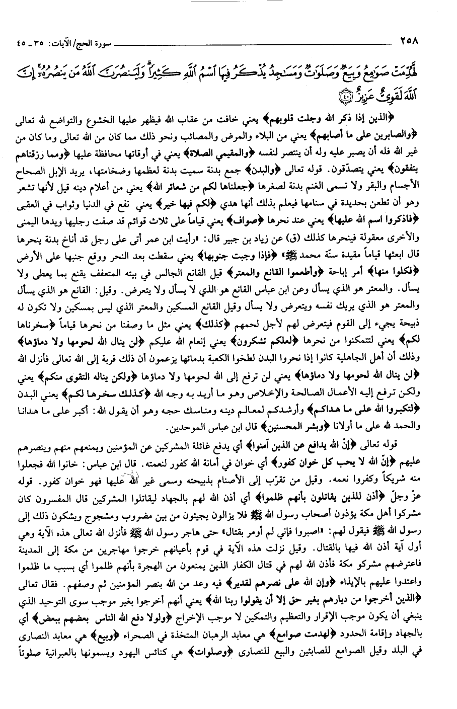 الَّذِينَ إِذا ذُكِرَ اللَّهُ وَجِلَتْ قُلُوبُهُمْ يعني خافت من عقاب الله فيظهر عليها الخشوع والتواضع لله تعالى وَالصَّابِرِينَ عَلى ما أَصابَهُمْ يعني من البلاء والمرض والمصائب ونحو ذلك مما كان من الله تعالى وما كان من غير الله فله أن يصبر عليه وله أن ينتصر لنفسه وَالْمُقِيمِي الصَّلاةِ يعني في أوقاتها محافظة عليها وَمِمَّا رَزَقْناهُمْ يُنْفِقُونَ يعني يتصدّقون. قوله تعالى وَالْبُدْنَ جمع بدنة سميت بدنة لعظمها وضخامتها، يريد الإبل الصحاح الأجسام والبقر ولا تسمى الغنم بدنة لصغرها جَعَلْناها لَكُمْ مِنْ شَعائِرِ اللَّهِ يعني من أعلام دينه قيل لأنها تشعر وهو أن تطعن بحديدة في سنامها فيعلم بذلك أنها هدي لَكُمْ فِيها خَيْرٌ يعني نفع في الدنيا وثواب في العقبى فَاذْكُرُوا اسْمَ اللَّهِ عَلَيْها يعني عند نحرها صَوافَّ يعني قياما على ثلاث قوائم قد صفت رجليها ويدها اليمنى والأخرى معقولة فينحرها كذلك (ق) عن زياد بن جبير قال: «رأيت ابن عمر أتى على رجل قد أناخ بدنة ينحرها قال ابعثها قياما مقيدة سنّة محمد صلّى الله عليه وسلّم» فَإِذا وَجَبَتْ جُنُوبُها يعني سقطت بعد النحر ووقع جنبها على الأرض فَكُلُوا مِنْها أمر إباحة وَأَطْعِمُوا الْقانِعَ وَالْمُعْتَرَّ قيل القانع الجالس في بيته المتعفف يقنع بما يعطى ولا يسأل. والمعتر هو الذي يسأل وعن ابن عباس القانع هو الذي لا يسأل ولا يتعرض. وقيل: القانع هو الذي يسأل والمعتر هو الذي يريك نفسه ويتعرض ولا يسأل وقيل القانع المسكين والمعتر الذي ليس بمسكين ولا تكون له ذبيحة يجيء إلى القوم فيتعرض لهم لأجل لحمهم كَذلِكَ يعني مثل ما وصفنا من نحرها قياما سَخَّرْناها لَكُمْ يعني لتتمكنوا من نحرها لَعَلَّكُمْ تَشْكُرُونَ يعني إنعام الله عليكم لَنْ يَنالَ اللَّهَ لُحُومُها وَلا دِماؤُها وذلك أن أهل الجاهلية كانوا إذا نحروا البدن لطخوا الكعبة بدمائها يزعمون أن ذلك قربة إلى الله تعالى فأنزل الله لَنْ يَنالَ اللَّهَ لُحُومُها وَلا دِماؤُها يعني لن ترفع إلى الله لحومها ولا دماؤها وَلكِنْ يَنالُهُ التَّقْوى مِنْكُمْ يعني ولكن ترفع إليه الأعمال الصالحة والإخلاص وهو ما أريد به وجه الله كَذلِكَ سَخَّرَها لَكُمْ يعني البدن لِتُكَبِّرُوا اللَّهَ عَلى ما هَداكُمْ وأرشدكم لمعالم دينه ومناسك حجه وهو أن يقول الله: أكبر على ما هدانا والحمد لله على ما أولانا وَبَشِّرِ الْمُحْسِنِينَ قال ابن عباس الموحدين.