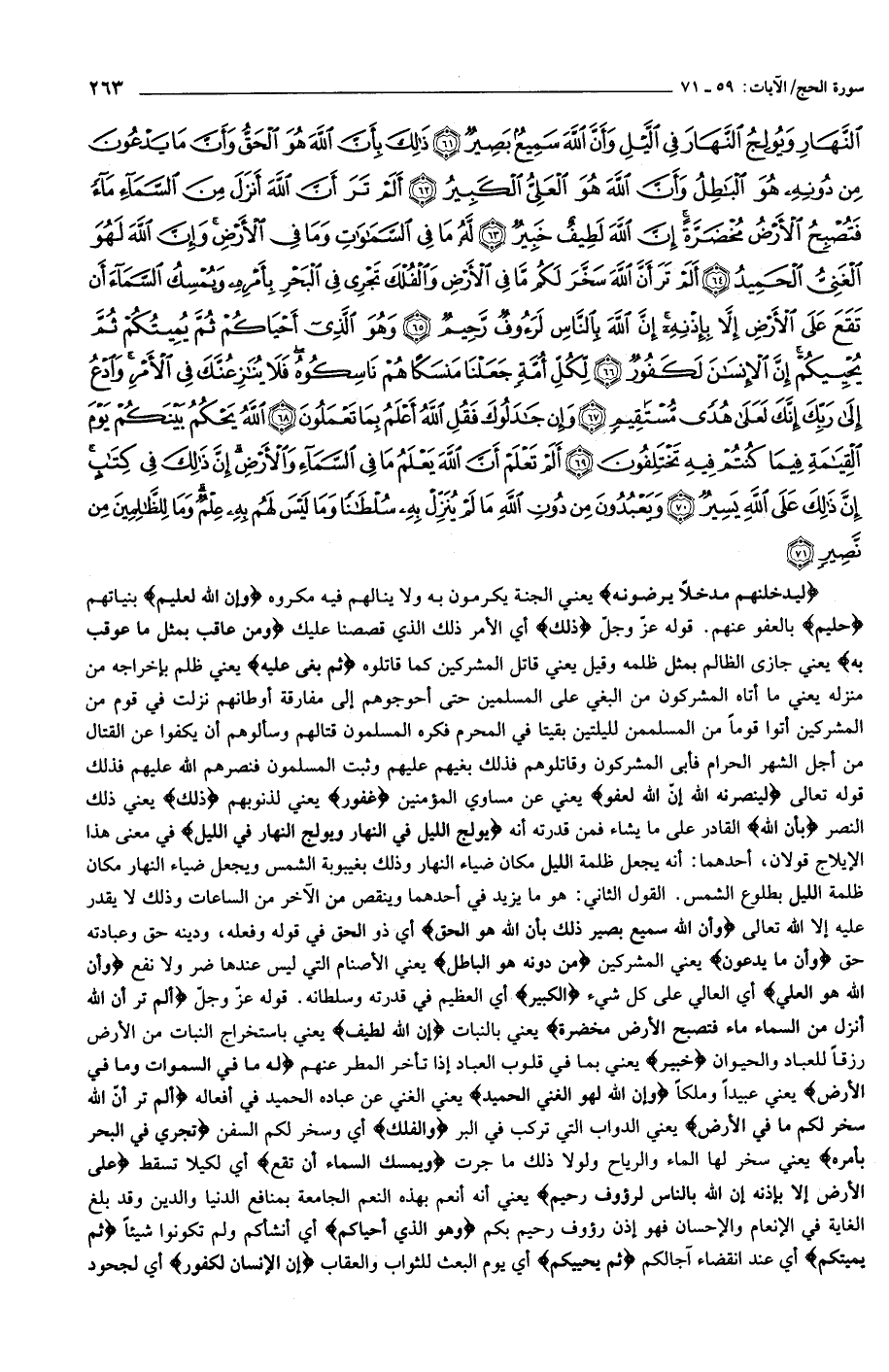 يعني جازى الظالم بمثل ظلمه وقيل يعني قاتل المشركين كما قاتلوه ثُمَّ بُغِيَ عَلَيْهِ يعني ظلم بإخراجه من منزله يعني ما أتاه المشركون من البغي على المسلمين حتى أحوجوهم إلى مفارقة أوطانهم نزلت في قوم من المشركين أتوا قوما من المسلمين لليلتين بقيتا في المحرم فكره المسلمون قتالهم وسألوهم أن يكفوا عن القتال من أجل الشهر الحرام فأبى المشركون وقاتلوهم فذلك بغيهم عليهم وثبت المسلمون فنصرهم الله عليهم فذلك قوله تعالى لَيَنْصُرَنَّهُ اللَّهُ إِنَّ اللَّهَ لَعَفُوٌّ يعني عن مساوي المؤمنين غَفُورٌ يعني لذنوبهم ذلِكَ يعني ذلك النصر بِأَنَّ اللَّهَ القادر على ما يشاء فمن قدرته أنه يُولِجُ اللَّيْلَ فِي النَّهارِ وَيُولِجُ النَّهارَ فِي اللَّيْلِ في معنى هذا الإيلاج قولان، أحدهما: أنه يجعل ظلمة الليل مكان ضياء النهار وذلك بغيبوبة الشمس ويجعل ضياء النهار مكان ظلمة الليل بطلوع الشمس. القول الثاني: هو ما يزيد في أحدهما وينقص من الآخر من الساعات وذلك لا يقدر عليه إلا الله تعالى وَأَنَّ اللَّهَ سَمِيعٌ بَصِيرٌ ذلِكَ بِأَنَّ اللَّهَ هُوَ الْحَقُّ أي ذو الحق في قوله وفعله، ودينه حق وعبادته حق وَأَنَّ ما يَدْعُونَ يعني المشركين مِنْ دُونِهِ هُوَ الْباطِلُ يعني الأصنام التي ليس عندها ضر ولا نفع وَأَنَّ اللَّهَ هُوَ الْعَلِيُّ أي العالي على كل شيء الْكَبِيرُ أي العظيم في قدرته وسلطانه. قوله عزّ وجلّ أَلَمْ تَرَ أَنَّ اللَّهَ أَنْزَلَ مِنَ السَّماءِ ماءً فَتُصْبِحُ الْأَرْضُ مُخْضَرَّةً يعني بالنبات إِنَّ اللَّهَ لَطِيفٌ يعني باستخراج النبات من الأرض رزقا للعباد والحيوان خَبِيرٌ يعني بما في قلوب العباد إذا تأخر المطر عنهم لَهُ ما فِي السَّماواتِ وَما فِي الْأَرْضِ يعني عبيدا وملكا وَإِنَّ اللَّهَ لَهُوَ الْغَنِيُّ الْحَمِيدُ يعني الغني عن عباده الحميد في أفعاله أَلَمْ تَرَ أَنَّ اللَّهَ سَخَّرَ لَكُمْ ما فِي الْأَرْضِ يعني الدواب التي تركب في البر وَالْفُلْكَ أي وسخر لكم السفن تَجْرِي فِي الْبَحْرِ بِأَمْرِهِ يعني سخر لها الماء والرياح ولولا ذلك ما جرت وَيُمْسِكُ السَّماءَ أَنْ تَقَعَ أي لكيلا تسقط عَلَى الْأَرْضِ إِلَّا بِإِذْنِهِ إِنَّ اللَّهَ بِالنَّاسِ لَرَؤُفٌ رَحِيمٌ يعني أنه أنعم بهذه النعم الجامعة بمنافع الدنيا والدين وقد بلغ الغاية في الإنعام والإحسان فهو إذن رؤوف رحيم بكم وَهُوَ الَّذِي أَحْياكُمْ أي أنشأكم ولم تكونوا شيئا ثُمَّ يُمِيتُكُمْ أي عند انقضاء آجالكم ثُمَّ يُحْيِيكُمْ أي يوم البعث للثواب والعقاب إِنَّ الْإِنْسانَ لَكَفُورٌ أي لجحود