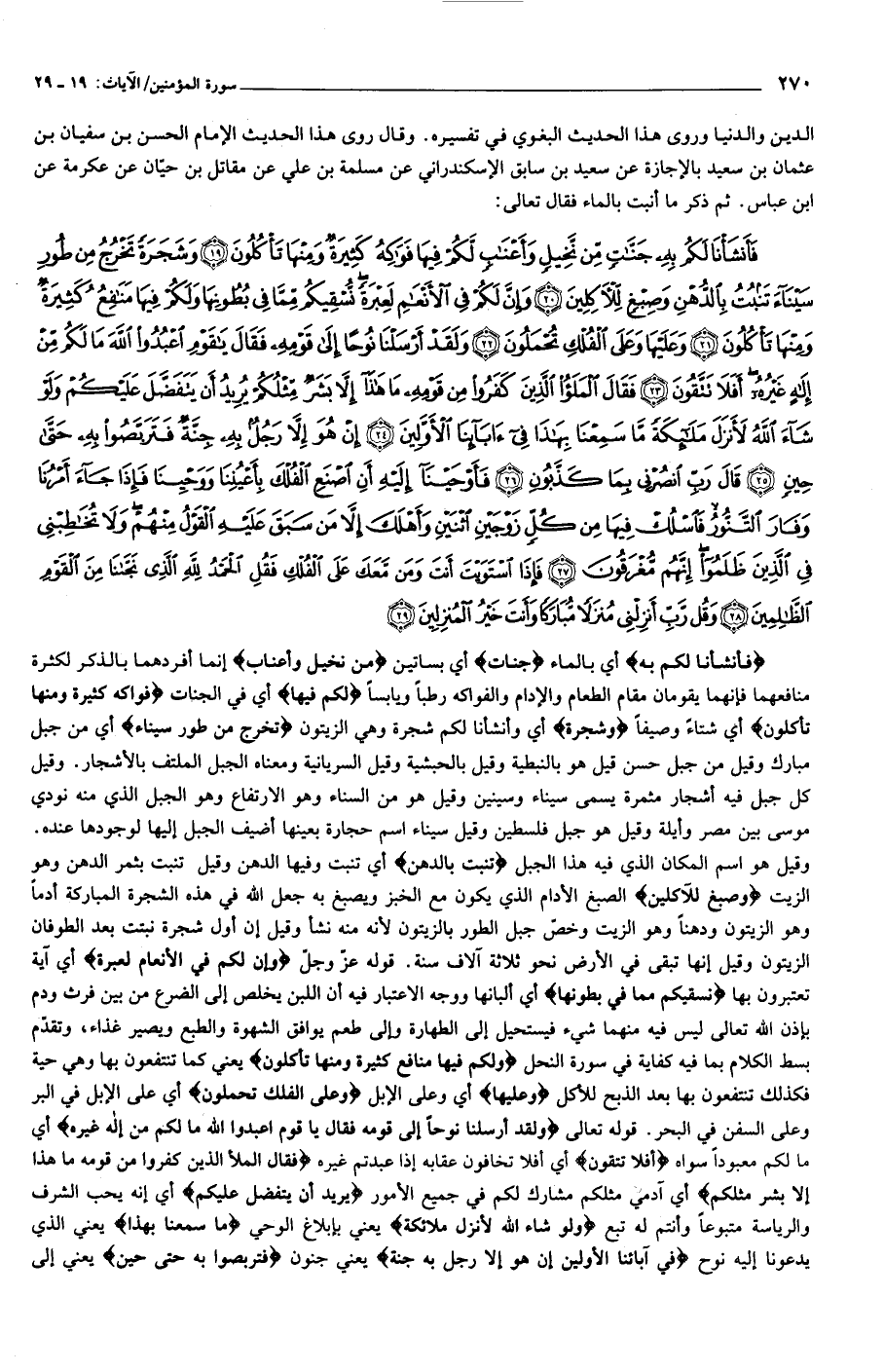 فَأَنْشَأْنا لَكُمْ بِهِ جَنَّاتٍ مِنْ نَخِيلٍ وَأَعْنابٍ لَكُمْ فِيها فَواكِهُ كَثِيرَةٌ وَمِنْها تَأْكُلُونَ (19) وَشَجَرَةً تَخْرُجُ مِنْ طُورِ سَيْناءَ تَنْبُتُ بِالدُّهْنِ وَصِبْغٍ لِلْآكِلِينَ (20) وَإِنَّ لَكُمْ فِي الْأَنْعامِ لَعِبْرَةً نُسْقِيكُمْ مِمَّا فِي بُطُونِها وَلَكُمْ فِيها مَنافِعُ كَثِيرَةٌ وَمِنْها تَأْكُلُونَ (21) وَعَلَيْها وَعَلَى الْفُلْكِ تُحْمَلُونَ (22) وَلَقَدْ أَرْسَلْنا نُوحاً إِلى قَوْمِهِ فَقالَ يا قَوْمِ اعْبُدُوا اللَّهَ ما لَكُمْ مِنْ إِلهٍ غَيْرُهُ أَفَلا تَتَّقُونَ (23)