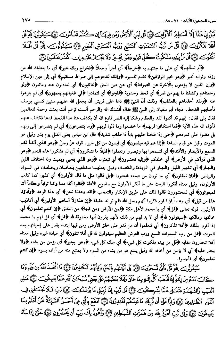 أَمْ تَسْأَلُهُمْ أي على ما جئتهم به خَرْجاً أي أجرا وجعلا فَخَراجُ رَبِّكَ خَيْرٌ أي ما يعطيك الله من رزقه وثوابه خير وَهُوَ خَيْرُ الرَّازِقِينَ تقدم تفسيره وَإِنَّكَ لَتَدْعُوهُمْ إِلى صِراطٍ مُسْتَقِيمٍ أي إلى دين الإسلام وَإِنَّ الَّذِينَ لا يُؤْمِنُونَ بِالْآخِرَةِ عَنِ الصِّراطِ أي عن دين الحق لَناكِبُونَ أي لعادلون عنه ومائلون وَلَوْ رَحِمْناهُمْ وَكَشَفْنا ما بِهِمْ مِنْ ضُرٍّ أي قحط وجدوبة لَلَجُّوا أي لتمادوا فِي طُغْيانِهِمْ يَعْمَهُونَ أي لم ينزعوا عنه وَلَقَدْ أَخَذْناهُمْ بِالْعَذابِ وذلك أنّ النبيّ صلّى الله عليه وسلّم دعا على قريش أن يجعل الله عليهم سنين كسني يوسف فأصابهم القحط. فجاء أبو سفيان إلى النبيّ صلّى الله عليه وسلّم فقال أنشدك الله والرحم ألست تزعم أنك بعثت رحمة للعالمين فقال بلى فقال: إنهم قد أكلوا القد والعظام وشكا إليه الضر فادع الله أن يكشف عنا هذا القحط فدعا فكشف عنهم فأنزل الله هذه الآية فَمَا اسْتَكانُوا لِرَبِّهِمْ ما خضعوا وما ذلوا لربهم وَما يَتَضَرَّعُونَ أي لم يتضرعوا إلى ربهم بل مضوا على تمردهم حَتَّى إِذا فَتَحْنا عَلَيْهِمْ باباً ذا عَذابٍ شَدِيدٍ قال ابن عباس يعني القتل يوم بدر وقيل هو الموت وقيل هو قيام الساعة إِذا هُمْ فِيهِ مُبْلِسُونَ أي آيسون من كل خير. قوله عزّ وجلّ وَهُوَ الَّذِي أَنْشَأَ لَكُمُ السَّمْعَ وَالْأَبْصارَ وَالْأَفْئِدَةَ أي لتسمعوا بها وتبصروا وتعقلوا قَلِيلًا ما تَشْكُرُونَ أي لم تشكروا هذه النعم وَهُوَ الَّذِي ذَرَأَكُمْ فِي الْأَرْضِ أي خلقكم وَإِلَيْهِ تُحْشَرُونَ أي تبعثون وَهُوَ الَّذِي يُحْيِي وَيُمِيتُ وَلَهُ اخْتِلافُ اللَّيْلِ وَالنَّهارِ أي تدبير الليل والنهار في الزيادة والنقصان وقيل جعلهما مختلفين يتعاقبان ويختلفان في السواد والبياض أَفَلا تَعْقِلُونَ أي ما ترون من صنعه فتعتبروا بَلْ قالُوا مِثْلَ ما قالَ الْأَوَّلُونَ أي كذبوا كما كذب الأولون، وقيل معناه أنكروا البعث مثل ما أنكر الأولون مع وضوح الأدلة قالُوا أَإِذا مِتْنا وَكُنَّا تُراباً وَعِظاماً أَإِنَّا لَمَبْعُوثُونَ أي لمحشورون قالوا ذلك على طريق الإنكار والتعجب لَقَدْ وُعِدْنا نَحْنُ أي هذا الوعد وَآباؤُنا هذا مِنْ قَبْلُ أي وعد آباؤنا قوم ذكروا أنهم رسل الله فلم نر له حقيقة إِنْ هذا إِلَّا أَساطِيرُ الْأَوَّلِينَ أي أكاذيب الأولين. قوله تعالى قُلْ أي يا محمد لأهل مكة لِمَنِ الْأَرْضُ وَمَنْ فِيها من الخلق إِنْ كُنْتُمْ تَعْلَمُونَ أي خالقها ومالكها سَيَقُولُونَ لِلَّهِ أي لا بد لهم من ذلك لأنهم يقرون أنها مخلوقة لله قُلْ أي قل لهم يا محمد إذا أقروا بذلك أَفَلا تَذَكَّرُونَ أي فتعلموا أن من قدر على خلق الأرض ومن فيها ابتداء يقدر على إحيائهم بعد الموت قُلْ مَنْ رَبُّ السَّماواتِ السَّبْعِ وَرَبُّ الْعَرْشِ الْعَظِيمِ سَيَقُولُونَ لِلَّهِ قُلْ أَفَلا تَتَّقُونَ أي عبادة غيره وقيل معناه أفلا تحذرون عقابه قُلْ مَنْ بِيَدِهِ مَلَكُوتُ كُلِّ شَيْءٍ أي ملك كل شيء وَهُوَ يُجِيرُ أي يؤمن من يشاء وَلا يُجارُ عَلَيْهِ أي لا يؤمن من أخافه الله وقيل يمنع هو من يشاء من السوء ولا يمتنع منه من أراده بسوء إِنْ كُنْتُمْ تَعْلَمُونَ أي فأجيبوا.