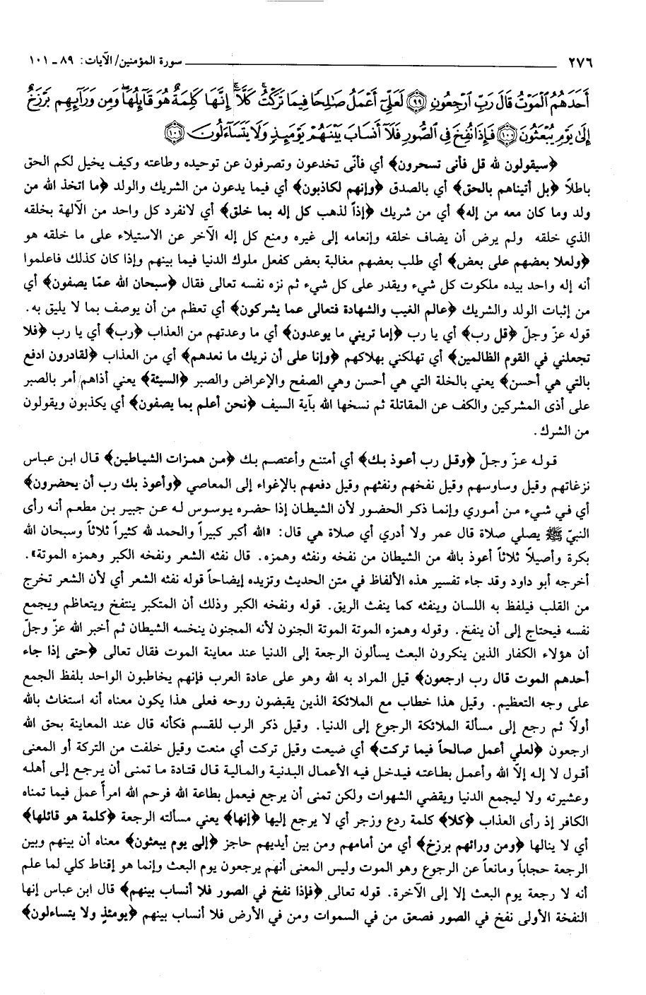 أخرجه أبو داود وقد جاء تفسير هذه الألفاظ في متن الحديث وتزيده إيضاحا قوله نفثه الشعر أي لأن الشعر تخرج من القلب فيلفظ به اللسان وينفثه كما ينفث الريق. قوله ونفخه الكبر وذلك أن المتكبر ينتفخ ويتعاظم ويجمع نفسه فيحتاج إلى أن ينفخ. وقوله وهمزه الموتة الموتة الجنون لأنه المجنون ينخسه الشيطان ثم أخبر الله عزّ وجلّ أن هؤلاء الكفار الذين ينكرون البعث يسألون الرجعة إلى الدنيا عند معاينة الموت فقال تعالى حَتَّى إِذا جاءَ أَحَدَهُمُ الْمَوْتُ قالَ رَبِّ ارْجِعُونِ قيل المراد به الله وهو على عادة العرب فإنهم يخاطبون الواحد بلفظ الجمع على وجه التعظيم. وقيل هذا خطاب مع الملائكة الذين يقبضون روحه فعلى هذا يكون معناه أنه استغاث بالله أولا ثم رجع إلى مسألة الملائكة الرجوع إلى الدنيا. وقيل ذكر الرب للقسم فكأنه قال عند المعاينة بحق الله ارجعون لَعَلِّي أَعْمَلُ صالِحاً فِيما تَرَكْتُ أي ضيعت وقيل تركت أي منعت وقيل خلفت من التركة أو المعنى أقول لا إله إلّا الله وأعمل بطاعته فيدخل فيه الأعمال البدنية والمالية قال قتادة ما تمنى أن يرجع إلى أهله وعشيرته ولا ليجمع الدنيا ويقضي الشهوات ولكن تمنى أن يرجع فيعمل بطاعة الله فرحم الله امرأ عمل فيما تمناه الكافر إذ رأى العذاب كَلَّا كلمة ردع وزجر أي لا يرجع إليها إِنَّها يعني مسألته الرجعة كَلِمَةٌ هُوَ قائِلُها أي لا ينالها وَمِنْ وَرائِهِمْ بَرْزَخٌ أي من أمامهم ومن بين أيديهم حاجز إِلى يَوْمِ يُبْعَثُونَ معناه أن بينهم وبين الرجعة حجابا ومانعا عن الرجوع وهو الموت وليس المعنى أنهم يرجعون يوم البعث وإنما هو إقناط كلي لما علم أنه لا رجعة يوم البعث إلا إلى الآخرة. قوله تعالى فَإِذا نُفِخَ فِي الصُّورِ فَلا أَنْسابَ بَيْنَهُمْ قال ابن عباس إنها النفخة الأولى نفخ في الصور فصعق من في السموات ومن في الأرض فلا أنساب بينهم يَوْمَئِذٍ وَلا يَتَساءَلُونَ