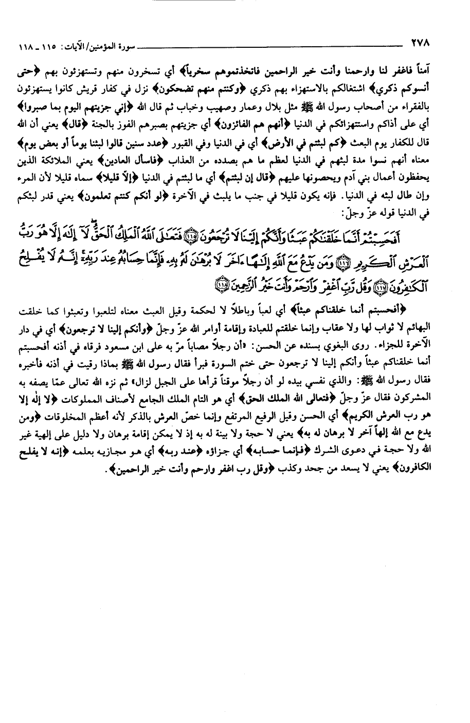 أَفَحَسِبْتُمْ أَنَّما خَلَقْناكُمْ عَبَثاً وَأَنَّكُمْ إِلَيْنا لا تُرْجَعُونَ (115) فَتَعالَى اللَّهُ الْمَلِكُ الْحَقُّ لا إِلهَ إِلاَّ هُوَ رَبُّ الْعَرْشِ الْكَرِيمِ (116) وَمَنْ يَدْعُ مَعَ اللَّهِ إِلهاً آخَرَ لا بُرْهانَ لَهُ بِهِ فَإِنَّما حِسابُهُ عِنْدَ رَبِّهِ إِنَّهُ لا يُفْلِحُ الْكافِرُونَ (117) وَقُلْ رَبِّ اغْفِرْ وَارْحَمْ وَأَنْتَ خَيْرُ الرَّاحِمِينَ (118)