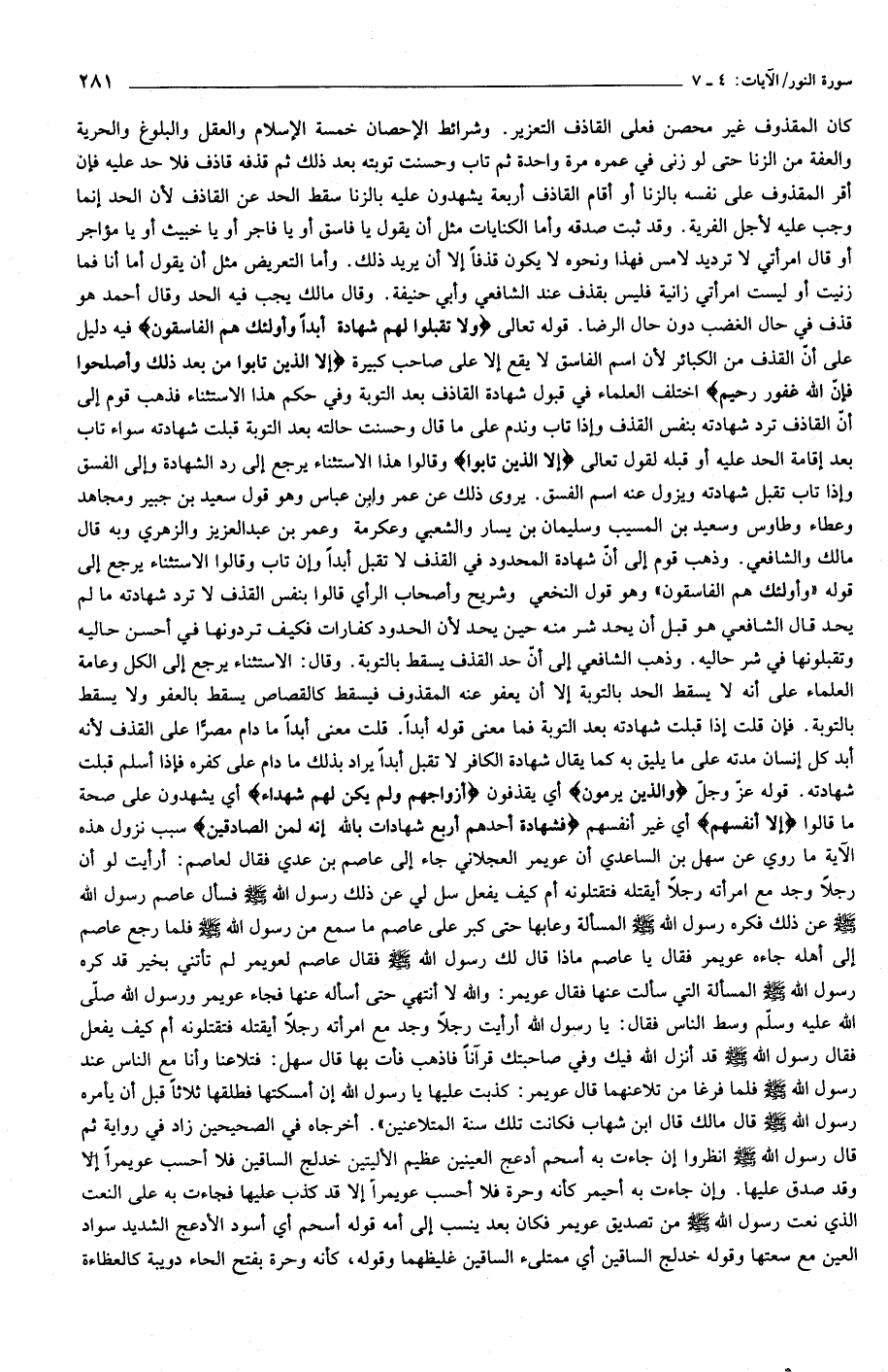 كان المقذوف غير محصن فعلى القاذف التعزير. وشرائط الإحصان خمسة الإسلام والعقل والبلوغ والحرية والعفة من الزنا حتى لو زنى في عمره مرة واحدة ثم تاب وحسنت توبته بعد ذلك ثم قذفه قاذف فلا حد عليه فإن أقر المقذوف على نفسه بالزنا أو أقام القاذف أربعة يشهدون عليه بالزنا سقط الحد عن القاذف لأن الحد إنما وجب عليه لأجل الفرية. وقد ثبت صدقه وأما الكنايات مثل أن يقول يا فاسق أو يا فاجر أو يا خبيث أو يا مؤاجر أو قال امرأتي لا ترديد لا مس فهذا ونحوه لا يكون قذفا إلا أن يريد ذلك. وأما التعريض مثل أن يقول أما أنا فما زنيت أو ليست امرأتي زانية فليس بقذف عند الشافعي وأبي حنيفة. وقال مالك يجب فيه الحد وقال أحمد هو قذف في حال الغضب دون حال الرضا. قوله تعالى وَلا تَقْبَلُوا لَهُمْ شَهادَةً أَبَداً وَأُولئِكَ هُمُ الْفاسِقُونَ فيه دليل على أنّ القذف من الكبائر لأن اسم الفاسق لا يقع إلا على صاحب كبيرة إِلَّا الَّذِينَ تابُوا مِنْ بَعْدِ ذلِكَ وَأَصْلَحُوا فَإِنَّ اللَّهَ غَفُورٌ رَحِيمٌ اختلف العلماء في قبول شهادة القاذف بعد التوبة وفي حكم هذا الاستثناء فذهب قوم إلى أنّ القاذف ترد شهادته بنفس القذف وإذا تاب وندم على ما قال وحسنت حالته بعد التوبة قبلت شهادته سواء تاب بعد إقامة الحد عليه أو قبله لقول تعالى إِلَّا الَّذِينَ تابُوا وقالوا هذا الاستثناء يرجع إلى رد الشهادة وإلى الفسق وإذا تاب تقبل شهادته ويزول عنه اسم الفسق. يروى ذلك عن عمر وابن عباس وهو قول سعيد بن جبير ومجاهد وعطاء وطاوس وسعيد بن المسيب وسليمان بن يسار والشعبي وعكرمة وعمر بن عبد العزيز والزهري وبه قال مالك والشافعي. وذهب قوم إلى أنّ شهادة المحدود في القذف لا تقبل أبدا وإن تاب وقالوا الاستثناء يرجع إلى قوله «وأولئك هم الفاسقون» وهو قول النخعي وشريح وأصحاب الرأي قالوا بنفس القذف لا ترد شهادته ما لم يحد قال الشافعي هو قبل أن يحد شر منه حين يحد لأن الحدود كفارات فكيف تردونها في أحسن حاليه وتقبلونها في شر حاليه. وذهب الشافعي إلى أنّ حد القذف يسقط بالتوبة. وقال: الاستثناء يرجع إلى الكل وعامة العلماء على أنه لا يسقط الحد بالتوبة إلا أن يعفو عنه المقذوف فيسقط كالقصاص يسقط بالعفو ولا يسقط بالتوبة. فإن قلت إذا قبلت شهادته بعد التوبة فما معنى قوله أبدا. قلت معنى أبدا ما دام مصرّا على القذف لأنه أبد كل إنسان مدته على ما يليق به كما يقال شهادة الكافر لا تقبل أبدا يراد بذلك ما دام على كفره فإذا أسلم قبلت شهادته. قوله عزّ وجلّ وَالَّذِينَ يَرْمُونَ أي يقذفون أَزْواجَهُمْ وَلَمْ يَكُنْ لَهُمْ شُهَداءُ أي يشهدون على صحة ما قالوا إِلَّا أَنْفُسُهُمْ أي غير أنفسهم فَشَهادَةُ أَحَدِهِمْ أَرْبَعُ شَهاداتٍ بِاللَّهِ إِنَّهُ لَمِنَ الصَّادِقِينَ سبب نزول هذه الآية ما روي عن سهل بن الساعدي أن عويمر العجلاني جاء إلى عاصم بن عدي فقال لعاصم: أرأيت لو أن رجلا وجد مع امرأته رجلا أيقتله فتقتلونه أم كيف يفعل سل لي عن ذلك رسول الله صلّى الله عليه وسلّم فسأل عاصم رسول الله صلّى الله عليه وسلّم عن ذلك فكره رسول الله صلّى الله عليه وسلّم المسألة وعابها حتى كبر على عاصم ما سمع من رسول الله صلّى الله عليه وسلّم فلما رجع عاصم إلى أهله جاءه عويمر فقال يا عاصم ماذا قال لك رسول الله صلّى الله عليه وسلّم فقال عاصم لعويمر لم تأتني بخير قد كره رسول الله صلّى الله عليه وسلّم المسألة التي سألت عنها فقال عويمر: والله لا أنتهي حتى أسأله عنها فجاء عويمر ورسول الله صلّى الله عليه وسلّم وسط الناس فقال: يا رسول الله أرأيت رجلا وجد مع امرأته رجلا أيقتله فتقتلونه أم كيف يفعل فقال رسول الله صلّى الله عليه وسلّم قد أنزل الله فيك وفي صاحبتك قرآنا فاذهب فأت بها قال سهل: فتلاعنا وأنا مع الناس عند رسول الله صلّى الله عليه وسلّم فلما فرغا من تلاعنهما قال عويمر: كذبت عليها يا رسول الله إن أمسكتها فطلقها ثلاثا قبل أن يأمره رسول الله صلّى الله عليه وسلّم قال مالك قال