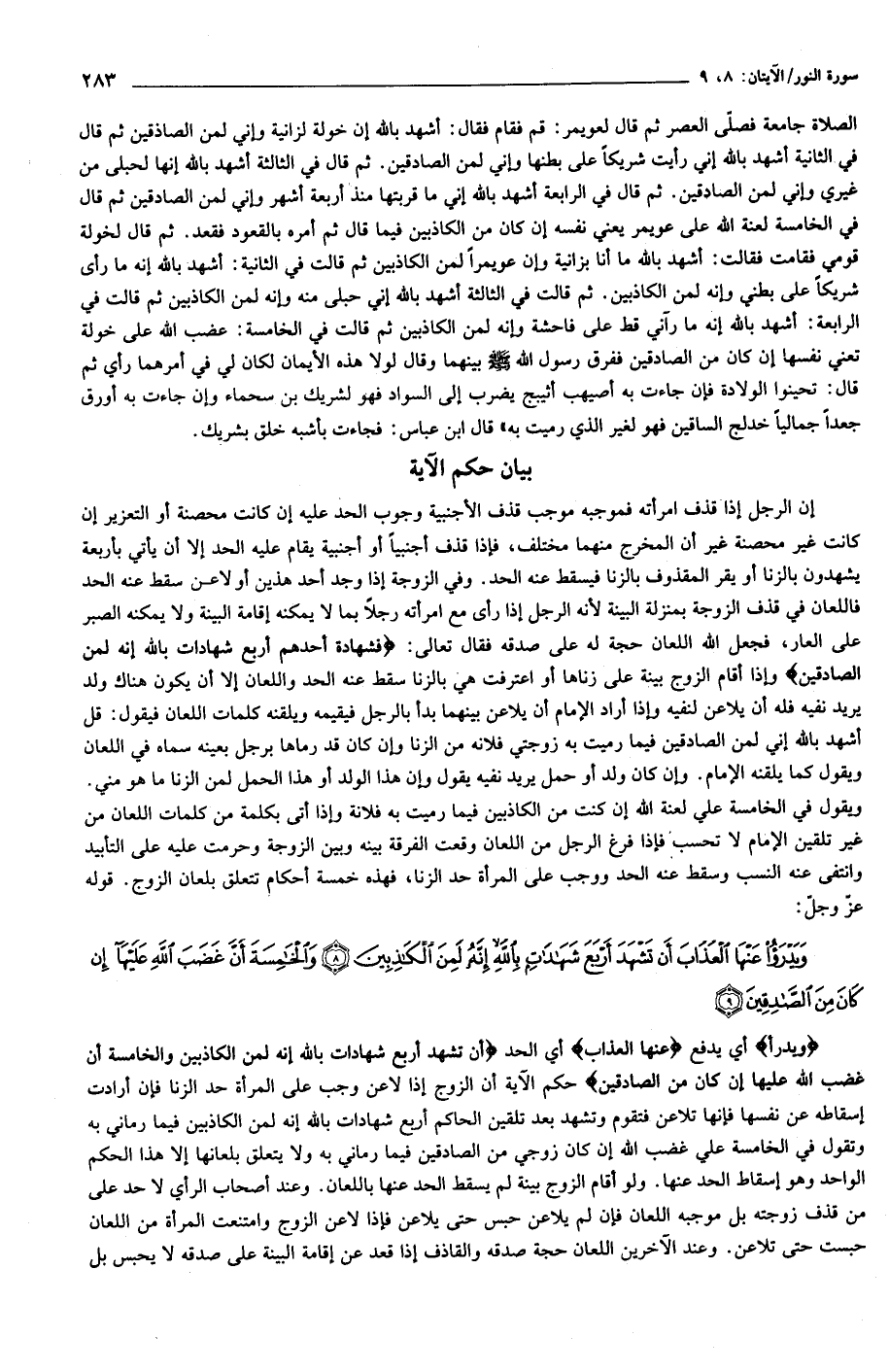 وَيَدْرَؤُا أي يدفع عَنْهَا الْعَذابَ أي الحد أَنْ تَشْهَدَ أَرْبَعَ شَهاداتٍ بِاللَّهِ إِنَّهُ لَمِنَ الْكاذِبِينَ وَالْخامِسَةَ أَنَّ غَضَبَ اللَّهِ عَلَيْها إِنْ كانَ مِنَ الصَّادِقِينَ حكم الآية أن الزوج إذا لاعن وجب على المرأة حد الزنا فإن أرادت إسقاطه عن نفسها فإنها تلاعن فتقوم وتشهد بعد تلقين الحاكم أربع شهادات بالله إنه لمن الكاذبين فيما رماني به وتقول في الخامسة علي غضب الله إن كان زوجي من الصادقين فيما رماني به ولا يتعلق بلعانها إلا هذا الحكم الواحد وهو إسقاط الحد عنها. ولو أقام الزوج بينة لم يسقط الحد عنها باللعان. وعند أصحاب الرأي لا حد على من قذف زوجته بل موجبه اللعان فإن لم يلاعن حبس حتى يلاعن فإذا لاعن الزوج وامتنعت المرأة من اللعان حبست حتى تلاعن. وعند الآخرين اللعان حجة صدقه والقاذف إذا قعد عن إقامة البينة على صدقه لا يحبس بل